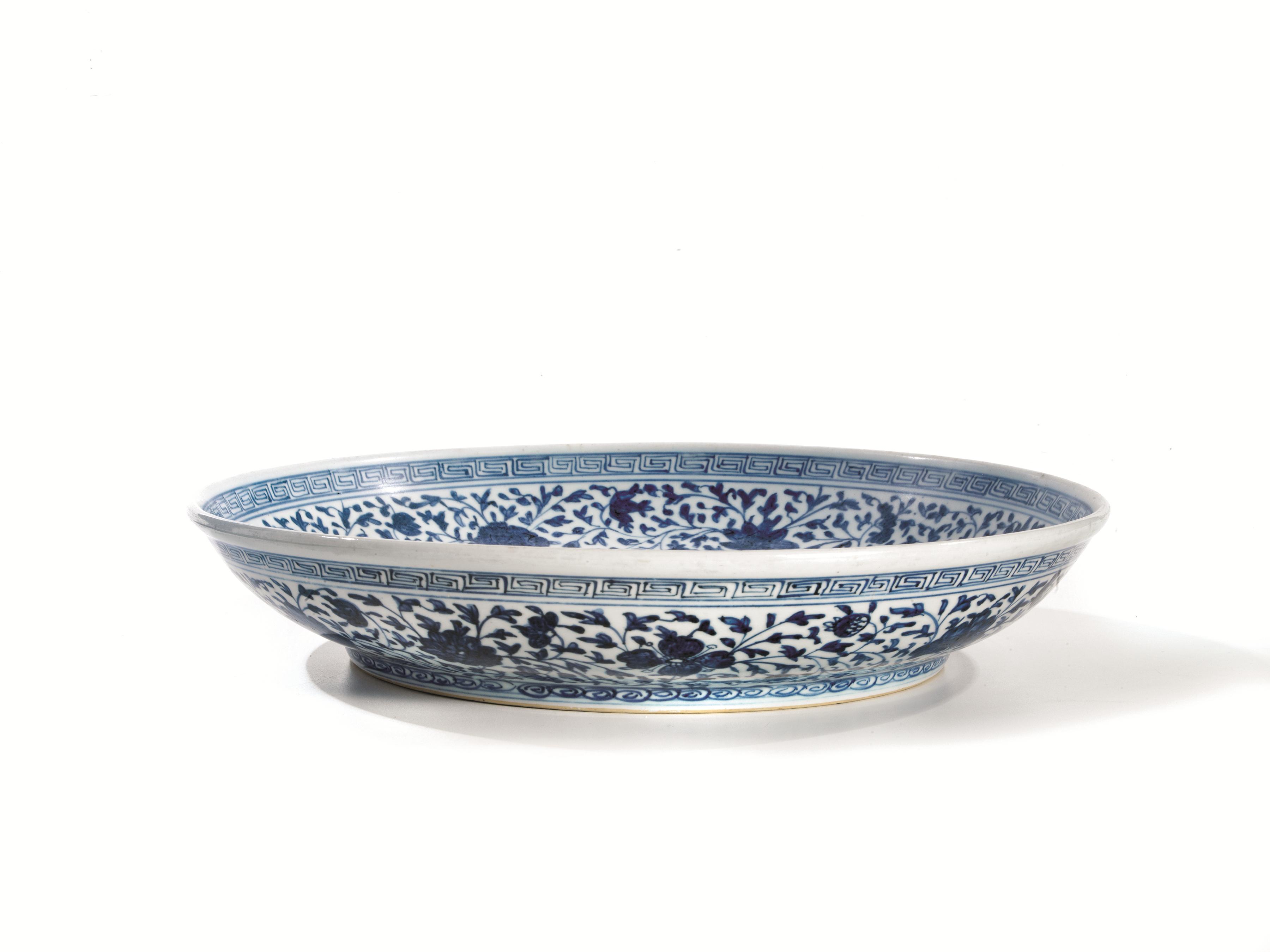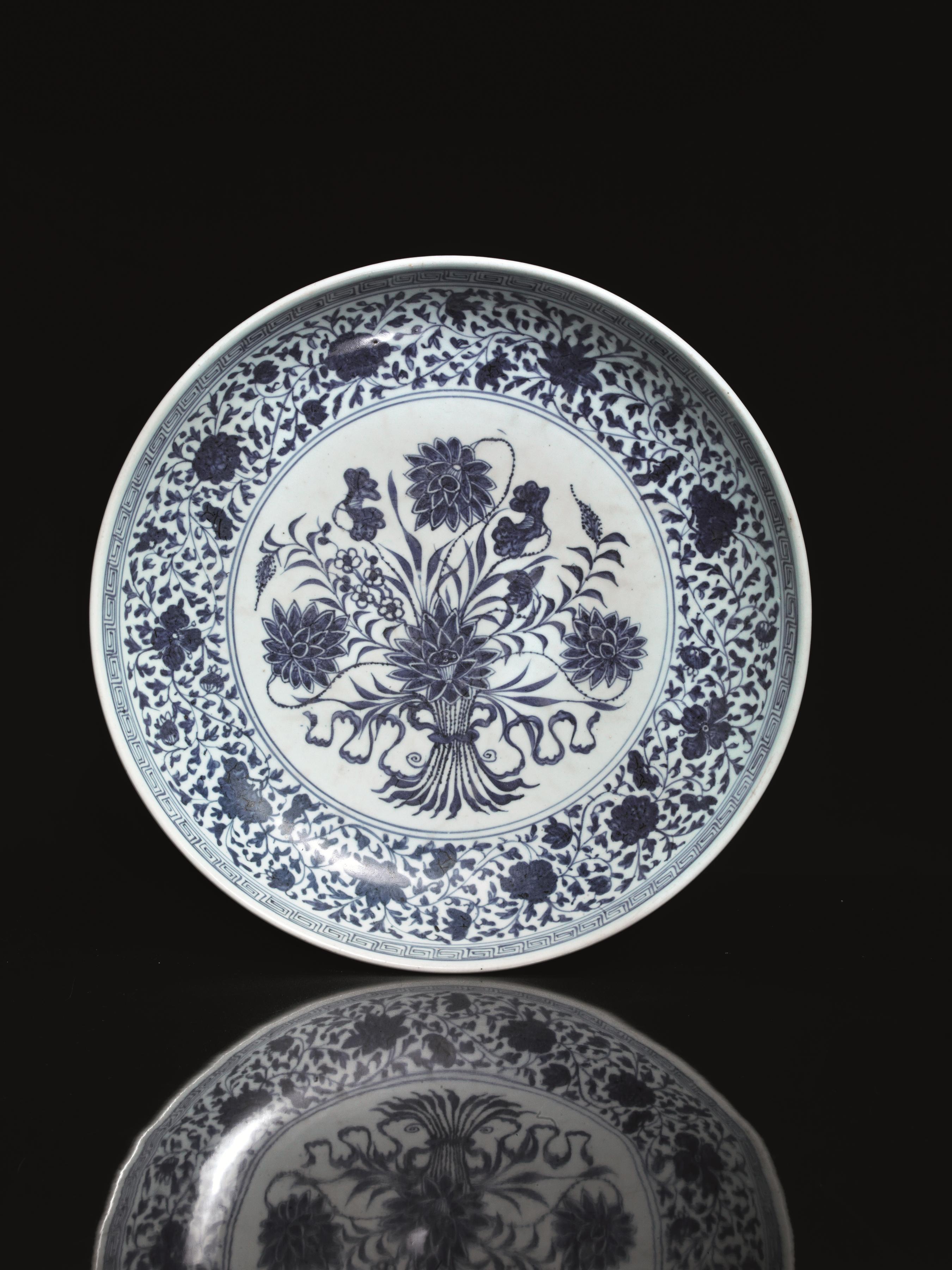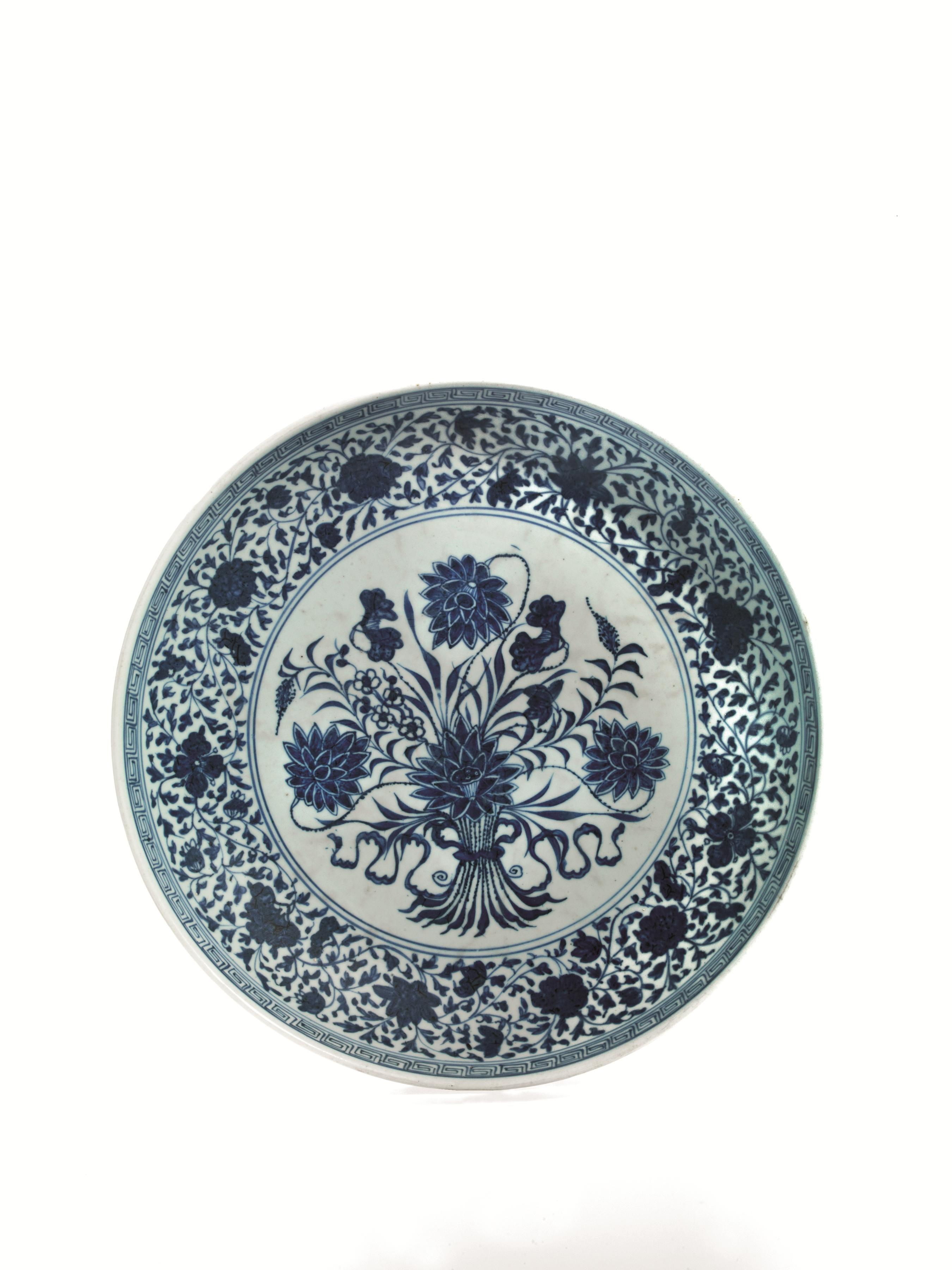A MING-STYLE BLUE AND WHITE "LOTUS BOUQUET" PORCELAIN DISH, QING DYNASTY,