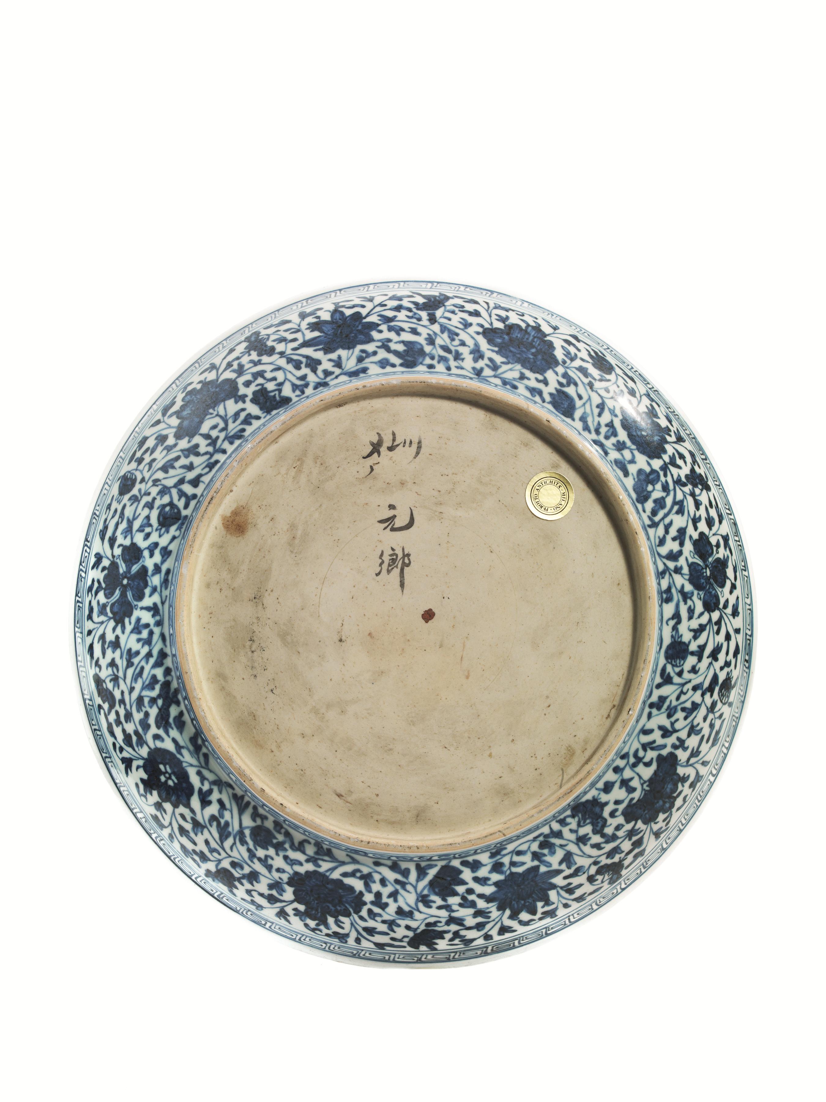 in porcellana bianca e blu, decorato all'interno con un bouquet di fior di loto, i bordi interni ed esterni del piatto decorati con racemi fioriti, e l' orlo