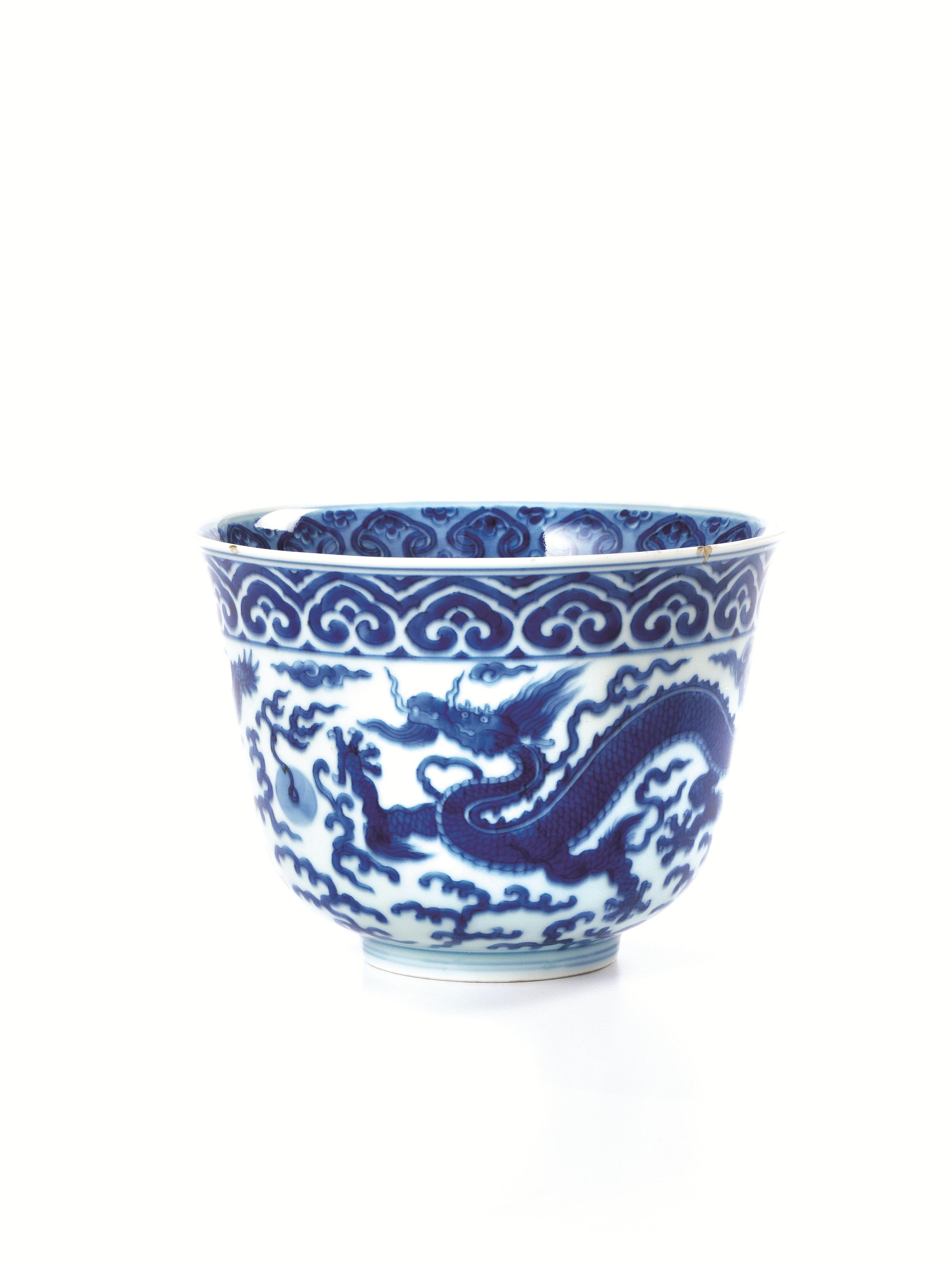 in porcellana bianca e blu decorata con draghi che si rincorrono all'esterno e all'interno un'altro drago
