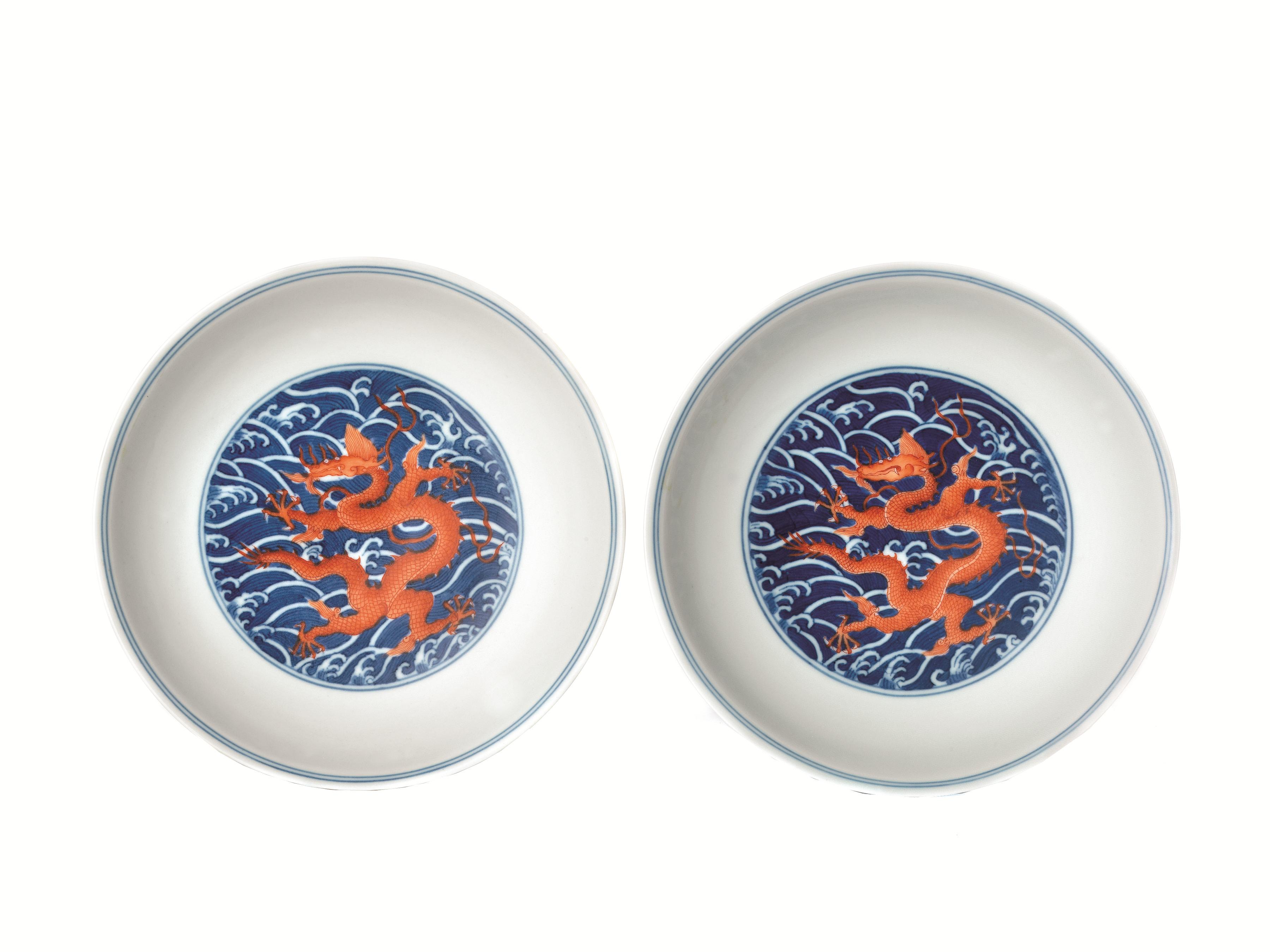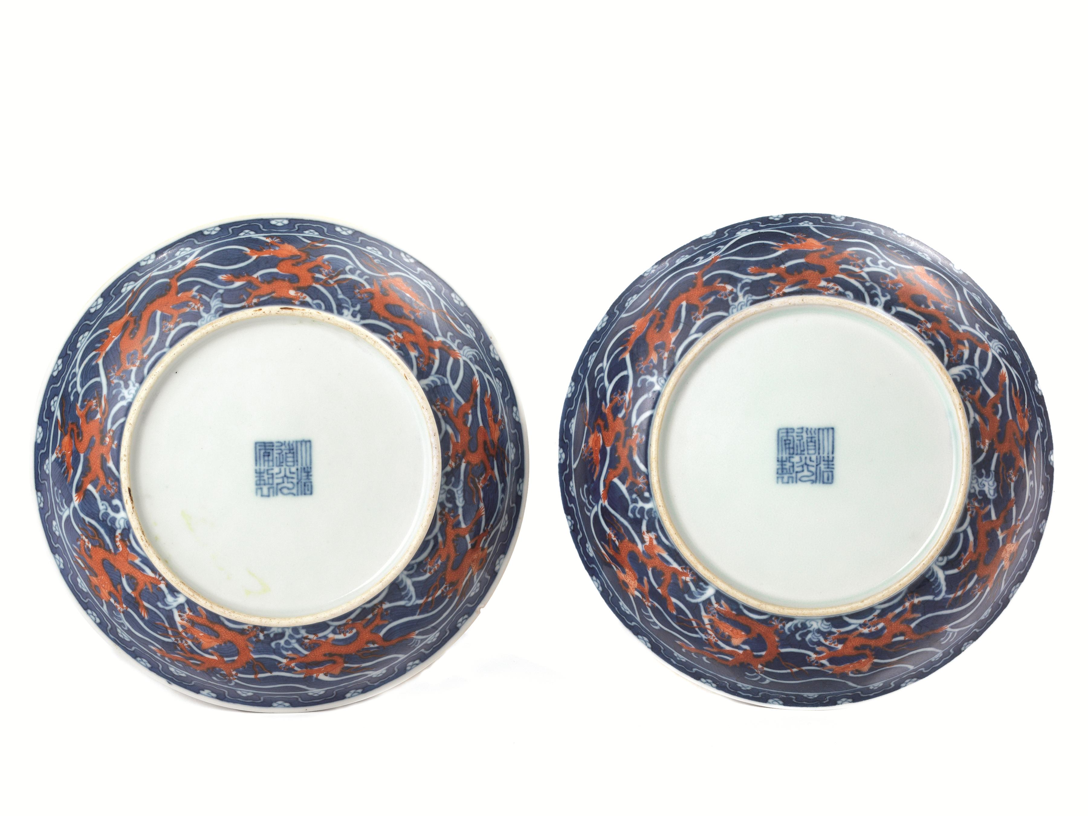 A PAIR OF IRON RED DRAGON PORCELAIN PLATE, QING DYNASTY TAO KUANG MARK AND PERIOD