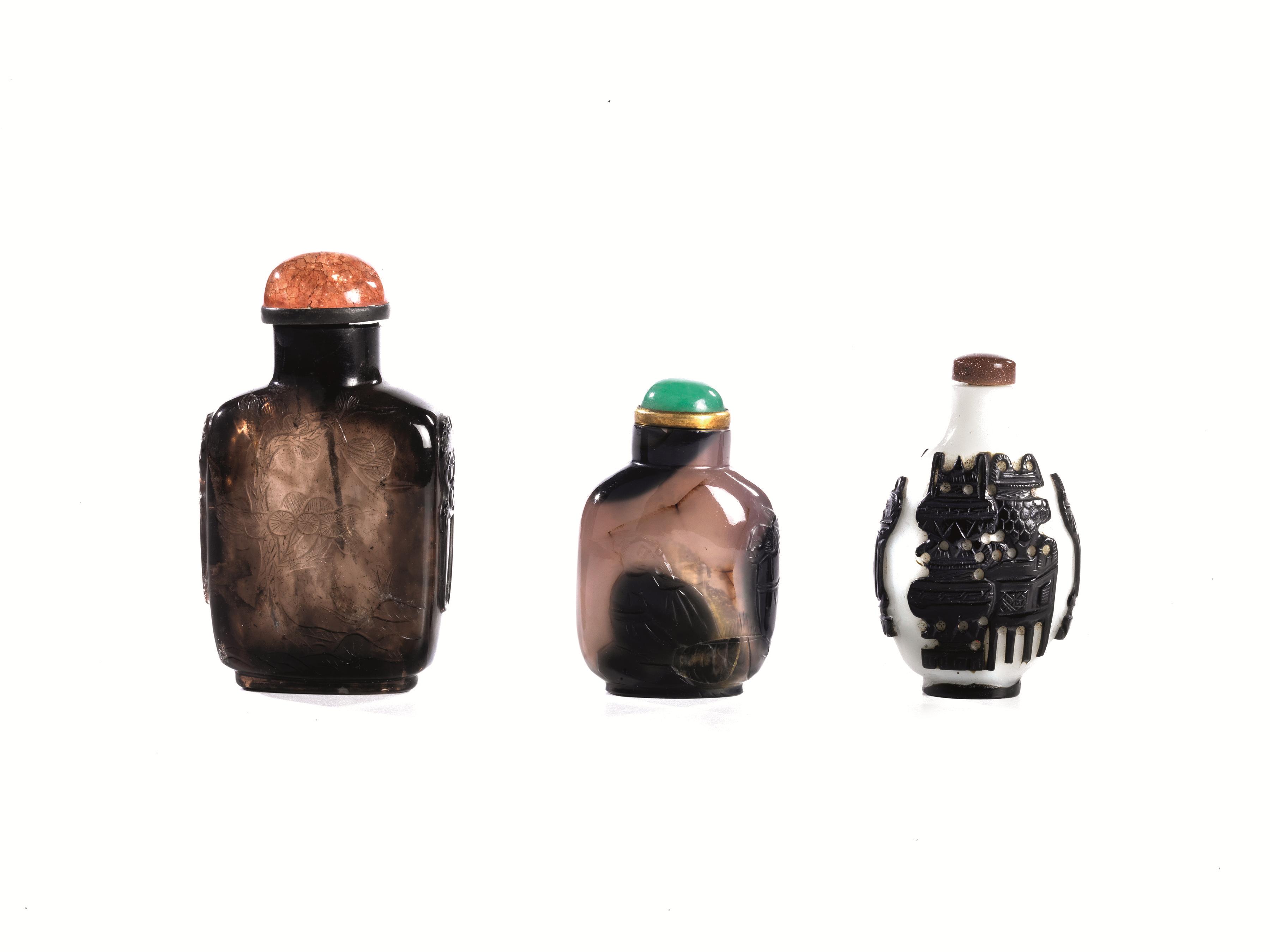 TRE SNUFF BOTTLE CINA SEC. XIX-XXagata, quarzo fumé e vetro...