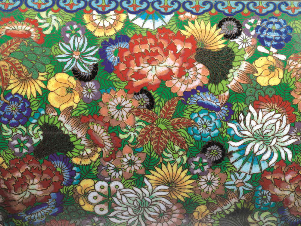 in metallo cloisonné, con decori floreali, prese modellate nella forma di pipistrello, alt. cm 49