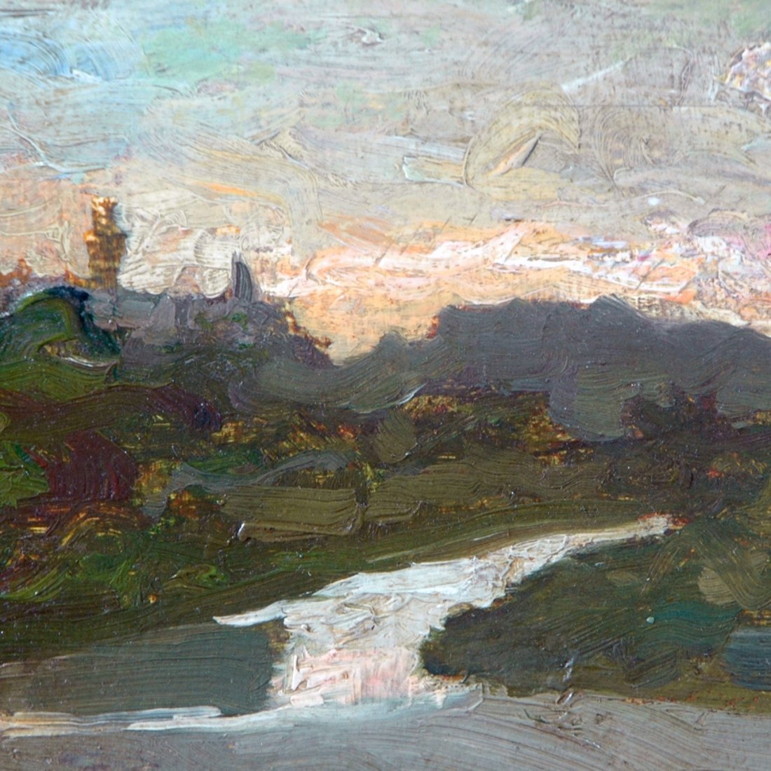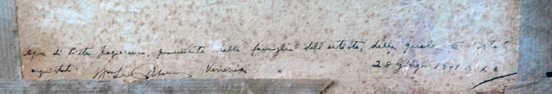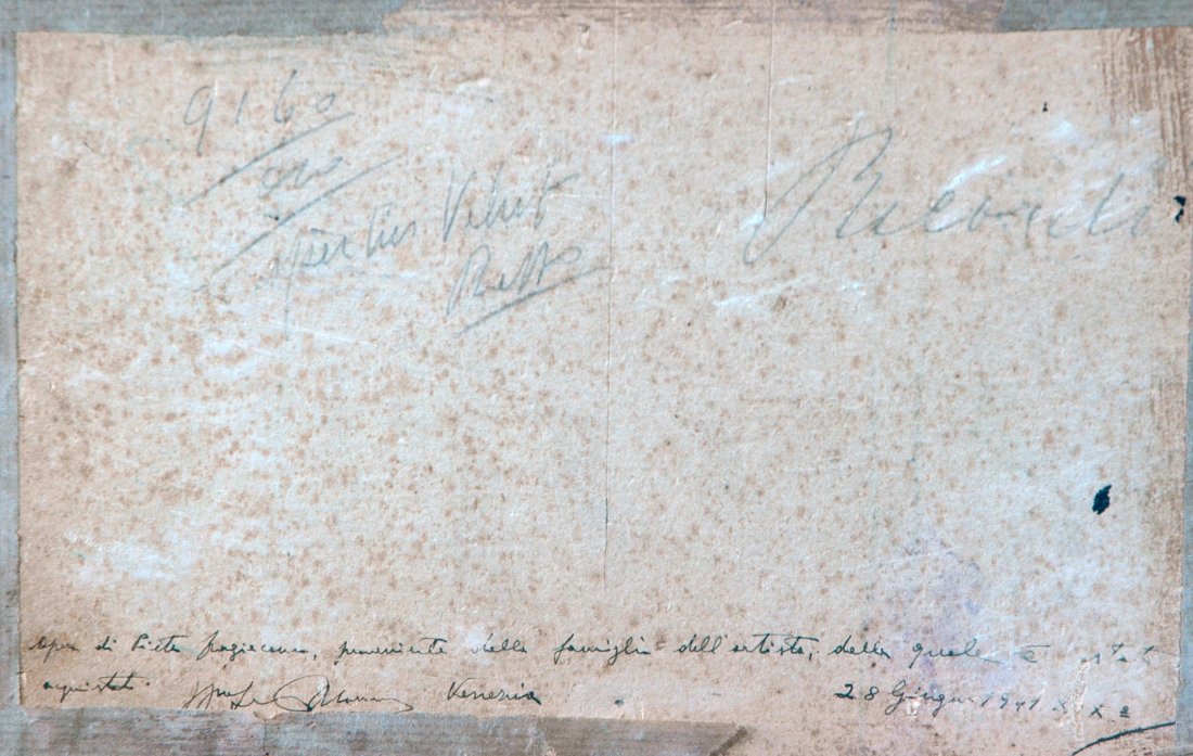 Firmato P. Fragiacomo in basso a destra. Autentica sul retro del dipinto Opera di Pietro Fragiacomo, proveniente dalla famiglia dell'artista, dalla quale è stato acquistato. Venezia, 28 giugno 1941 (firma non identificata).