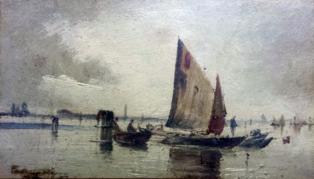 PIETRO FRAGIACOMO(Trieste 1856 - Venezia 1922)Pescatori in lagunaOlio su...