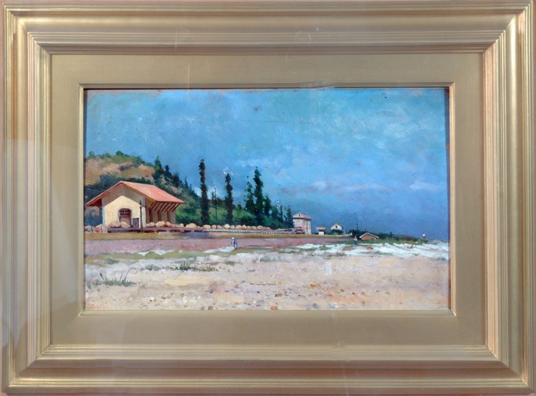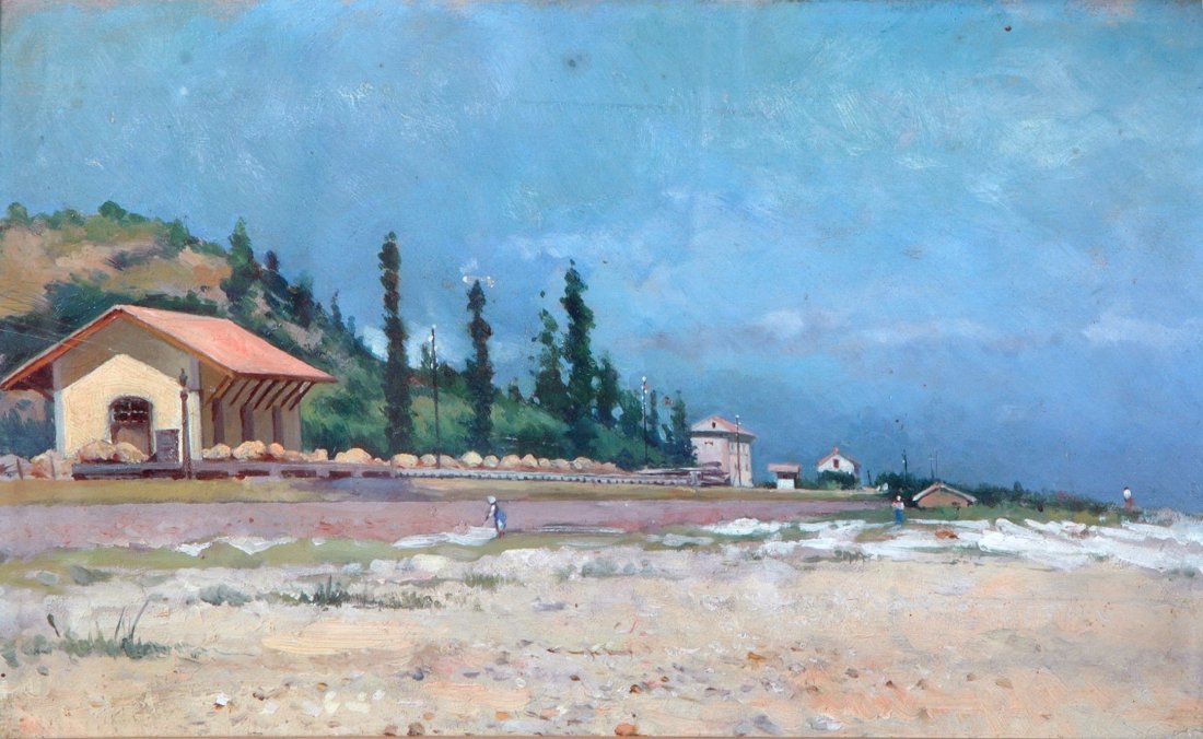 Proveniente dalla raccolta di Mario Galli, la tavola raffigura il piccolo magazzino merci della stazione di Ardenza, ora dismessa. Si trova nel tratto compreso tra la stazione di Livorno Centrale e quella di Antignano: all'epoca in cui Gambogi lo ritrae, il quartiere livornese non era ancora stato inglobato dalla città, sebbene la zona fosse stata oggetto di un crescente interesse sin dalla prima metà dell'Ottocento, quando qui furono costruite alcune strutture per il turismo balneare. La costruzione della stazione risale al 1910, quando fu completata la tratta costiera tra Livorno e Vada della ferrovia Tirrenica, e questo ci permette di fissare questa data come termine post quem per la collocazione temporale del dipinto.