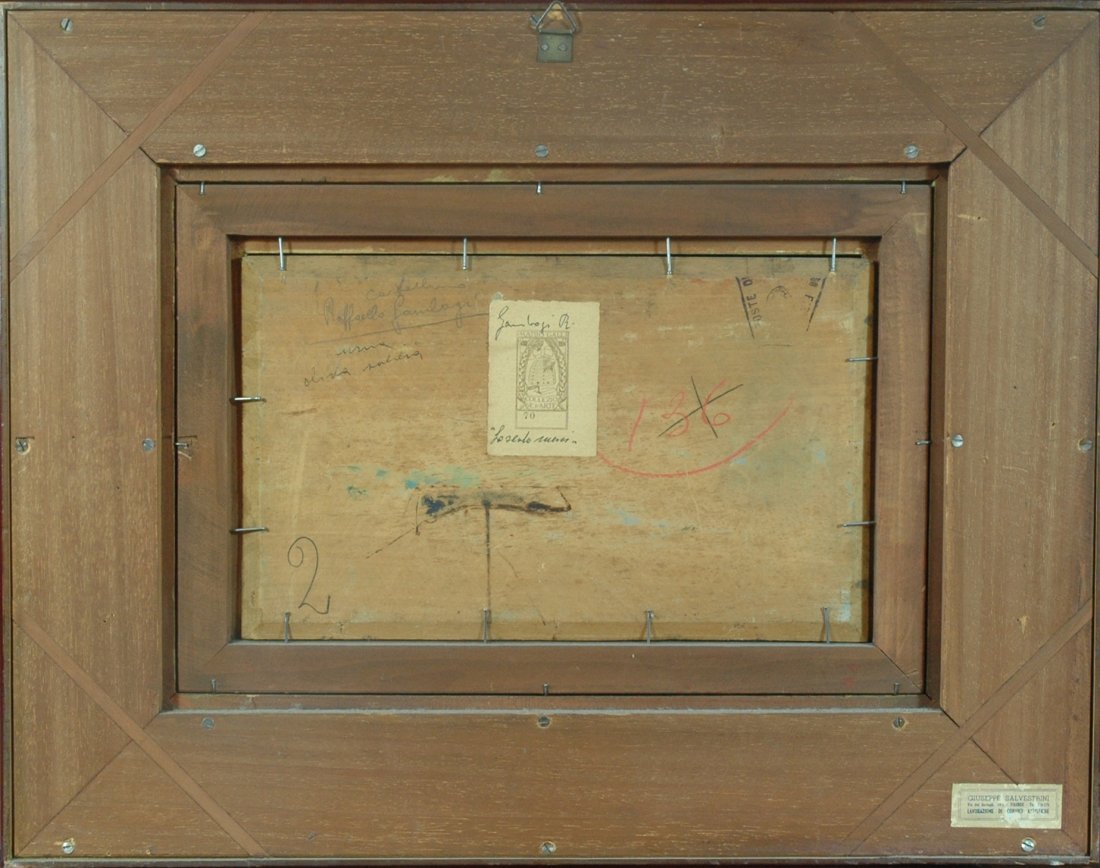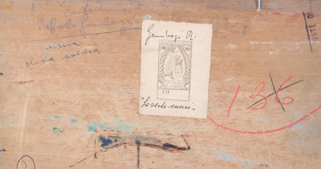 Scritta a stilografica Gambogi sull'ex-libris di Galli sul retro del dipinto