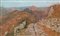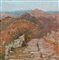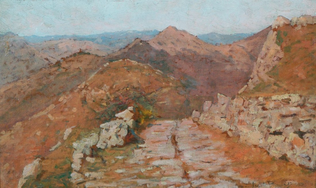 Pregevole scorcio montano di natura impressionista, risolto dal pittore livornese nei colori del rosa e dell'arancio.