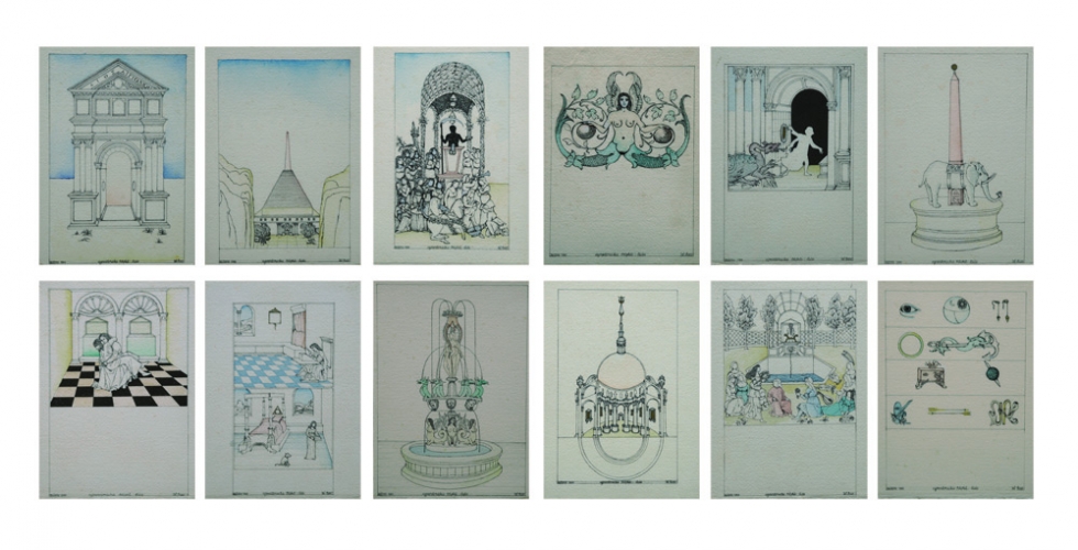 LUCIO DEL PEZZO 1933 " Hypnerotomachia Poliphili ", 1984 Tecnica mista su carta, cm. 29 x 21 (cadauno, 12 carte) Firmato e datato Etichetta Valente Arte sul retro Prov. Collezione Privata