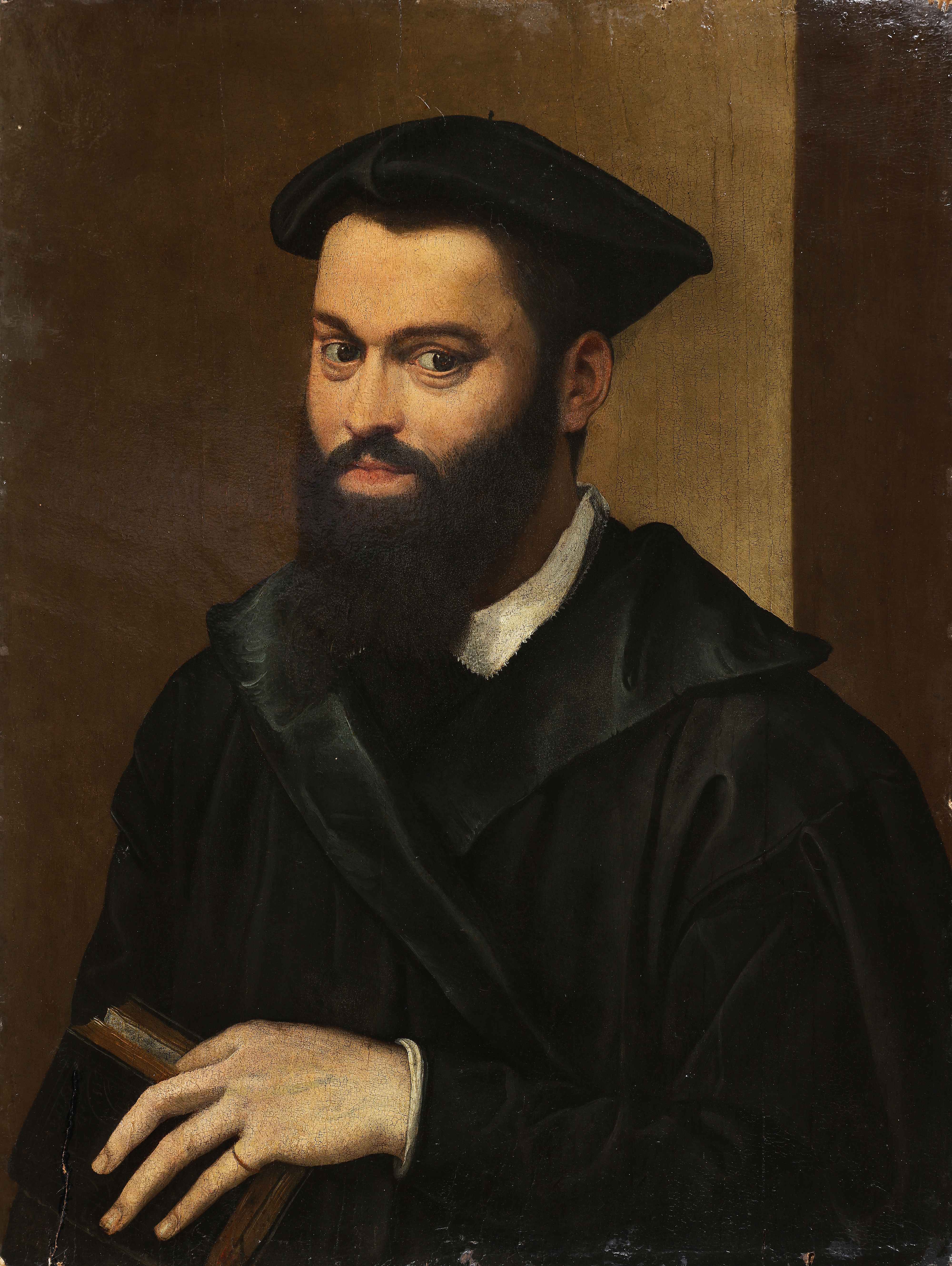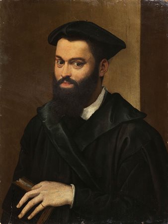 ARTISTA EMILIANO DEL XVI SECOLO Ritratto d'uomo con libro. Olio su tavola. Cm 52,00 x 69,00. Opera fornita di certificato di esportazione.