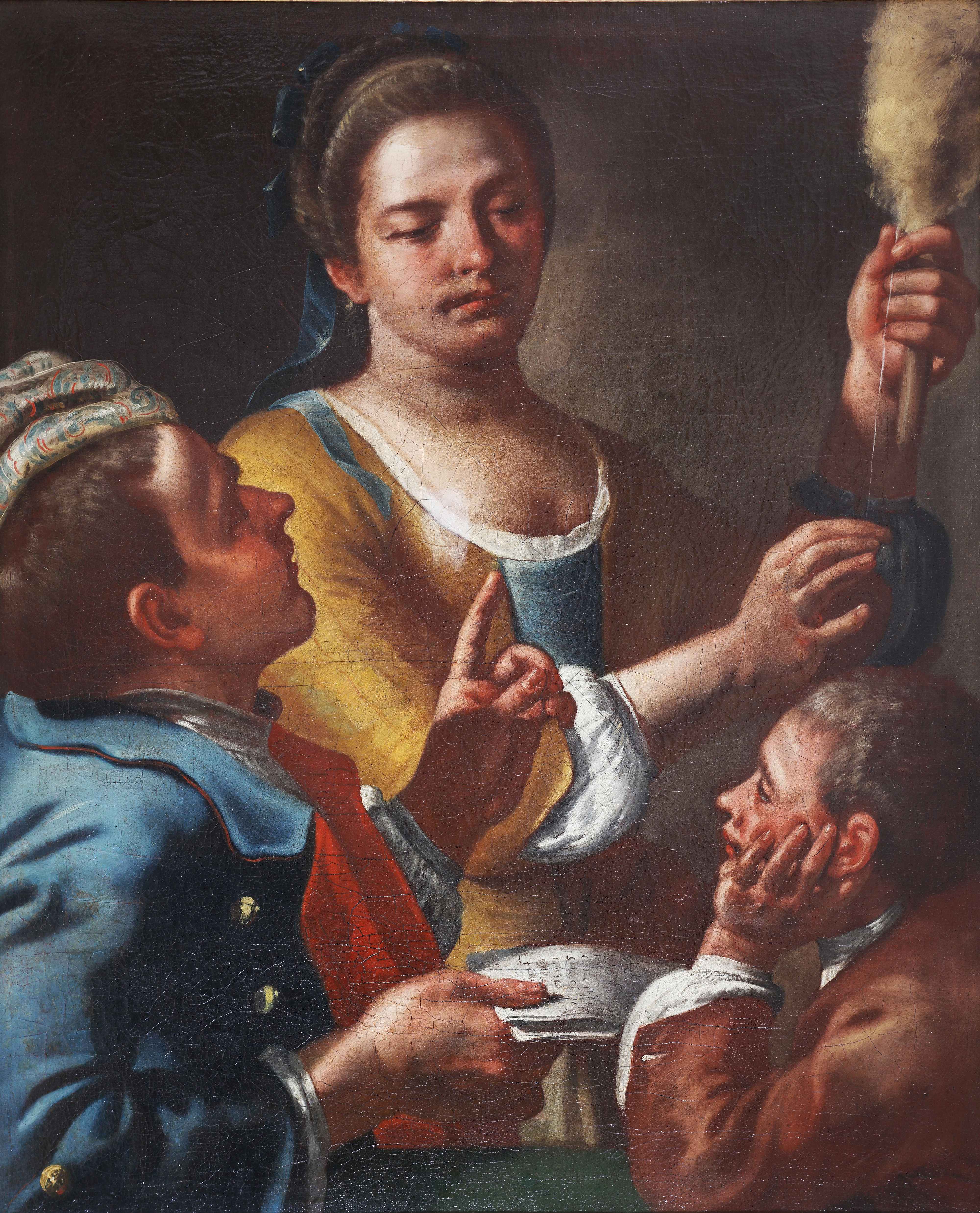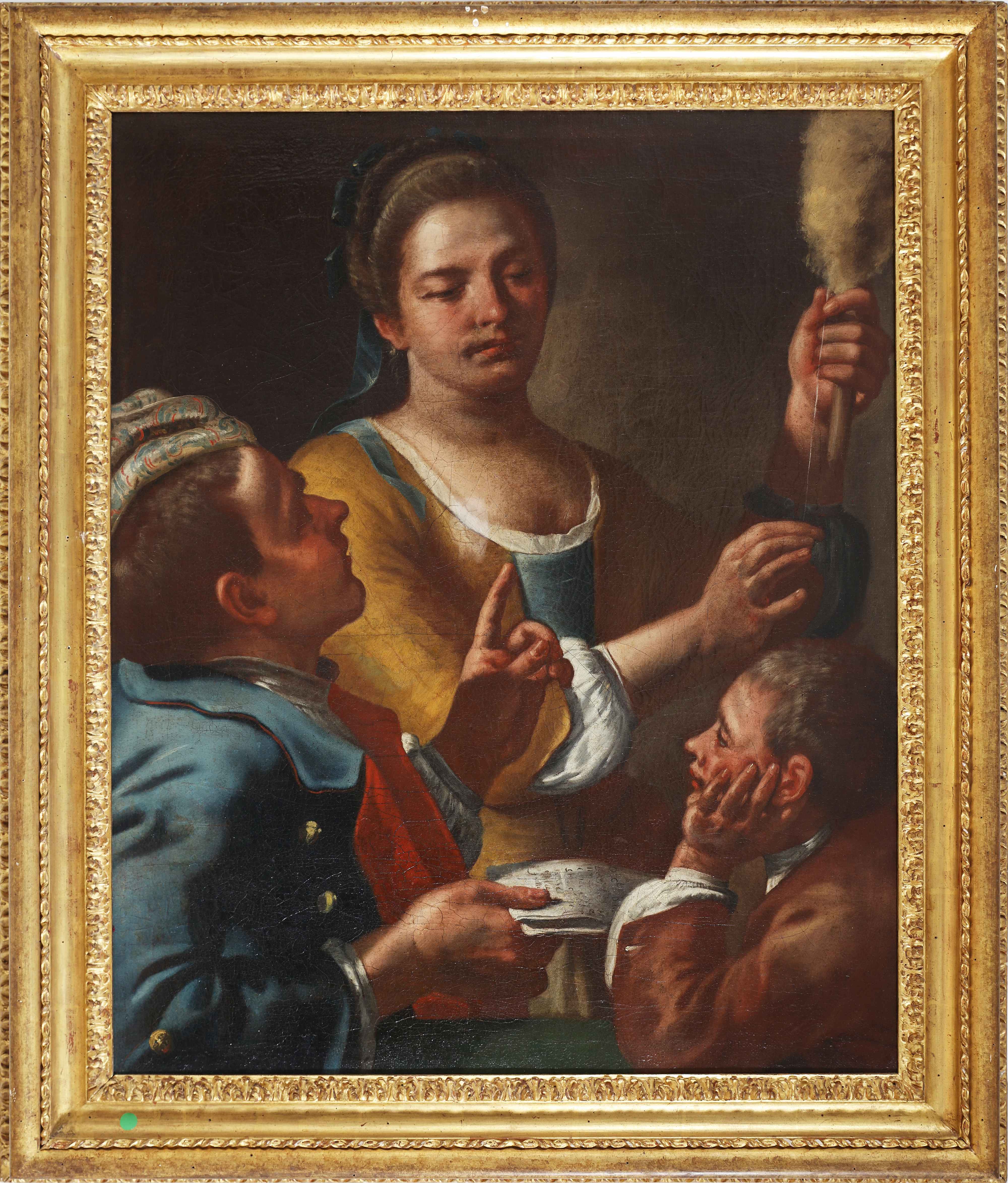 TRAVERSI GASPARE (1722 - 1769) La filatrice. Olio su tela. Cm 63,00 x 75,00. Pubblicato in Nicola Spinosa, Tiziana Scarpa ( a cura di), Luce sul Settecento. Gaspare Traversi e l'arte del suo tempo in Emilia. Parma, Galleria Nazionale 4 aprile - 4 luglio 2004, fig. R43. Allievo di Francesco Solimena, dopo gli esordi napoletani fu attivo principalmente a Roma, dove giunse intorno al 1752. Tra le prime opere realizzate al suo arrivo a Roma spiccano le sei tele con temi del Vecchio e del Nuovo Testamento per la chiesa di San Paolo fuori le mura. Nella ritrattistica (Ritratto di canonico, 1770, Capodimonte), come soprattutto nelle tele di “genere” (Concerto, 1755, Museo Pignatelli), Traversi dimostrò la sua grande abilità nello studio psicologico e nella resa realistica dei personaggi, presi in prestito dagli ambienti aristocratici e popolari della Napoli borbonica. Nelle sue tele le scene di vita quotidiana assumono una dimensione monumentale, sia per il formato che per la tecnica raffinata, diventando strumento di analisi e critica delle contraddizioni interne alle classi sociali del tempo. Tra le sue opere si ricordano anche Il ferito (1752), La lettera segreta (1755) e Le sante Lucia, Agata e Apollonia (1753-58).