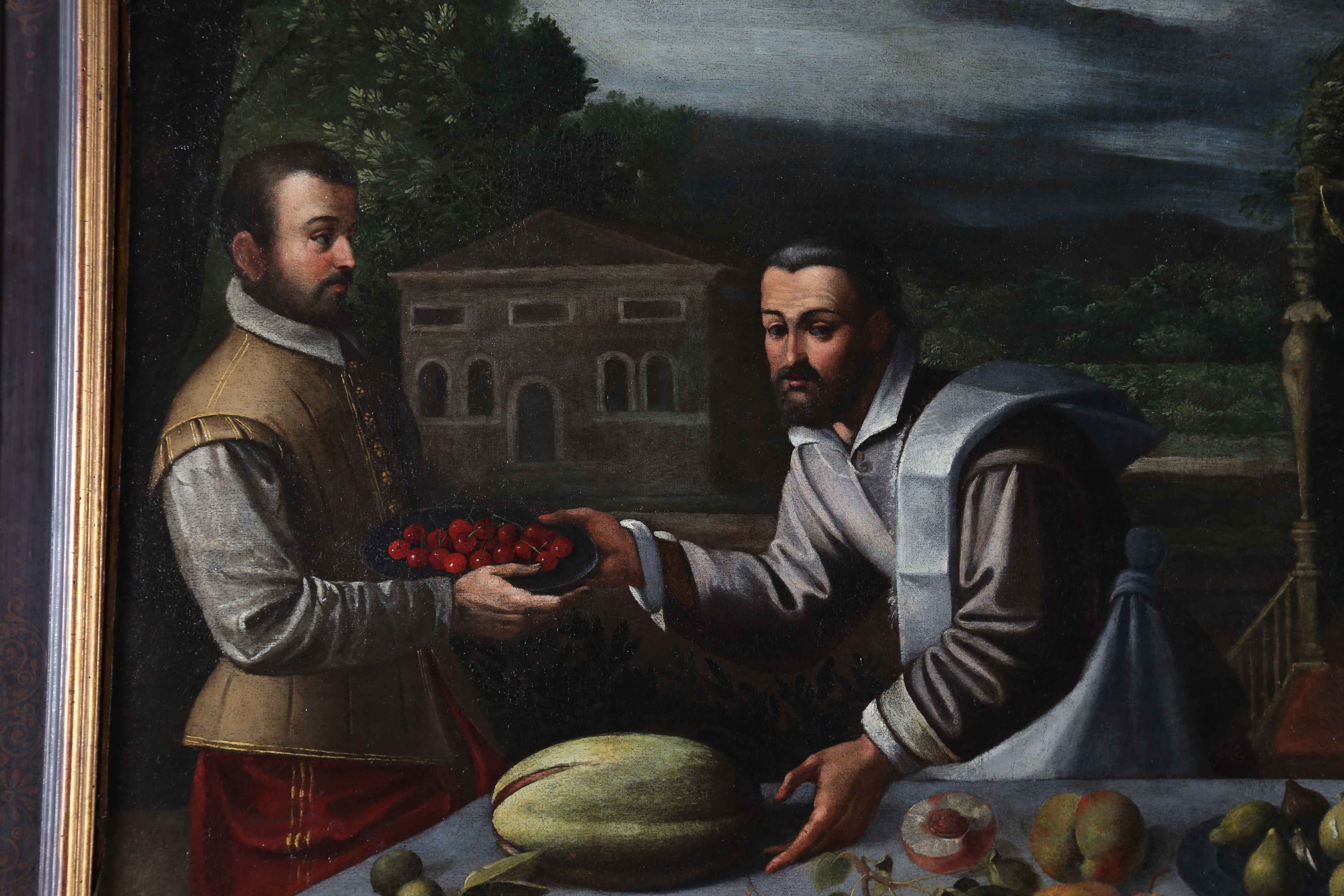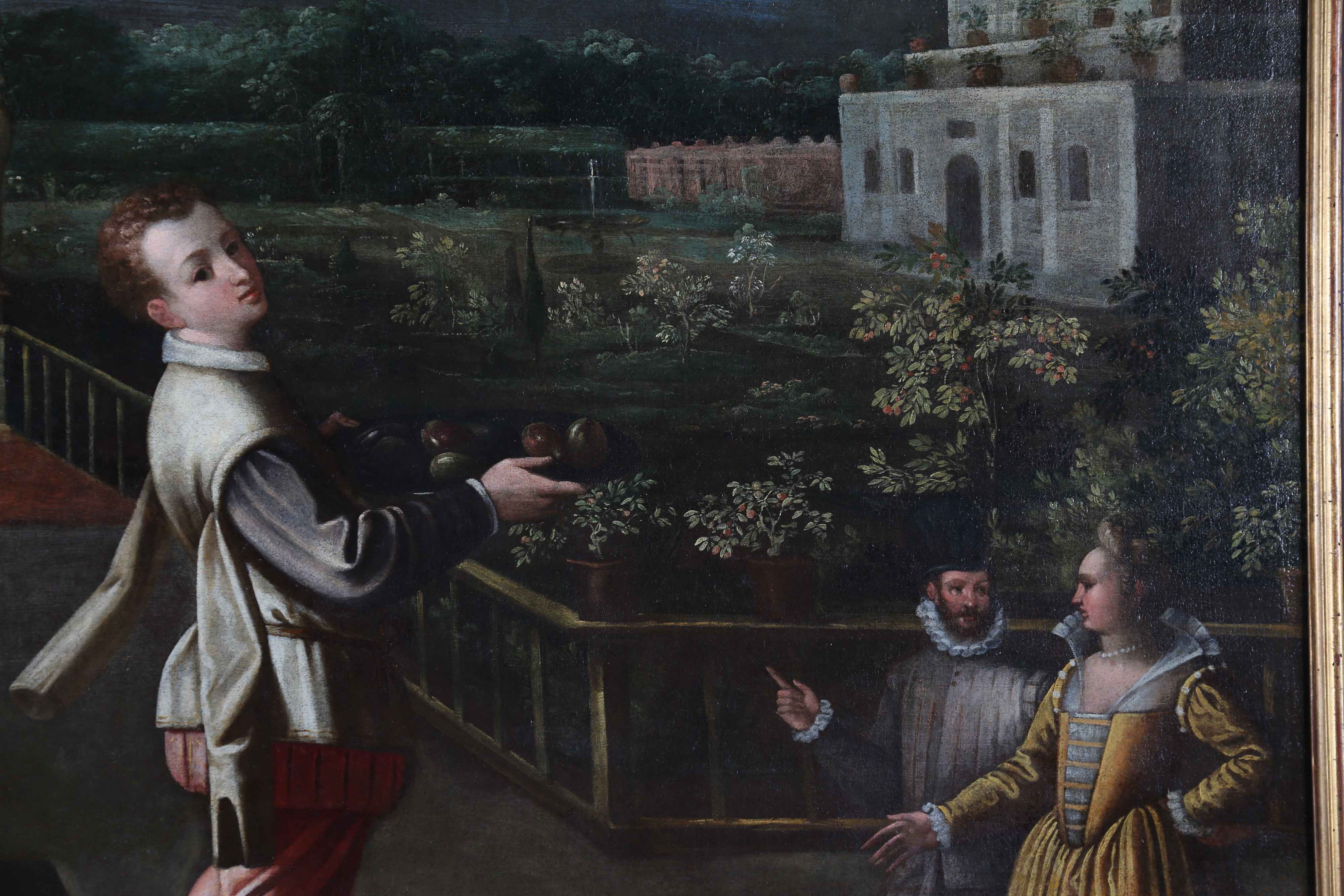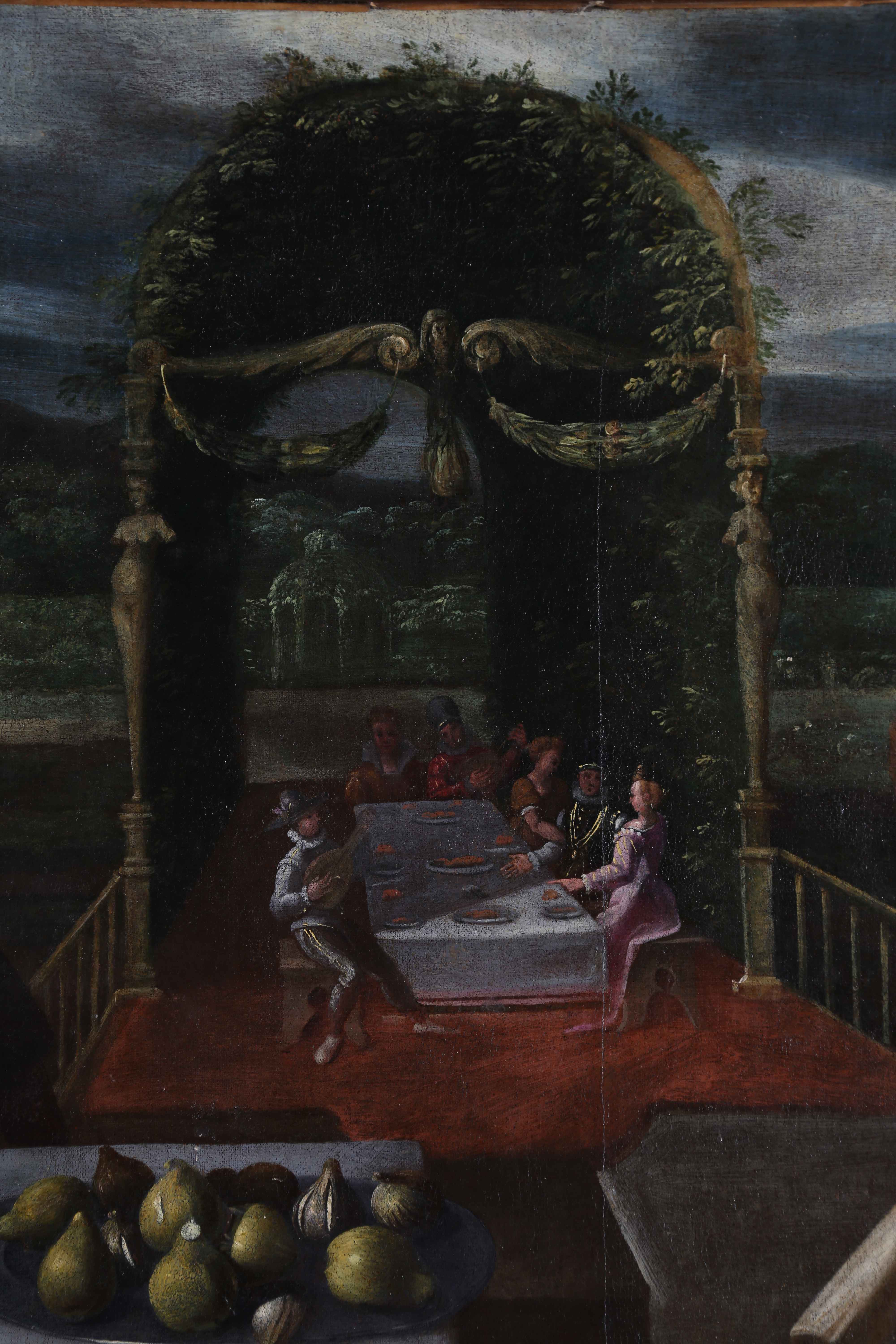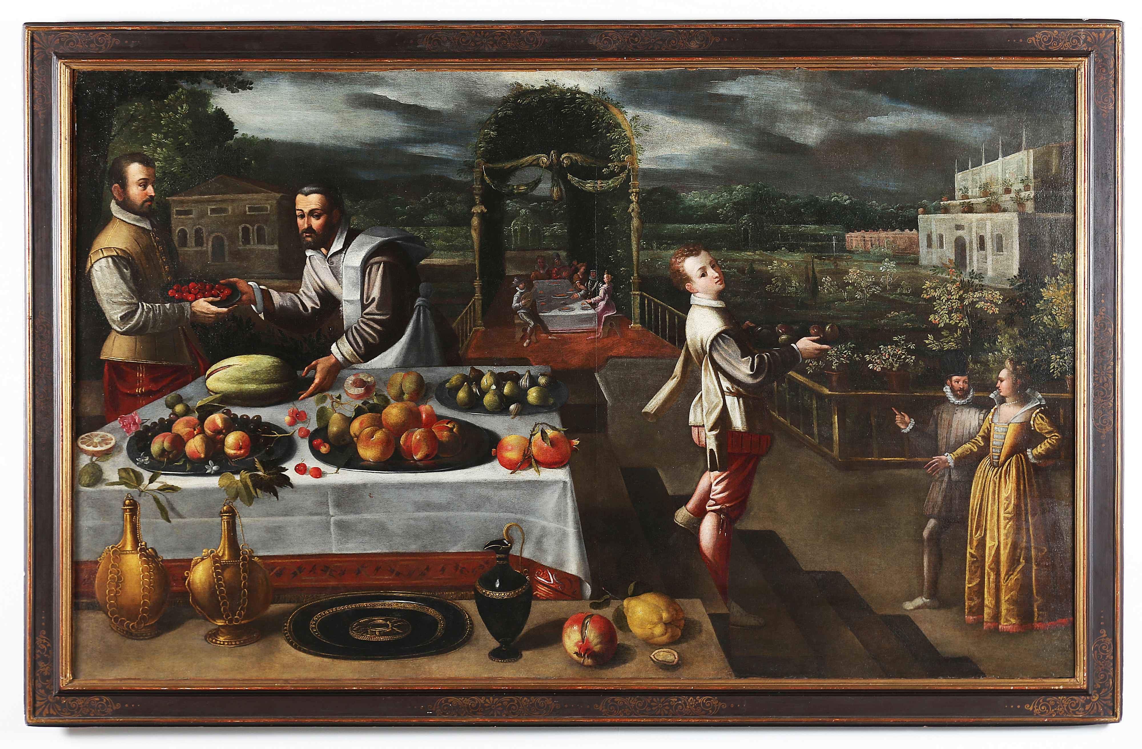 TOEPUT DETTO IL POZZOSERRATO LODEWIJK (1550 - 1605) Scena di banchetto all'aperto. Olio su tela. Cm 203,00 x 123,00. Pittore, incisore e poeta, sembra che Ludovico Possoserrato fosse allievo di Hans Bol. Neerlandese ma trevigiano d’adozione, si trasferì quindi in Italia, soggiornando per un certo periodo a Venezia e compiendo viaggi a Firenze e Roma. Si stabilì quindi nel 1582 a Treviso dove svolse gran parte della sua attività. La sua pittura è strettamente legata a quella veneta: in particolare risente molto direttamente della lezione del Veronese e del Tintoretto. L’opera in esame è un raffinato esempio dello stile di questo singolare artista della sua piena maturità: le suggestioni dei giardini delle ville venete, animati da banchetti e concerti, si uniscono ai suggerimenti della pittura fiamminga, che porta all’aperto i passatempi dell’alta società. Grazie alla grafica circolavano in Italia stampe di dipinti come Paesaggio con castello di Hans Bol o ancora la Primavera di Lucas Valckenborch, che portavano sulla scena di una paesaggio innovatore gli spassi all’aperto dell’alta società delle Fiandre. È proprio dalla fusione di esperienze venete e suggerimenti fiamminghi che nasce la poetica delle opere più significative del Pozzoserrato, In un paesaggio nuvoloso tardo pomeridiano, che sembra presagire pioggia, si svolge una colazione al di sotto di un pergolato, che si nota in secondo piano. Al tavolo siedono anche dei musici. Nel primo piano invece, un tavolo con una tovaglia bianca con bordi rosso corallo e argento, riccamente adornato di frutta, pesche, fichi, ciliegie, melone, realizzata con maestria nella sua luminosità cromatica. Il cuoco porge nelle mani di un servitore un bel piatto di ciliegie, che sta per essere portato a tavola. In primo piano un davanzale di raffinati fiaschi dorati, che risaltano sul lino della tovaglia, oltre ad un piatto ed una brocca neri con profili in oro che si accostano ad un melograno maturo, un limone e una noce. Un giovane servitore scende le scale volgendo lo sguardo verso l’osservatore, coinvolgendolo nella scena di banchetto.. La composizione ricorda i dipinti del Tintoretto e del veronese anche se in modo più formale, mentre le figure ricordano quelle di Leandro Bassano. L’opera è databile alla piena maturità dell’artista e ne sono note diverse versioni, tutte con delle varianti: i personaggi sono molto simili, ma cambia la frutta posta sul tavolo e l’architettura delle ville. Nel dipinto passato in asta da Sotheby’s il 27 aprile 1960, n. 94, sulla destra della scena si ritrova una fontana al posto della villa, mentre la costruzione sulla sinistra è più maestosa, in un’altra versione, invece, passata in asta a Berlino alla vendita Van Diemen, 26-27 aprile 1935, n. 7, si intravede dietro la scalinata un secondo giovane servitore, e mancano sulla destra i due personaggi presenti nel dipinto in esame. Di un’altra versione conservata a Monaco di Baviera in collezione privata, dove il cielo presagisce un temporale, esisteva un disegno preparatorio al Gabinetto di Disegni di Berlino, poi andato perduto in un incendio . È stato ipotizzato che queste tele di conviti all’aperto potessero essere un’allegoria dell’autunno, vista la copiosità della frutta presente sul tavolo, elemento che da sempre esprime tale stagione, così come anche il cielo nuvoloso. Provenienza: Collezione privata svedese Bibliografia comparativa L. Menegazzi, Il Pozzoserrato, Venezia 1958, pp. 25-27; S. Mason Rinaldi, D. Luciani Toeput a Treviso, Ludovico Pozzoserrato, Lodewijk Toeput, pittore neerlandese nella civiltà veneta del tardo Cinquecento in Atti del seminario, Treviso, 6 - 7 novembre 1987, Asolo 1988, pp. 71-77.