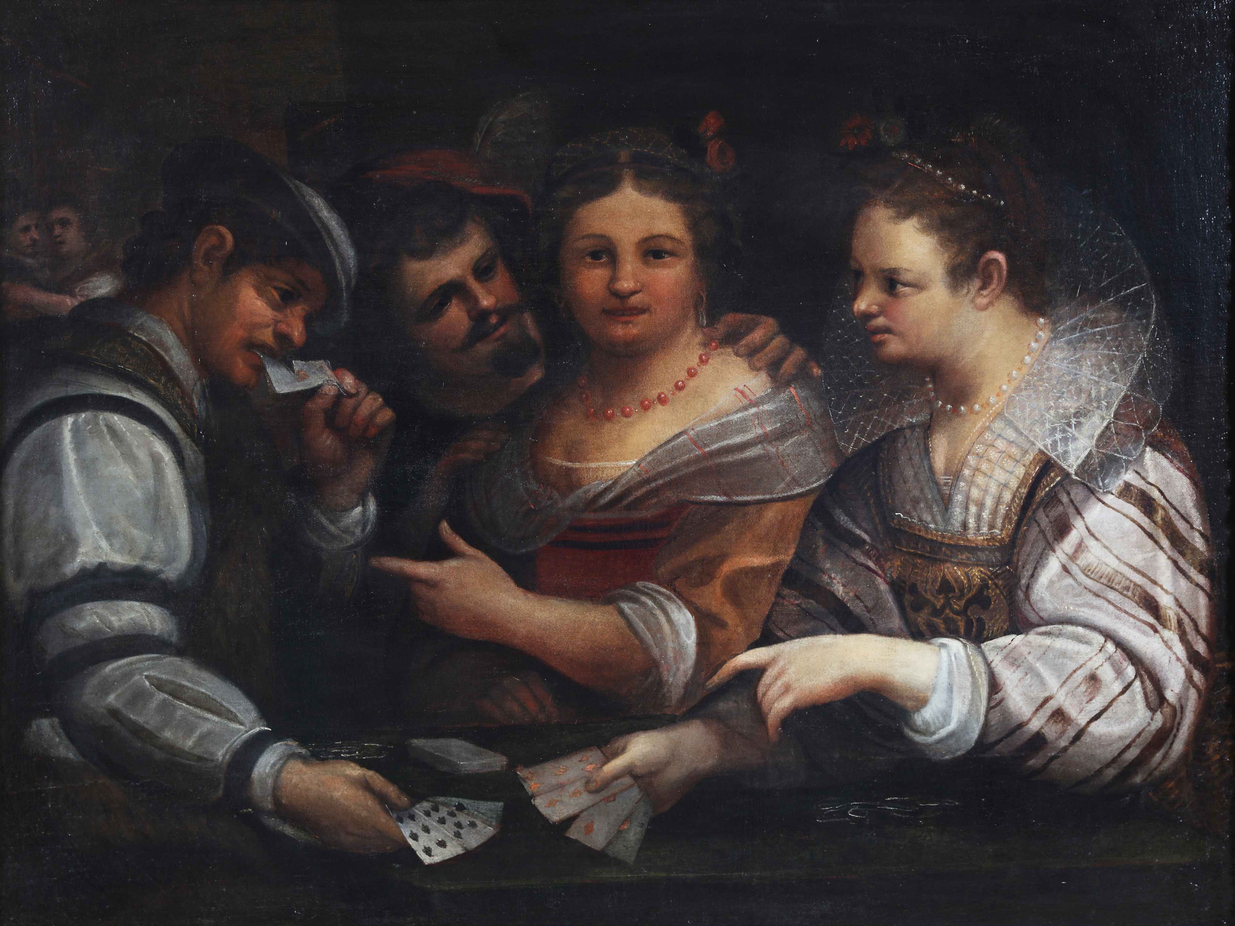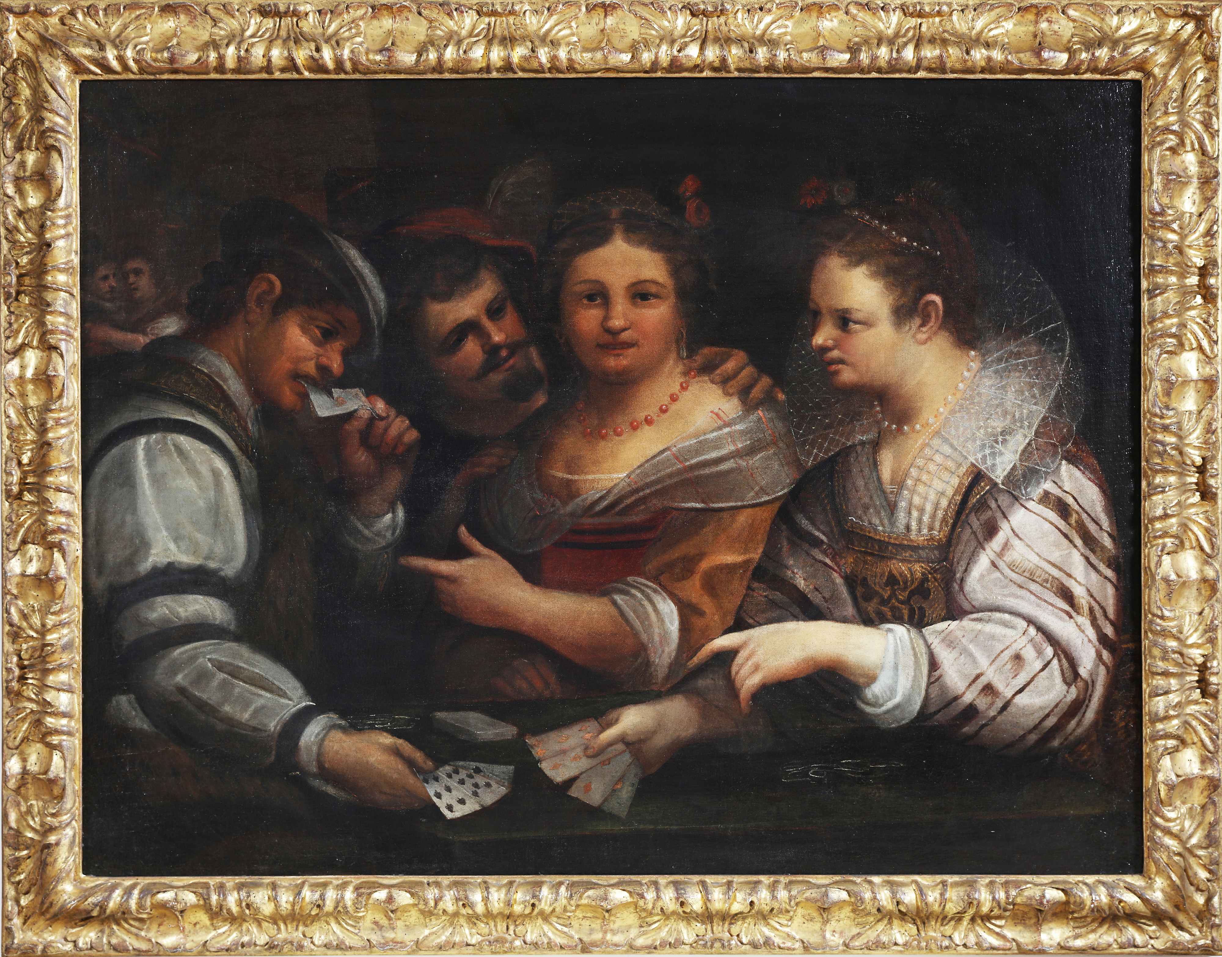 GATTI GERVASIO (1550 - 1630) Giocatori di carte. Olio su tela. Cm 120,00 x 90,50. Nacque intorno al 1549-50 quasi certamente a Cremona, dove da tempo risiedeva la sua famiglia. Il padre, Giovan Pietro, era fratello del pittore Bernardino dal quale il Gatti ereditò il soprannome di Sojaro. Presso lo zio condusse il proprio apprendistato, documentato a partire dai lavori per la cupola di S. Maria della Steccata a Parma dove Bernardino fu attivo dal 1560 al 1572. Il Gatti si formò dunque a diretto contatto con le opere dei maestri parmensi, filtrando la lezione che lo zio aveva assimilato dalla "maniera" romano-padana. Con poche eccezioni, l’artista lavorò sempre a Cremona, dove realizzò anche la sua prima opera documentata. Il S. Sebastiano con un fanciullo devoto fu infatti eseguito per ornare un altare laterale della chiesa di S. Agata. In quest’opera emerge una sensibilità verso stilemi veneti che fu propria anche di altri artisti cremonesi, tra cui soprattutto Antonio Campi, come testimonia il suo S. Sebastiano del 1575, oggi nelle raccolte del Castello Sforzesco di Milano. Il Gatti subì ancora l'influenza di Dosso nell'Annunciazione (Cremona, Museo civico) firmata nel 1580 per l'altare maggiore della chiesa di S. Maria in Betlem, parrocchia nella quale mantenne sempre la propria residenza. Questa pala rivela altre componenti che il pittore aveva potuto assorbire nella sua città: modi pordenoniani si uniscono infatti ad ascendenze mantovane mediate dalle esperienze dello zio Bernardino, e sembrano accogliere suggerimenti dal moderno linguaggio di Antonio Campi. Si ringrazia MarcoTanzi per aver confermato per iscritto l'autenticità dell'opera.