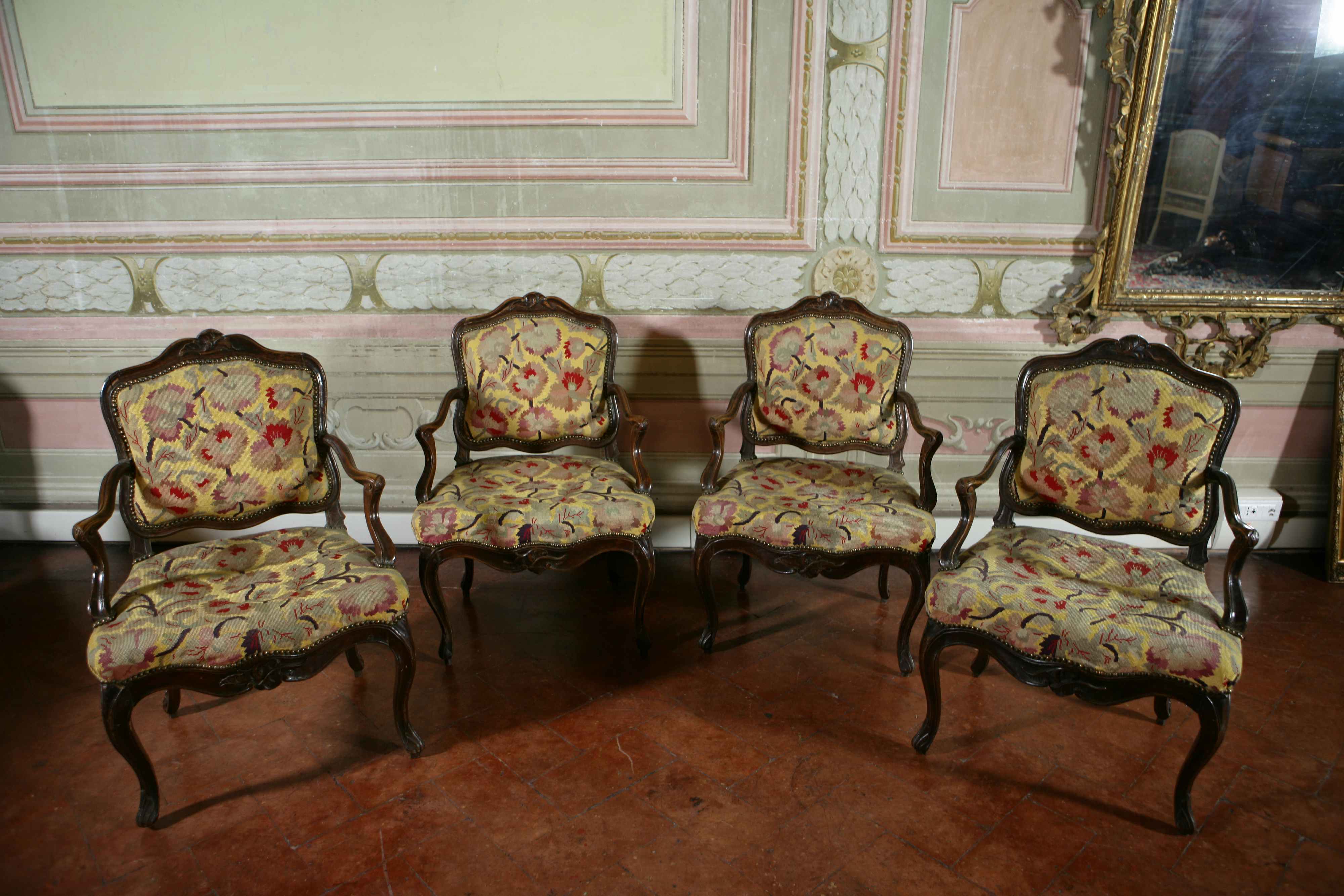 MANIFATTURA FRANCESE DEL XVIII SECOLO Quattro poltrone sagomate del periodo luigi XV, 1780 ca. legno. . con tapezzeria piccolo punto.