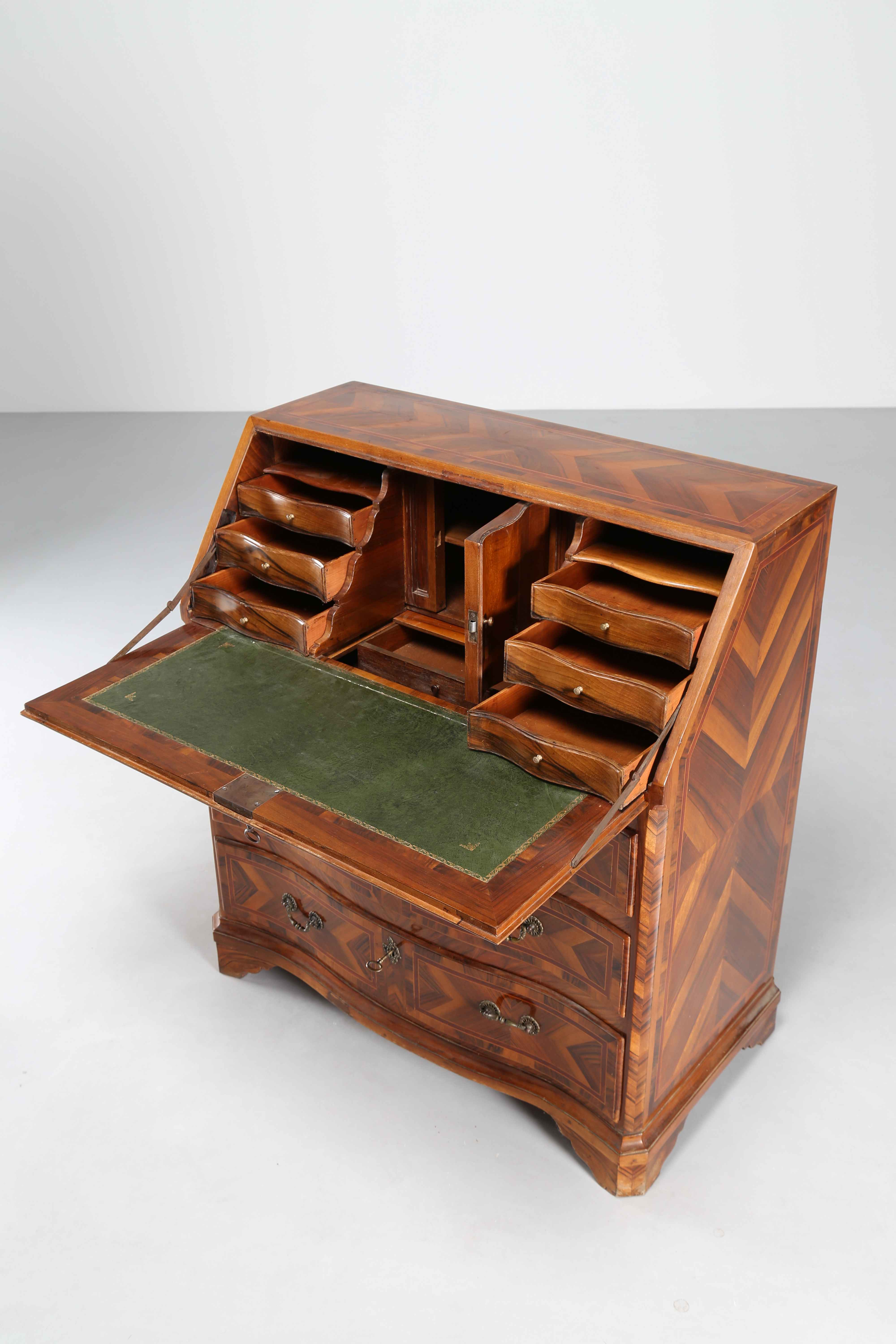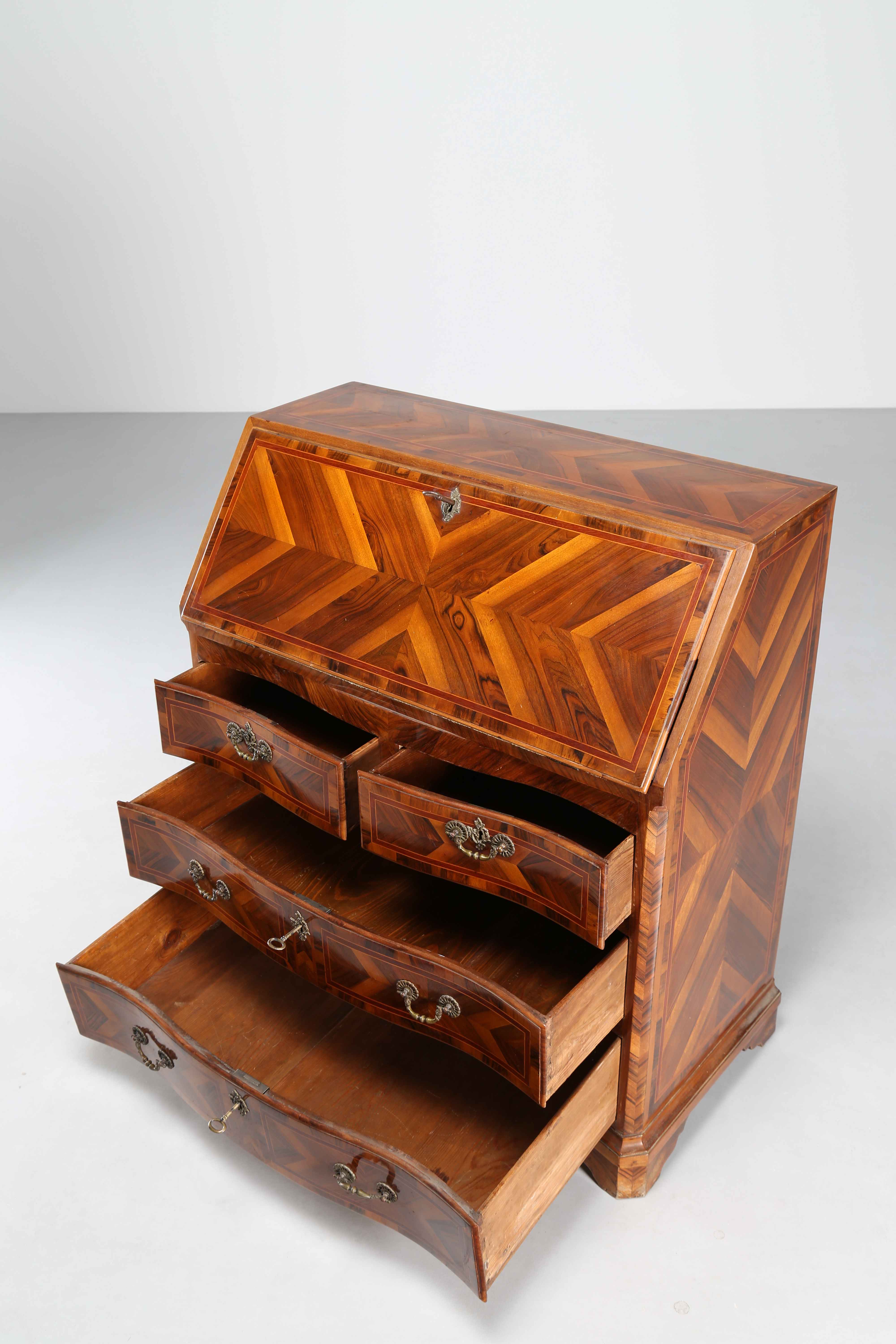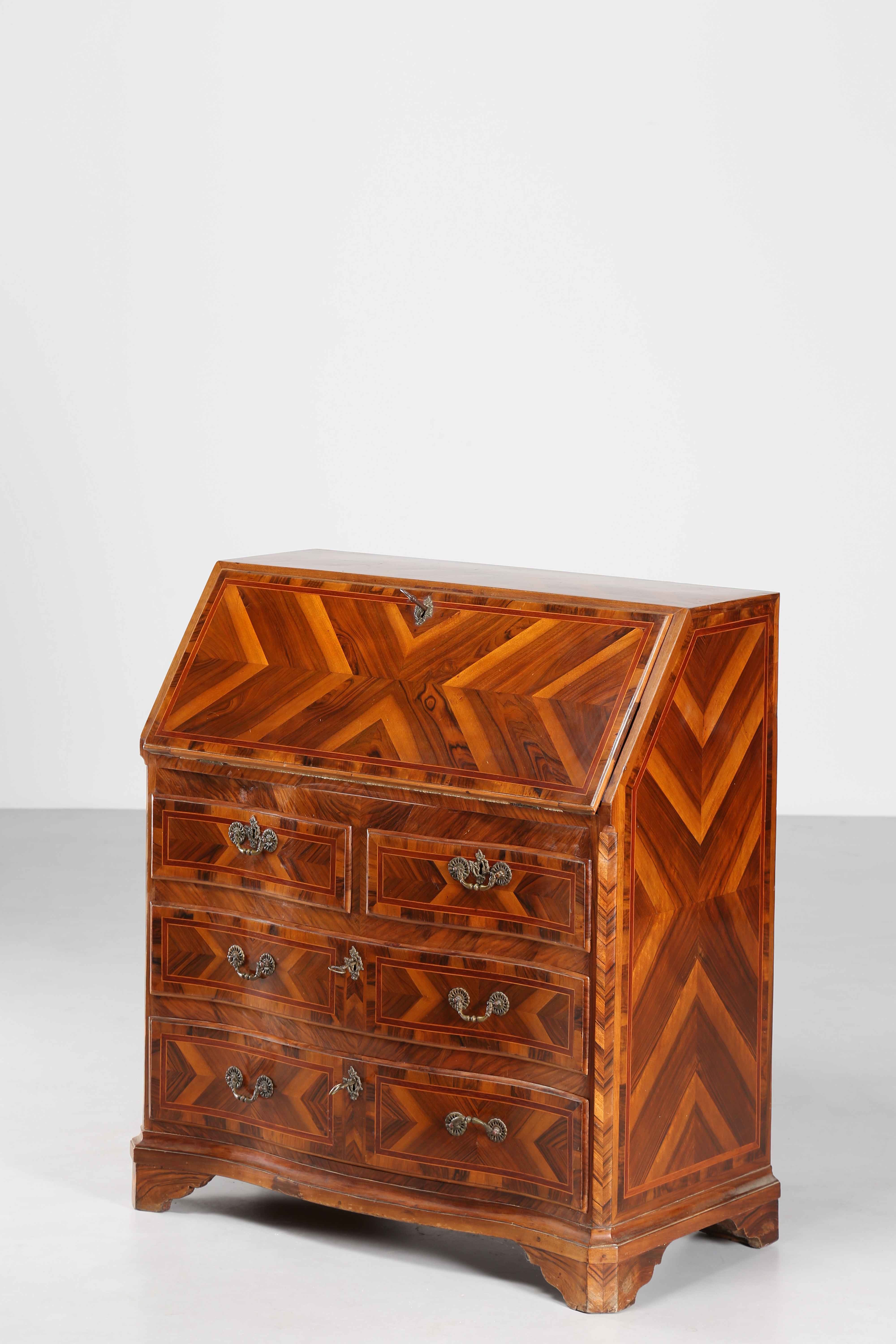MANIFATTURA TEDESCA DEL XVIII SECOLO Casettone a ribalta finemente lastronato a motivi geometrici, a quattro cassetti. Lastronato in legno di noce. Cm 105,00 x 97,00 x 55,00.