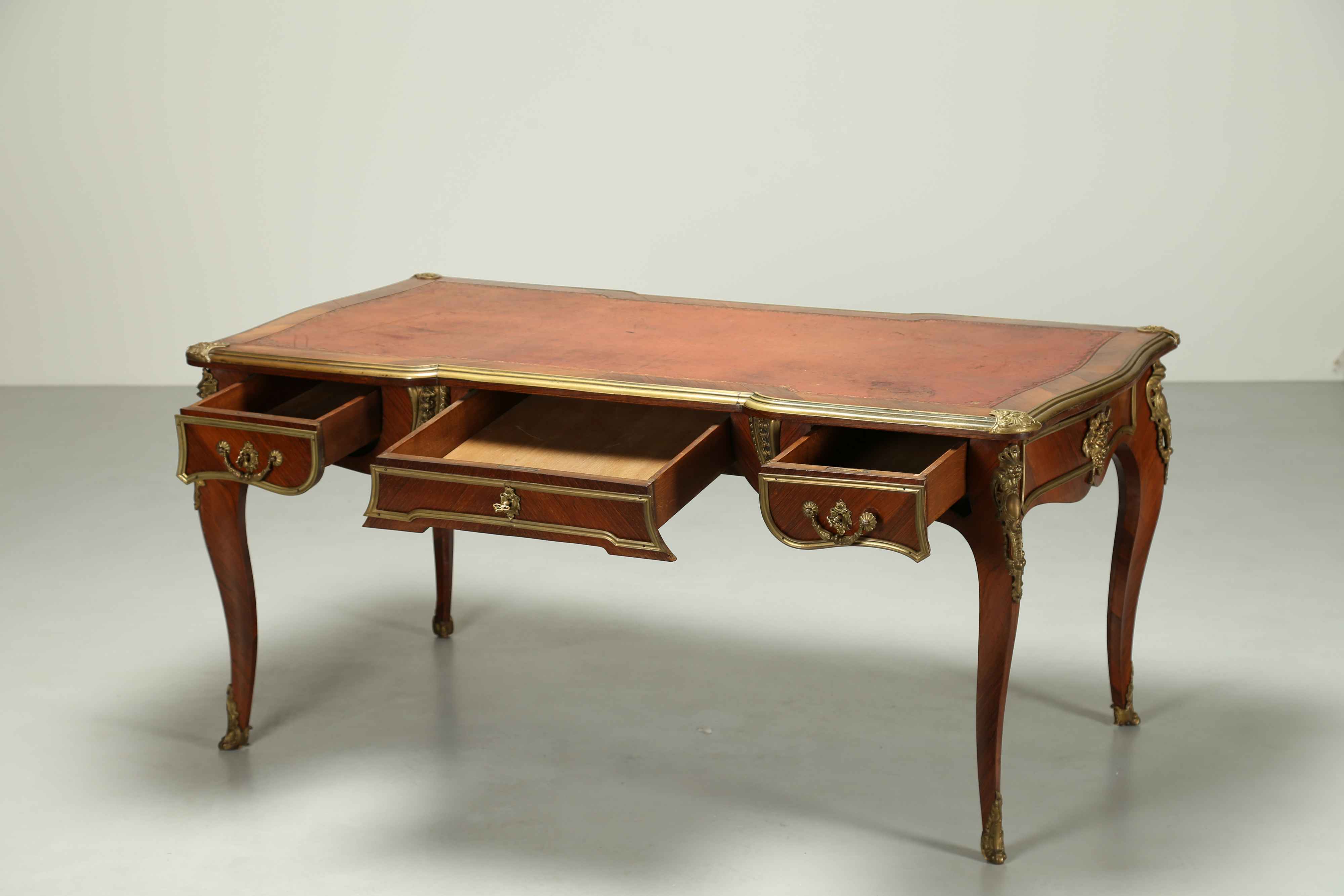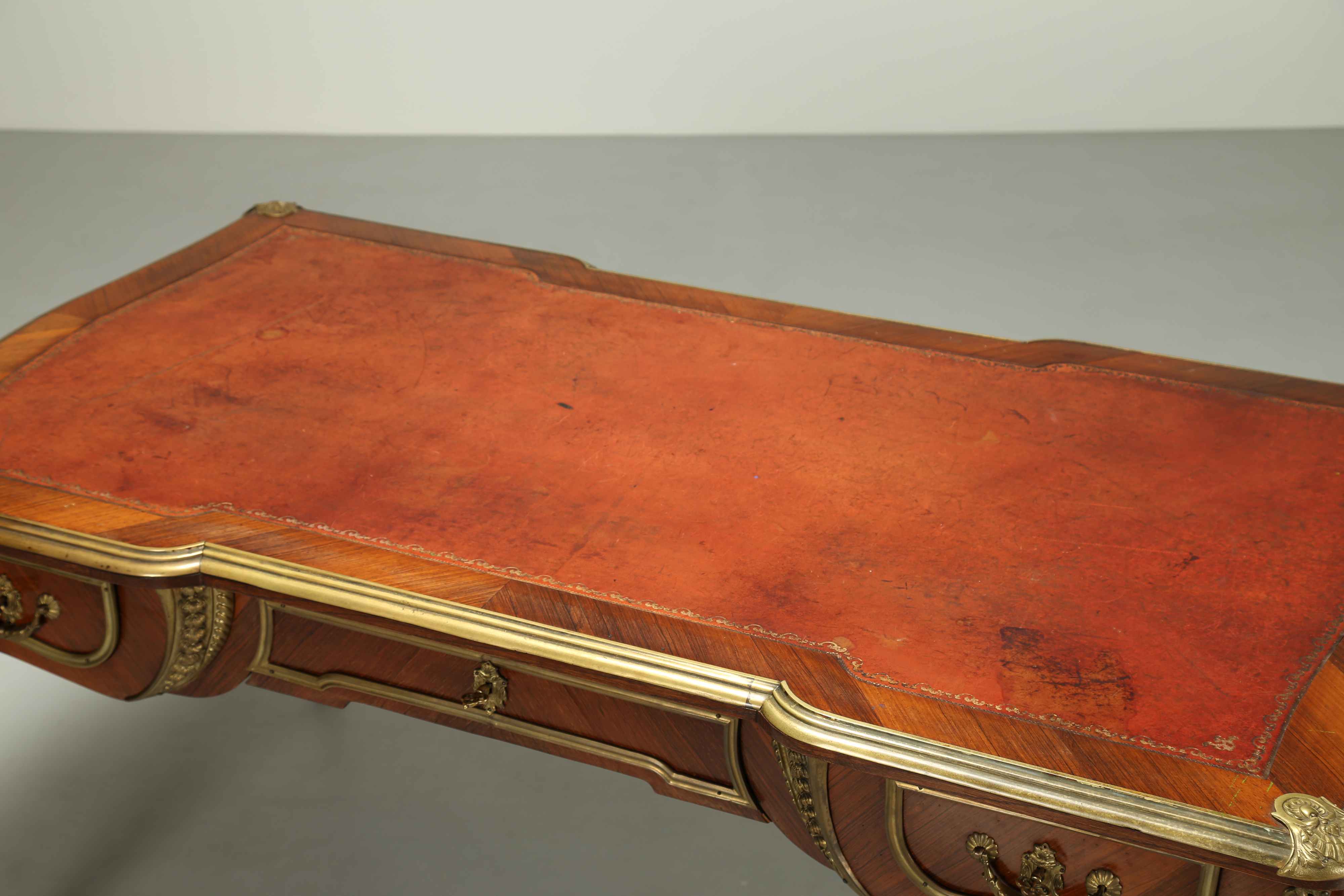MANIFATTURA FRANCESE DEL XIX SECOLO Elegante scrivania in stile luigi XV, finemente lastronata, decorazioni in bronzo dorato. 1880 ca. Lastronato in legno di noce. Cm 167,00 x 77,00 x 92,00.