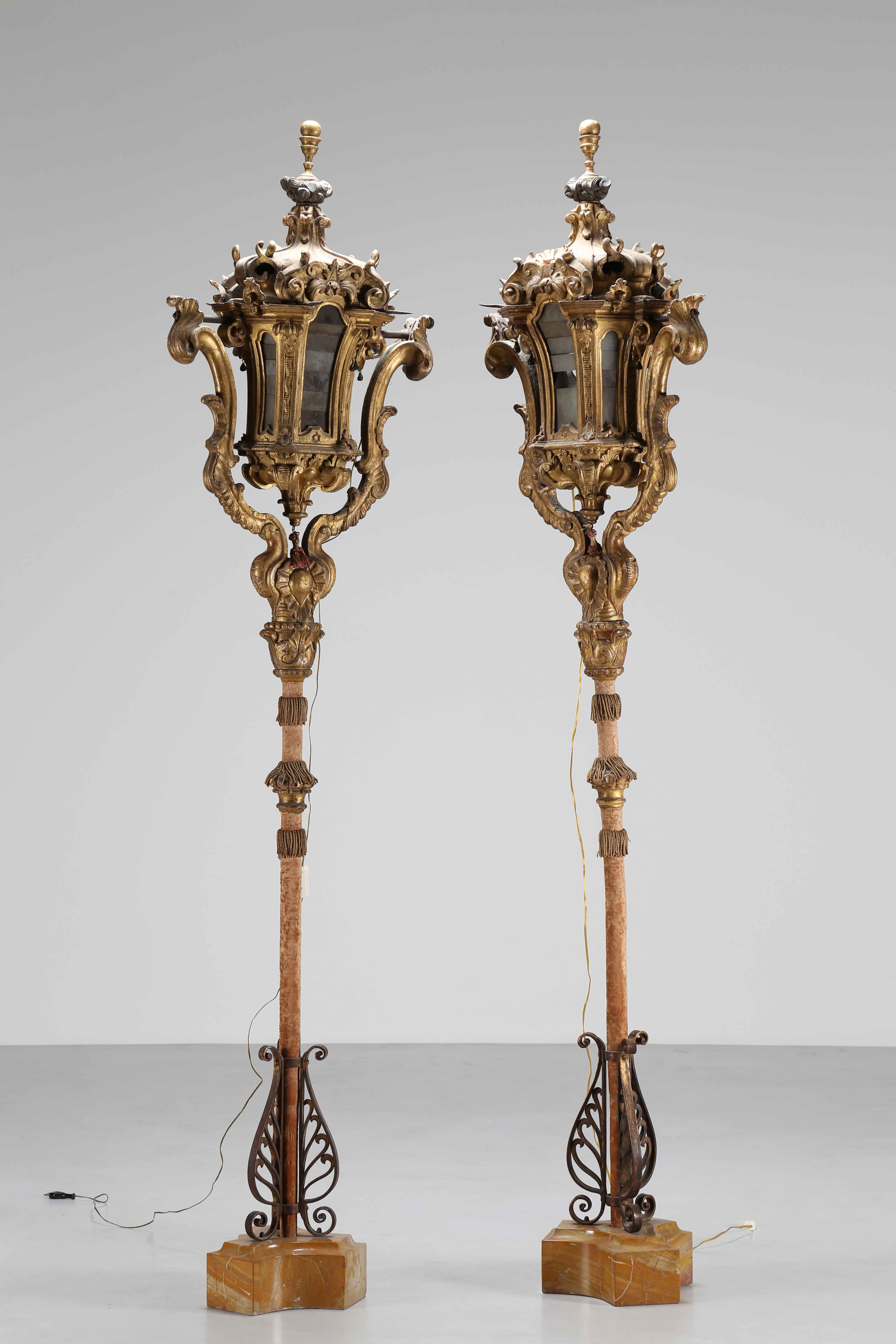 MANIFATTURA VENEZIANA DEL XVIII SECOLO Coppia di lanterne ad asta in legno intagliato e dorato. in legno dorato,. Cm 240,00.