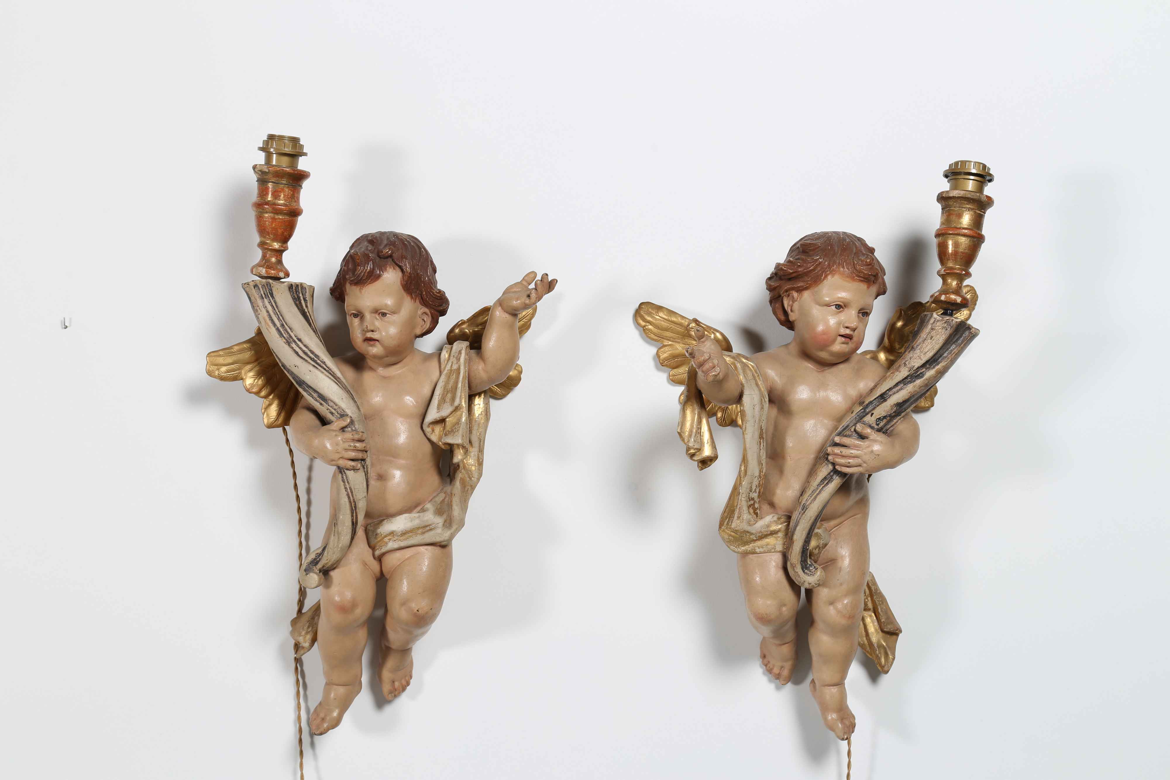 MANIFATTURA ITALIANA DEL XVIII SECOLO Coppia di angeli in legno scolpito policromo. legno scolpito policromo. Cm 40,00 x 71,00 x 17,00. lievi difetti e sbeccature.