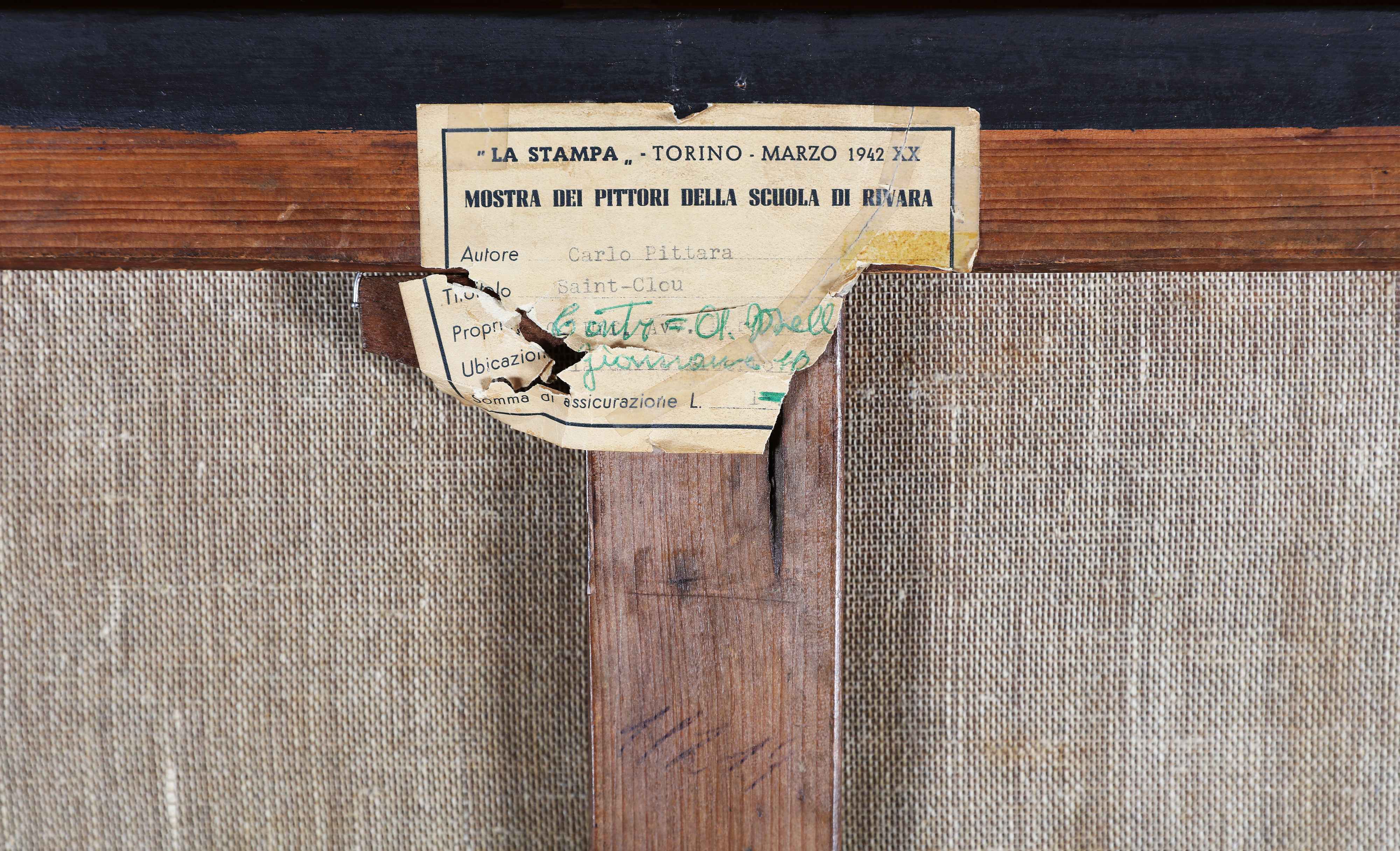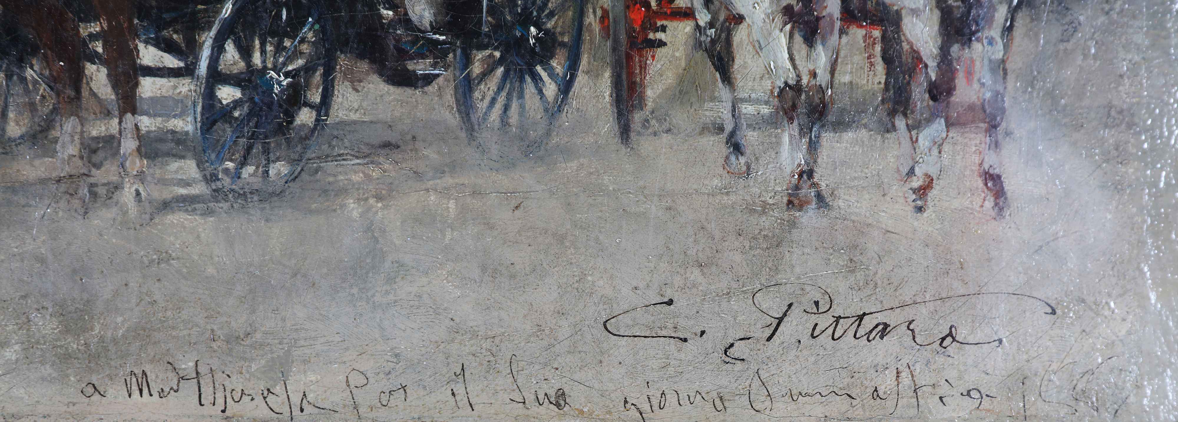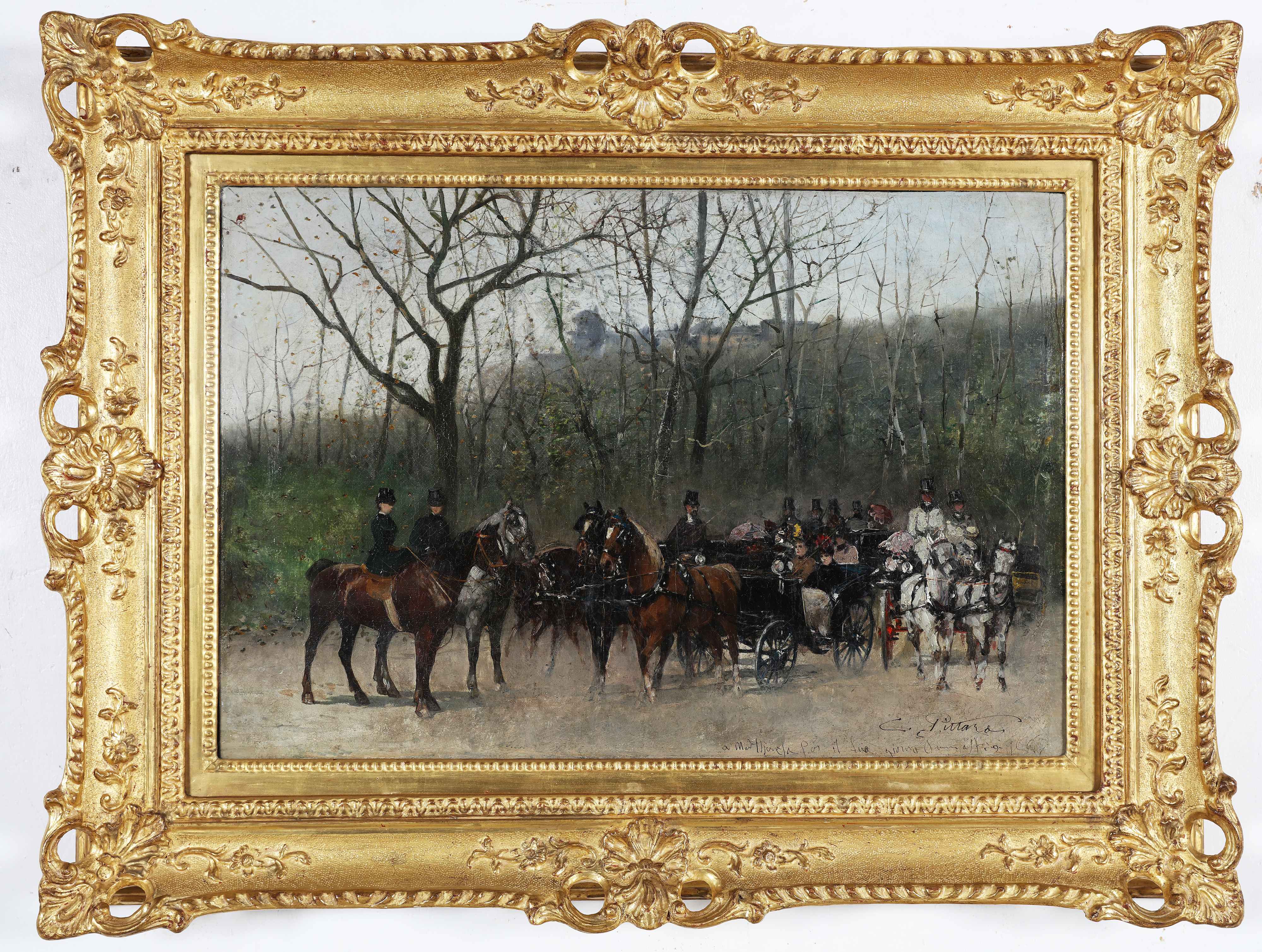 PITTARA CARLO (1836 - 1890) Cavalieri e carrozze a Saint-Cloud. 1887. Olio su tela. Cm 57,00 x 38,50. Firmato in basso a destra, dedicato e datato. Al retro cartiglio della mostra "Mostra dei pittori della scuola di Rivara, La Stampa - Torino - marzo 1942 XX. Bibliografia Marziano Bernardi (a cura di), Catalogo della Mostra dei pittori della scuola di Rivara, Torino: La stampa, 1942.