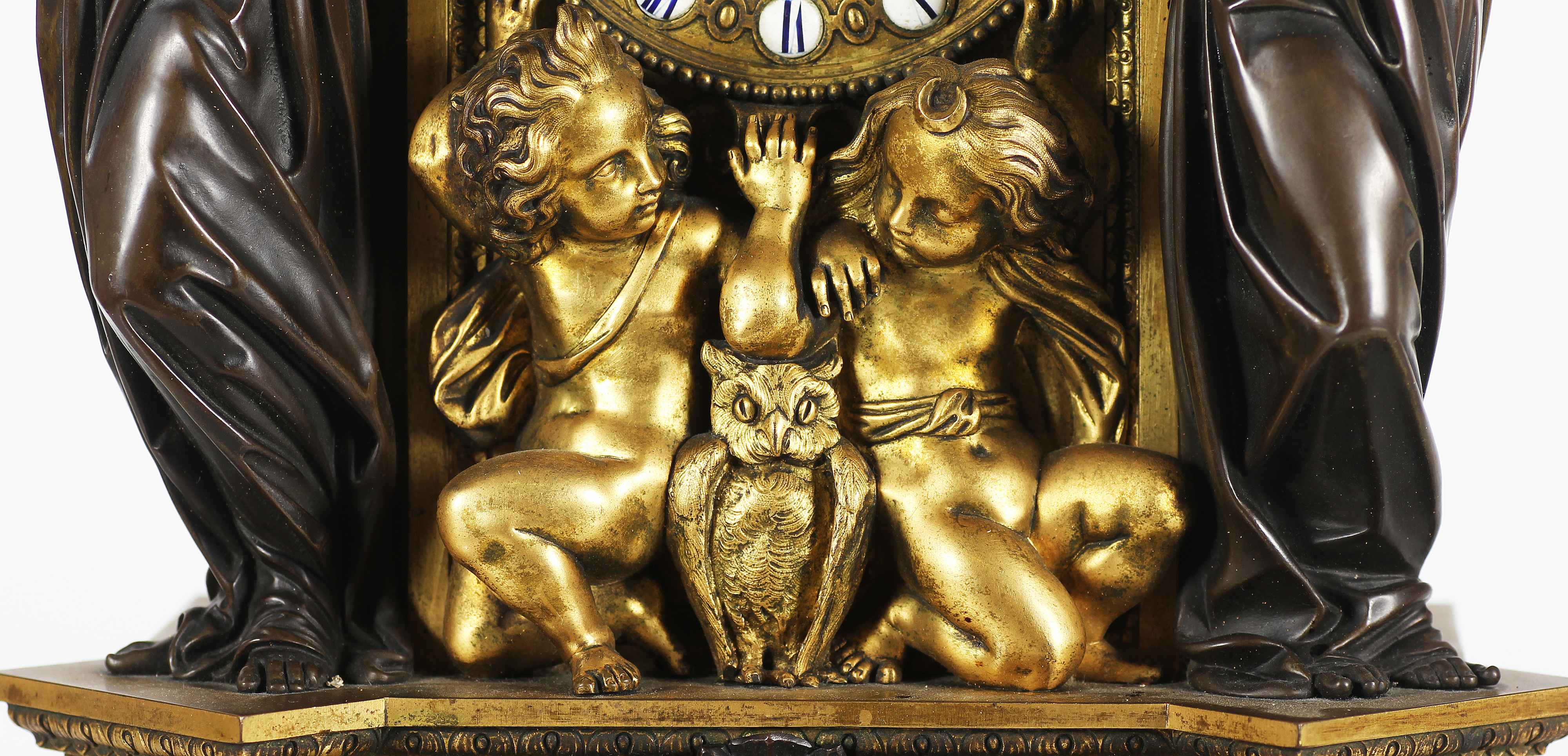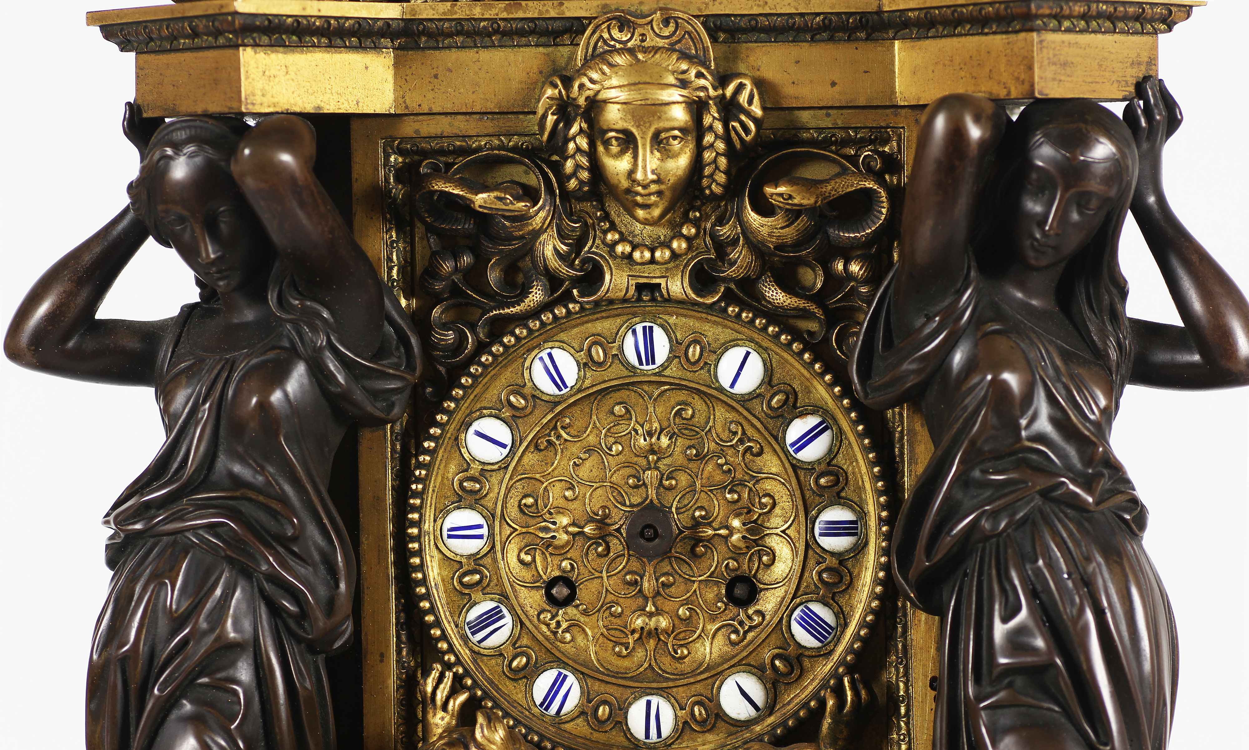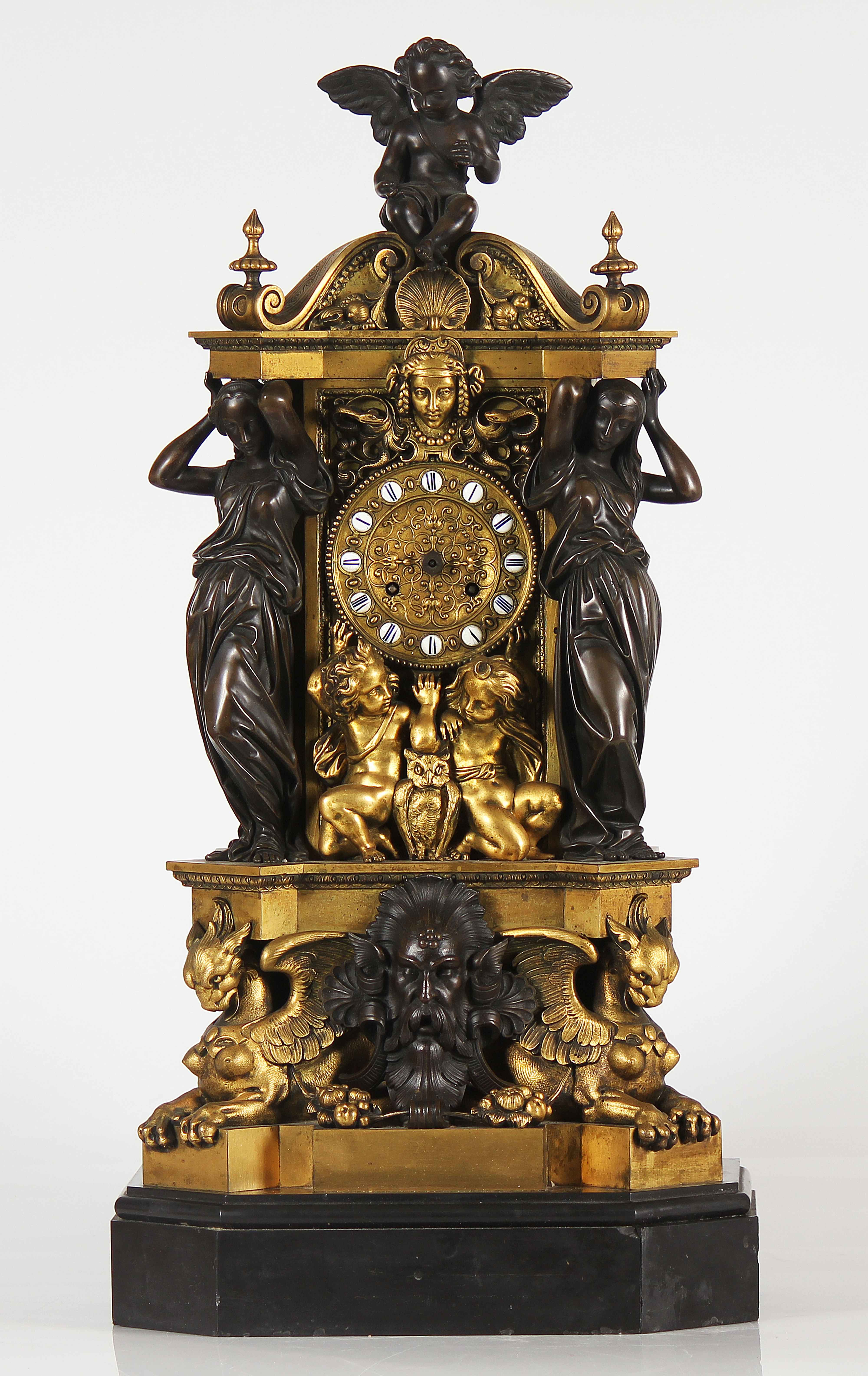 MANIFATTURA DENIERE PARIGI XIX SECOLO Orologio da tavolo dorato con elementi a foggia di chiemere e figure femminili in bronzo brunito. Bronzo dorato. Cm 33,00 x 67,00 x 20,00. Opera provvista di attestato di libera circolazione. Il movimento è firmato 94 Denière Paris.