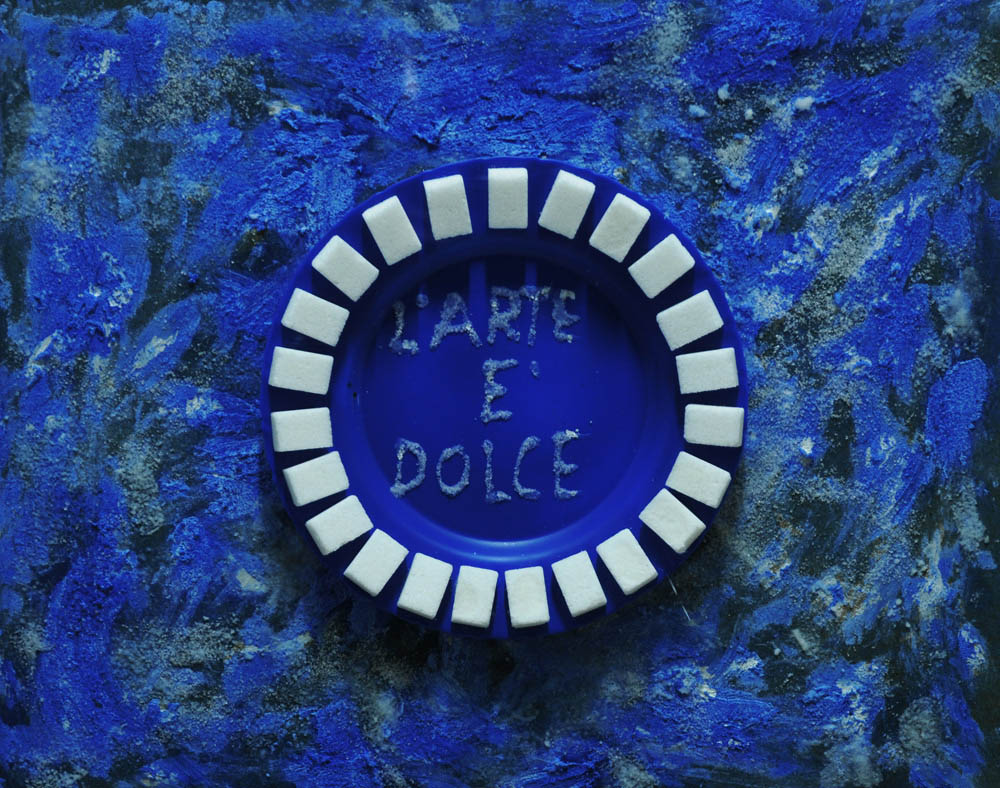 ALDO MONDINO 1938 - 2005 " L'arte è dolce ", anni 70 Tecnica mista e collage su tavola, cm. 40 x 50 Firmato sul retro Etichetta Galleria Il Punto sul retro Prov. Collezione Privata