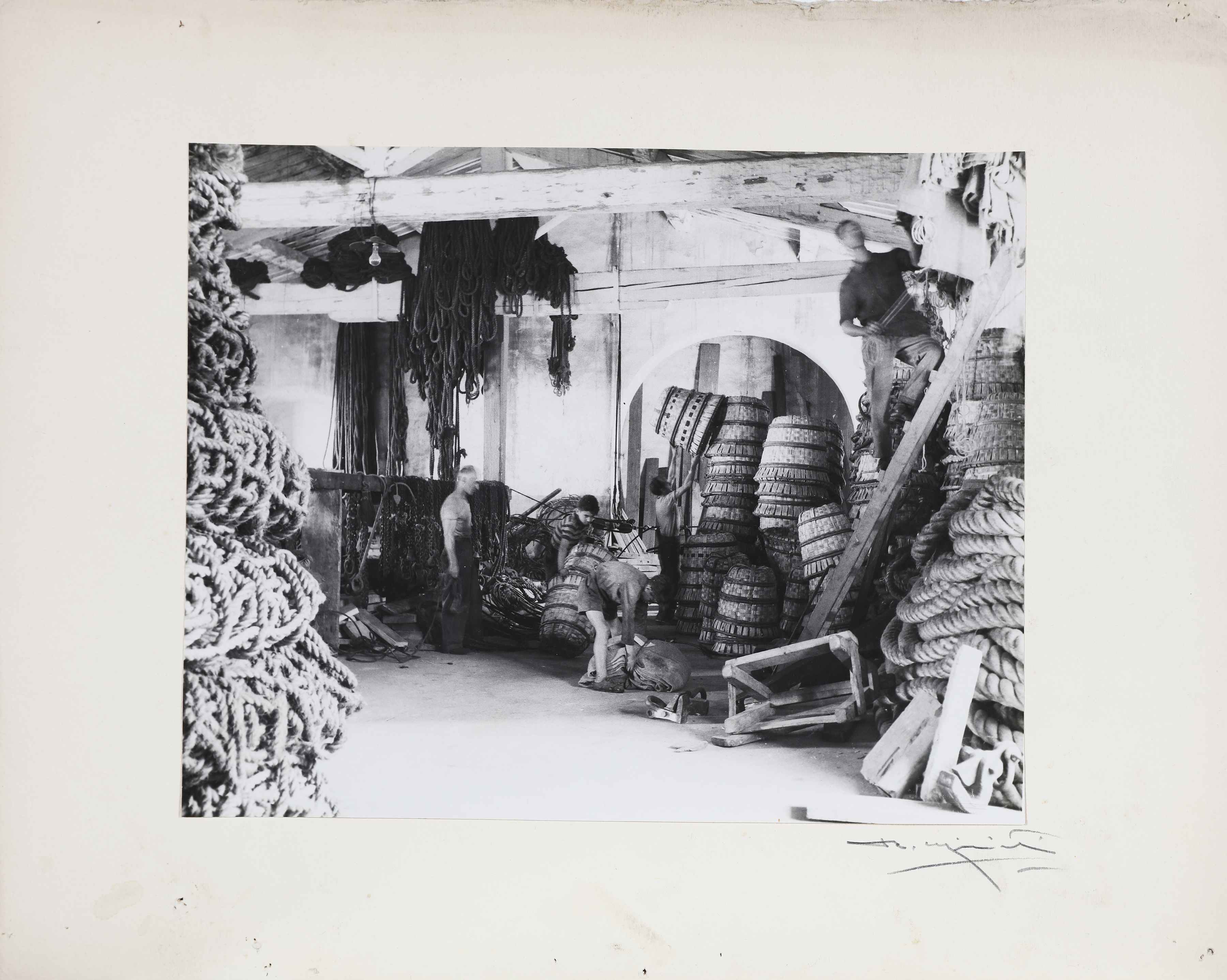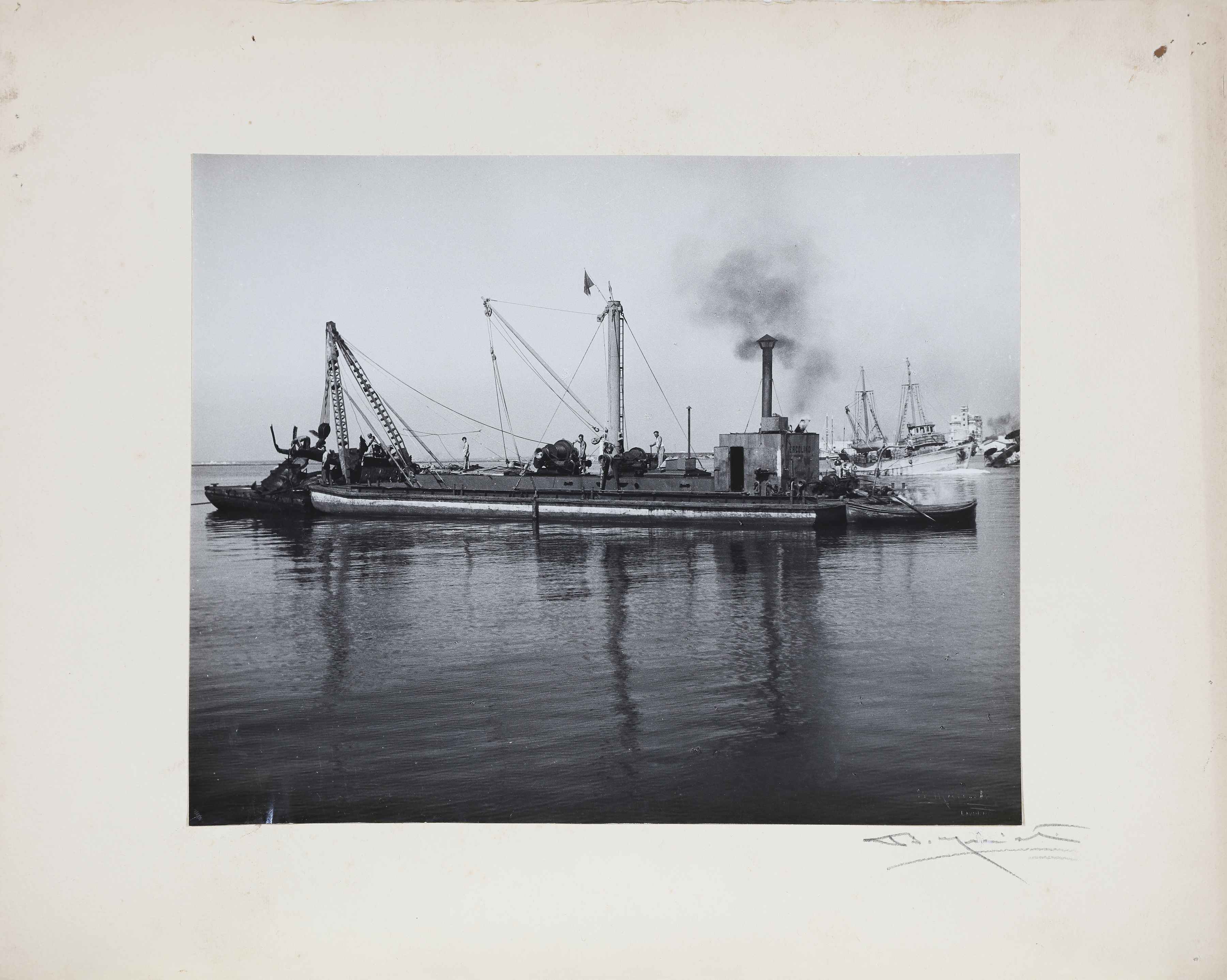 MINIATI BRUNO (1889 - 1974) Porto di Livorno. Lotto composto da n.3 stampe. Stampa alla gelatina d'argento. Cm 29,70 x 23,70. Montata su cartoncino (35,3 x34 cm). Timbro a secco con credito dell'artista sulle immagini e firma a matita sul cartoncino sotto la fotografia. 1950 circa.