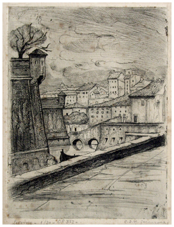 RAOUL DAL MOLIN FERENZONA Firenze 1879 – Milano 1946 Livorno Acquaforte es.1/30. Firma in b. a d.; località + scritta “OP. 372” in b. a s.; monogramma “R.D.M.F.” sulla lastra in b. a d.; sul catone di chiusura scheda fotocopiata dell’artista. (18,2 x 14 foglio – 16,8 x 12,8 inc.) B.A.: 50