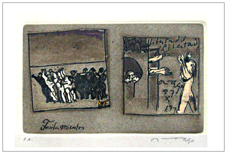 JOSE’ ORTEGA Arroba de los Montes (Spagna) 1923 – Parigi (Francia) 1991 Fusilamientos Acquaforte e acquatinta a colori es.P.A. Firma in b. a d., titolo sulla lastra in b. a s. (30 x 40 foglio – 12 x 19 inc.) B.A.: 50