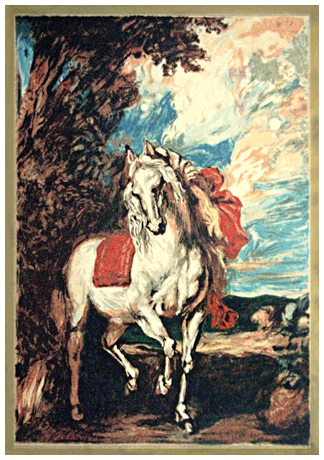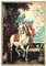 GIORGIO DE CHIRICO Volos (Grecia) 1888 – Roma 1978 Cavallo “Omaggio a De Chirico” Serigrafia a colori su lastra dorata es.69/100. Firma sulla lastra in b. a s. (32 x 23 lastra – 29,5 x 21,5 ser.) Certificato di autenticità e provenienza con timbri parzialmente leggibili “Tempio dell’Arte Contemporanea..” applicato sul retro della cornice. B.A.: 250