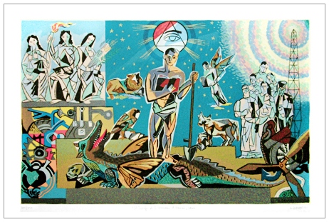 GINO SEVERINI Cortona 1883 – Parigi (Francia) 1966 Il trionfo di S. Tommaso d’Aquino 1949 Litografia a colori su carta Fabriano es.211/250. Firma sulla lastra in b. a d.; titolo e data in b. al c.; altra firma + timbro a secco “La Sfera, Roma” in b. a d.; in b. a s. timbro a secco “Stamperia d’Arte Grafiser, Roma”; sul verso timbro “2A Edizioni d’Arte” + firma Gina Severini Franchina. (49 x 69 foglio – 34 x 54,5 lito.) B.A.: 250