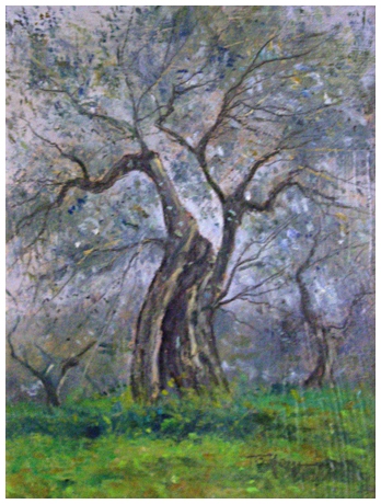 PIERO TONFONI Livorno 1944 – Livorno 2015 L’ulivo 2003 Olio su tavola 20 x 15. Firma in b. a d.; sul verso etichetta dell’artista e firma + timbro Antonio Amato, Livorno. B.A.: 100