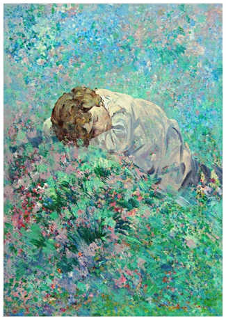 GIULIO DA VICCHIO Vicchio di Mugello 1925 – Livorno 2004 Tra i fiori (candore) Olio su tela 70 x 50. Firma in b. a d.; sul verso scritte (“P.M. – E.T.O.E.A.”), titolo e firma. B.A.: 600