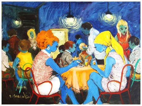 RENZO MERCATINI Chianni 1924 – Livorno 1984 Bar di sera 1970 Olio su tela 80 x 100. Firma in b. a s.; sul verso titolo, firma e data + timbro galleria La Saletta, Livorno. B.A.: 190