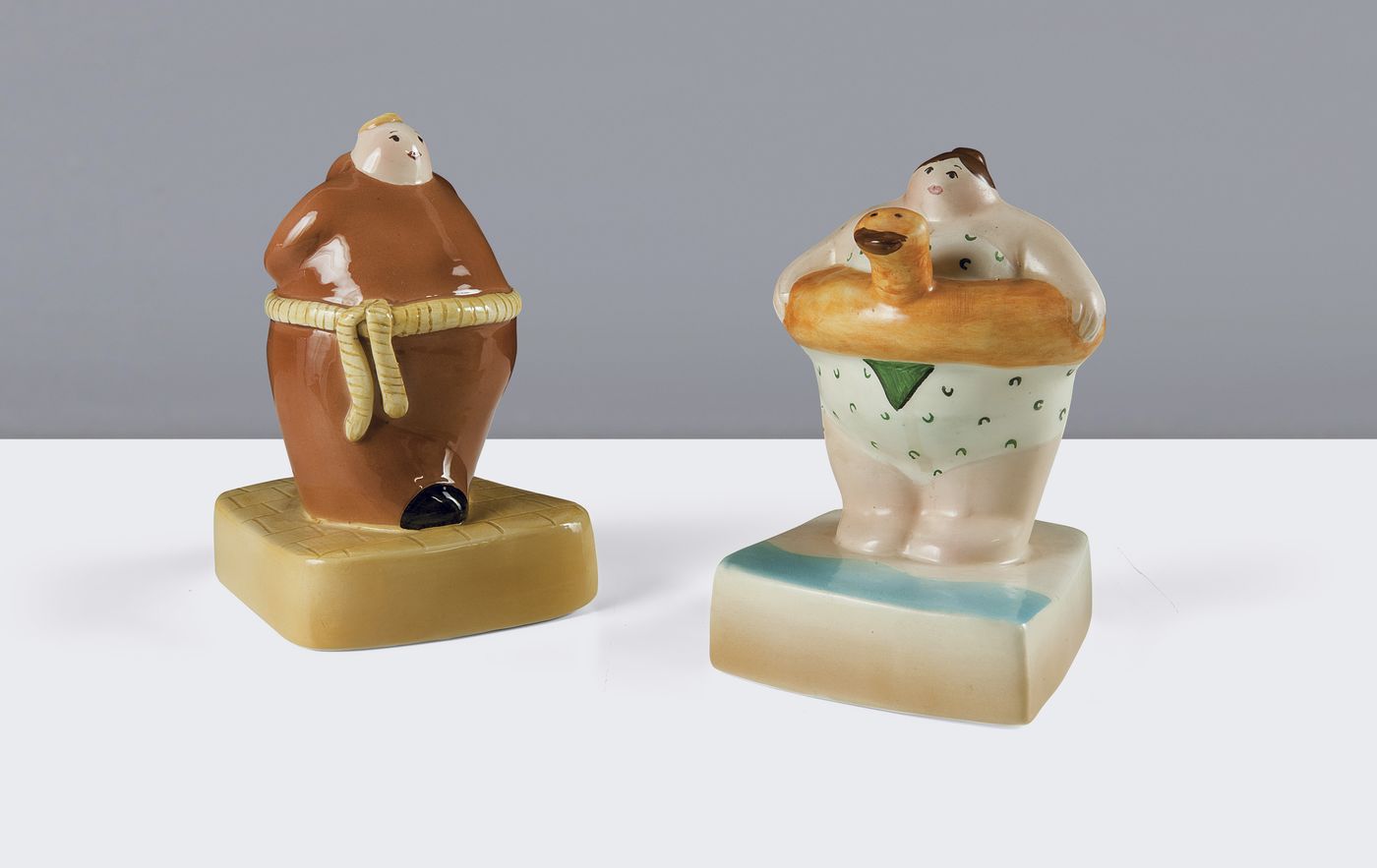 RONZAN ANTONIO - Coppia di due sculture raffiguranti un "Frate" e una "Bagnante con galleggiante", H 18 ceramica. Sculture firmate sotto la base