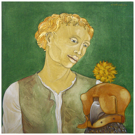GIOXE DE MICHELI Milano 1947 Il falconiere stregato 1973 Olio su tela 70 x 70. Firma e data in a. a d.; sul verso titolo, firma e data. B.A.: 250