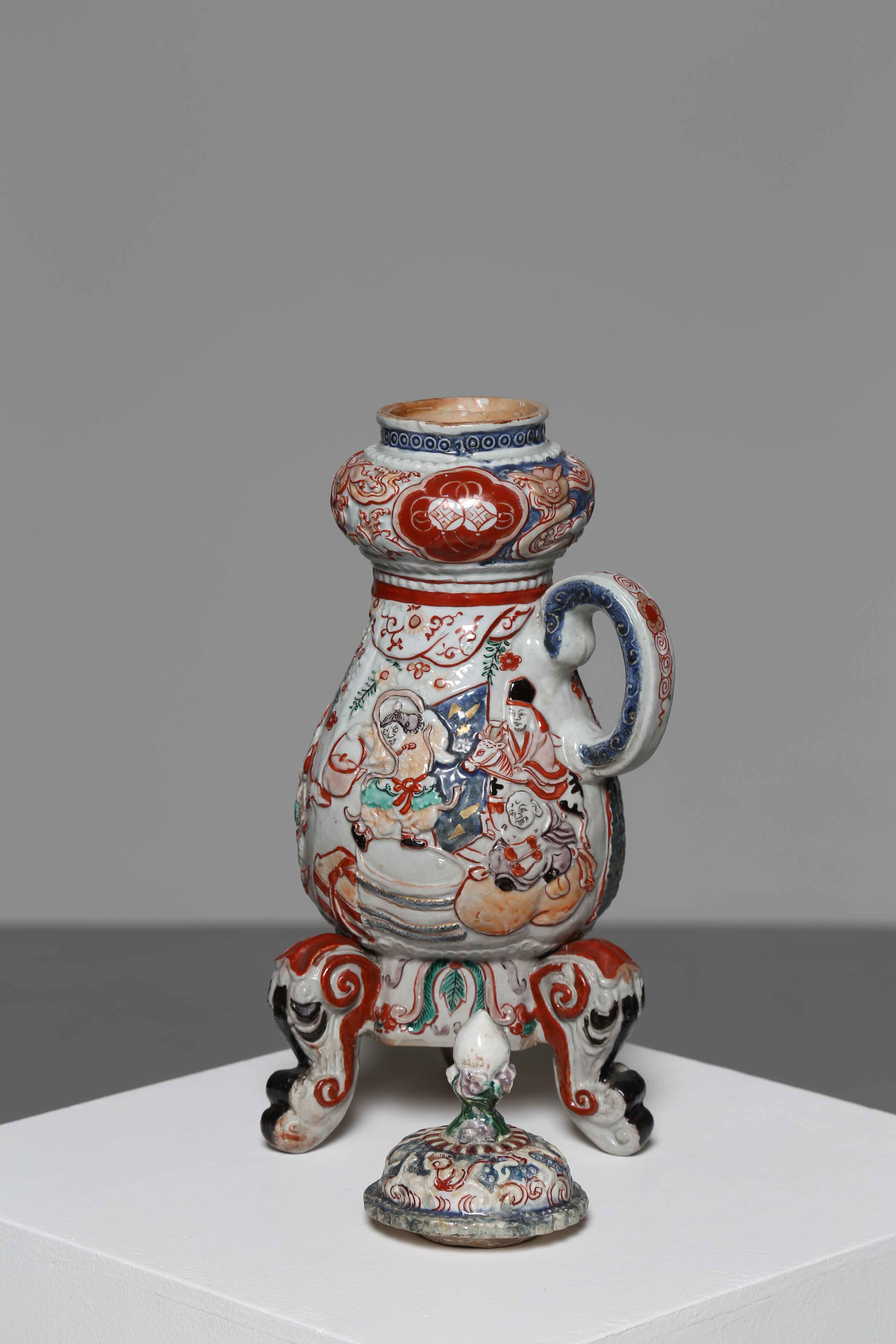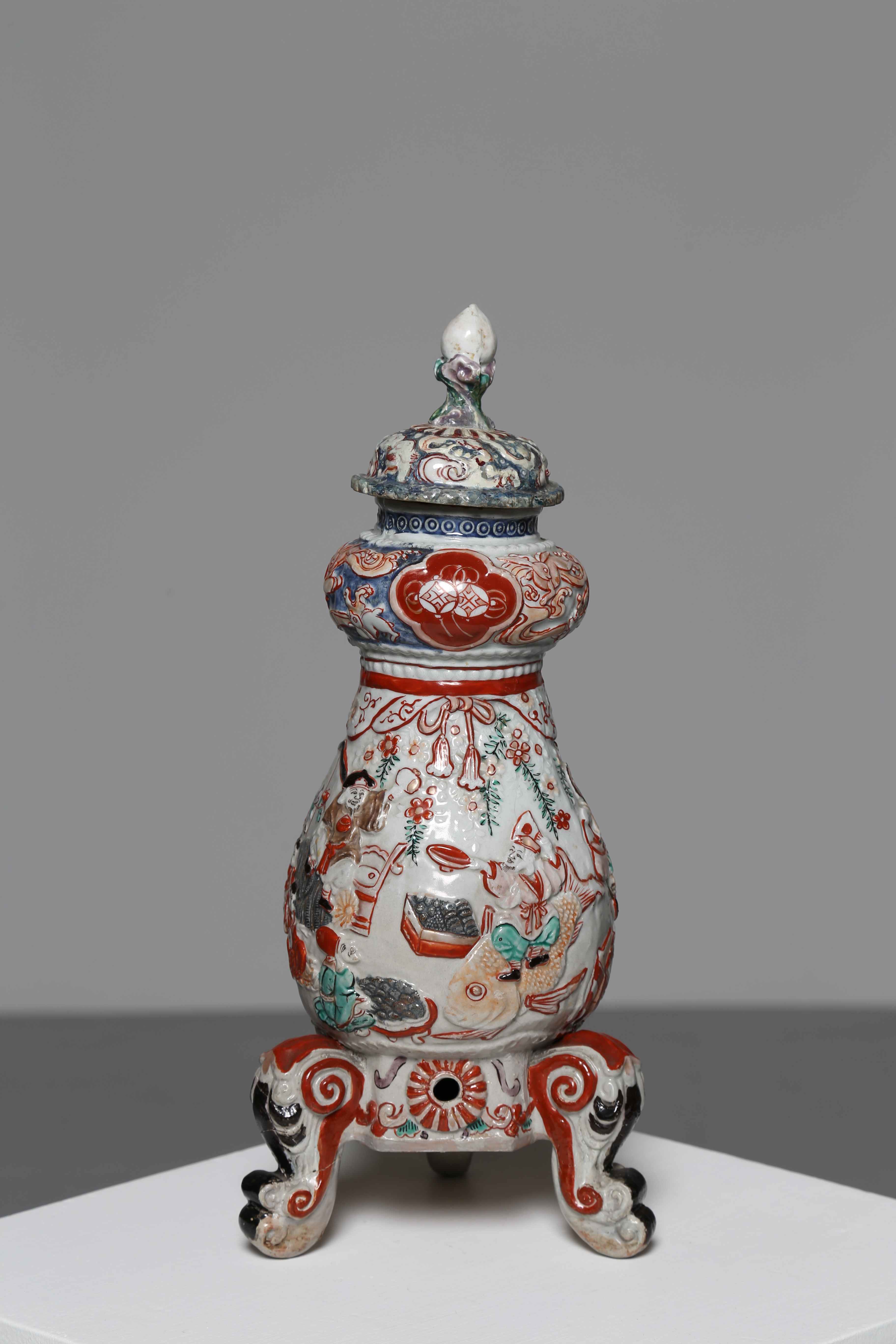 Arte Giapponese Vaso tripode Imari in ceramica Giappone, XVIII secolo. . Cm 36,00. Imponente vaso tripode completo di coperchio. L'affollata decorazione in rilievo tattile prevede grandi cartucce con figure, festoni ed elementi simbolici come la carpa. Altri animali affollano la zona rigonfia in prossimità del coperchio.