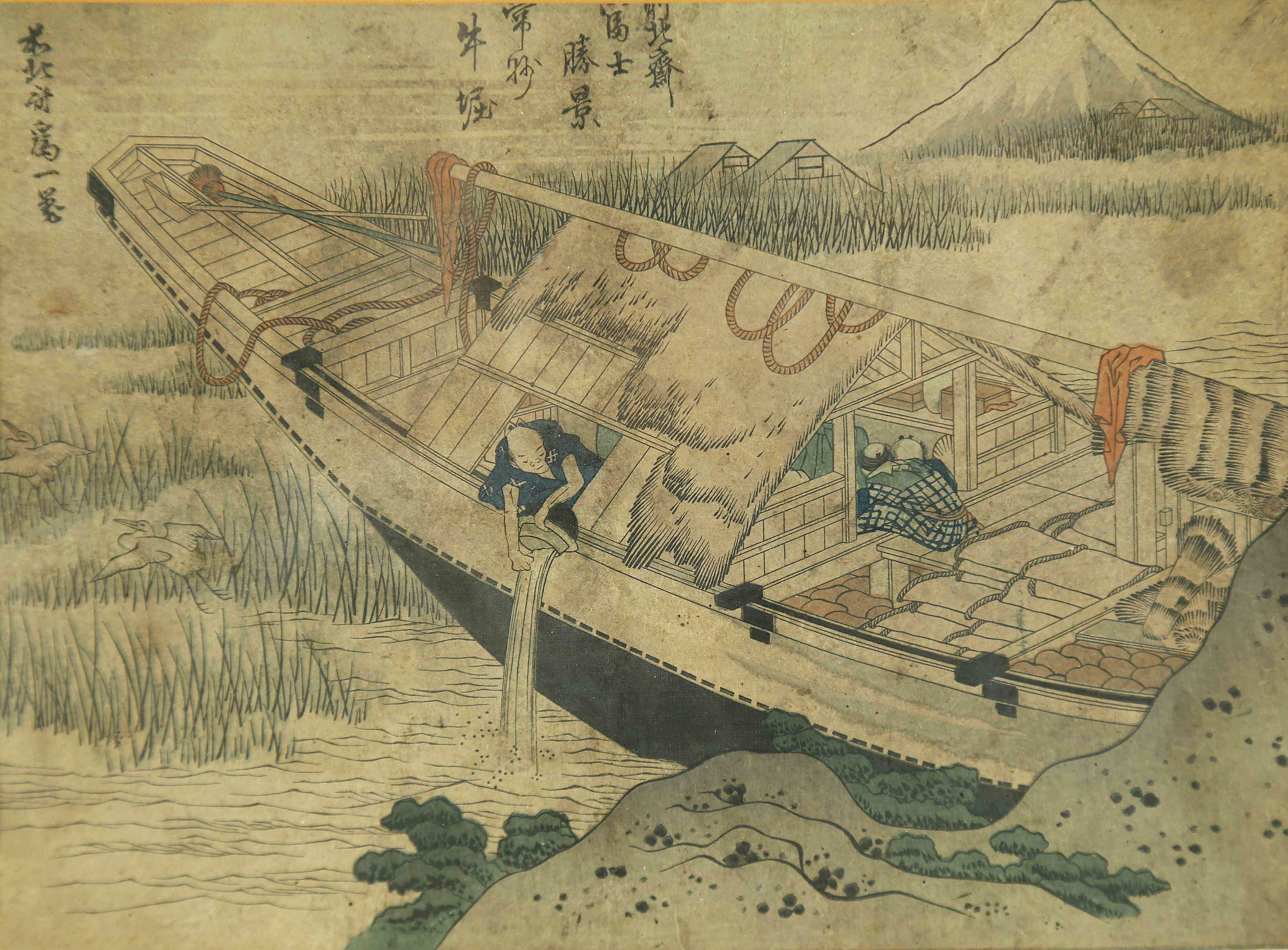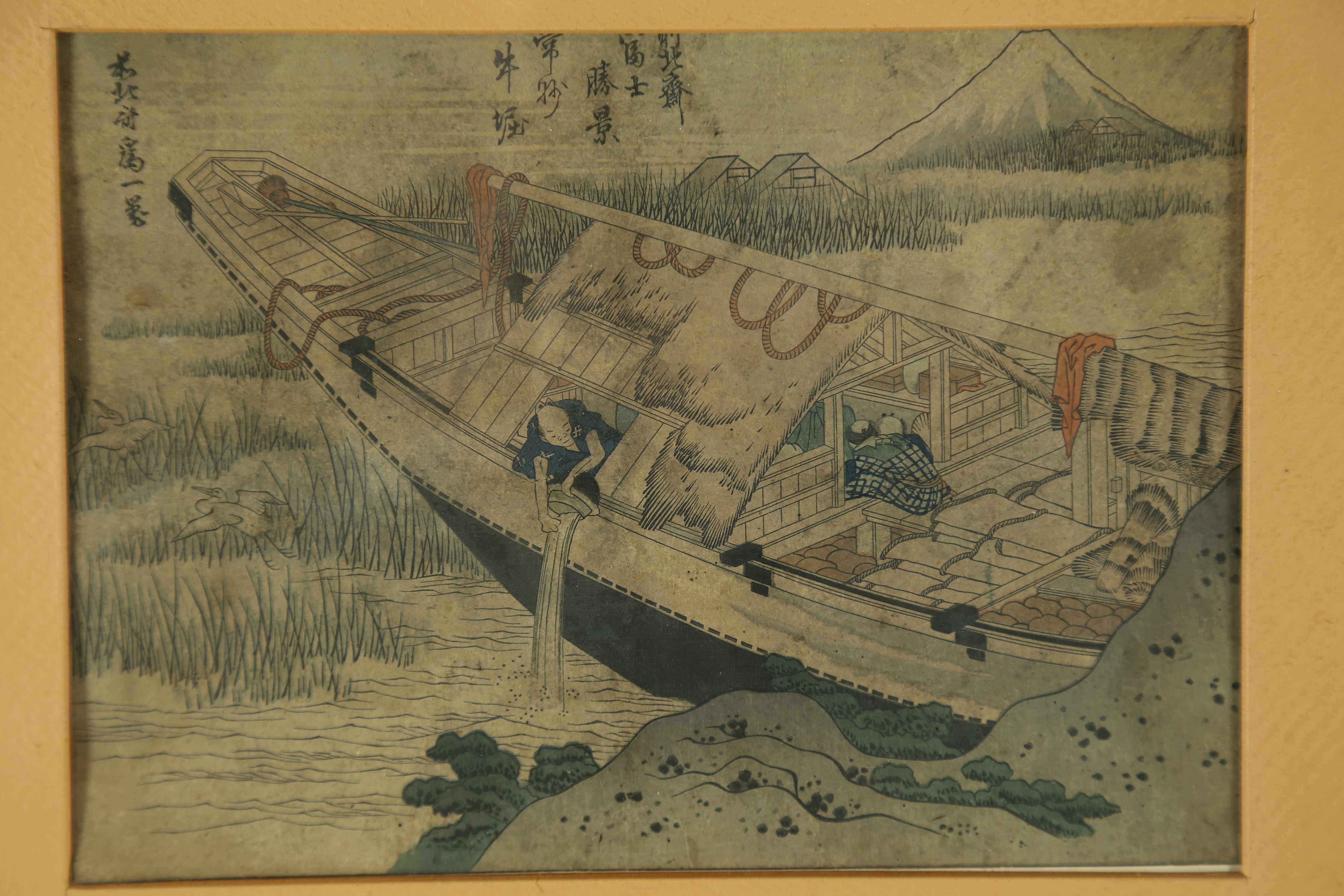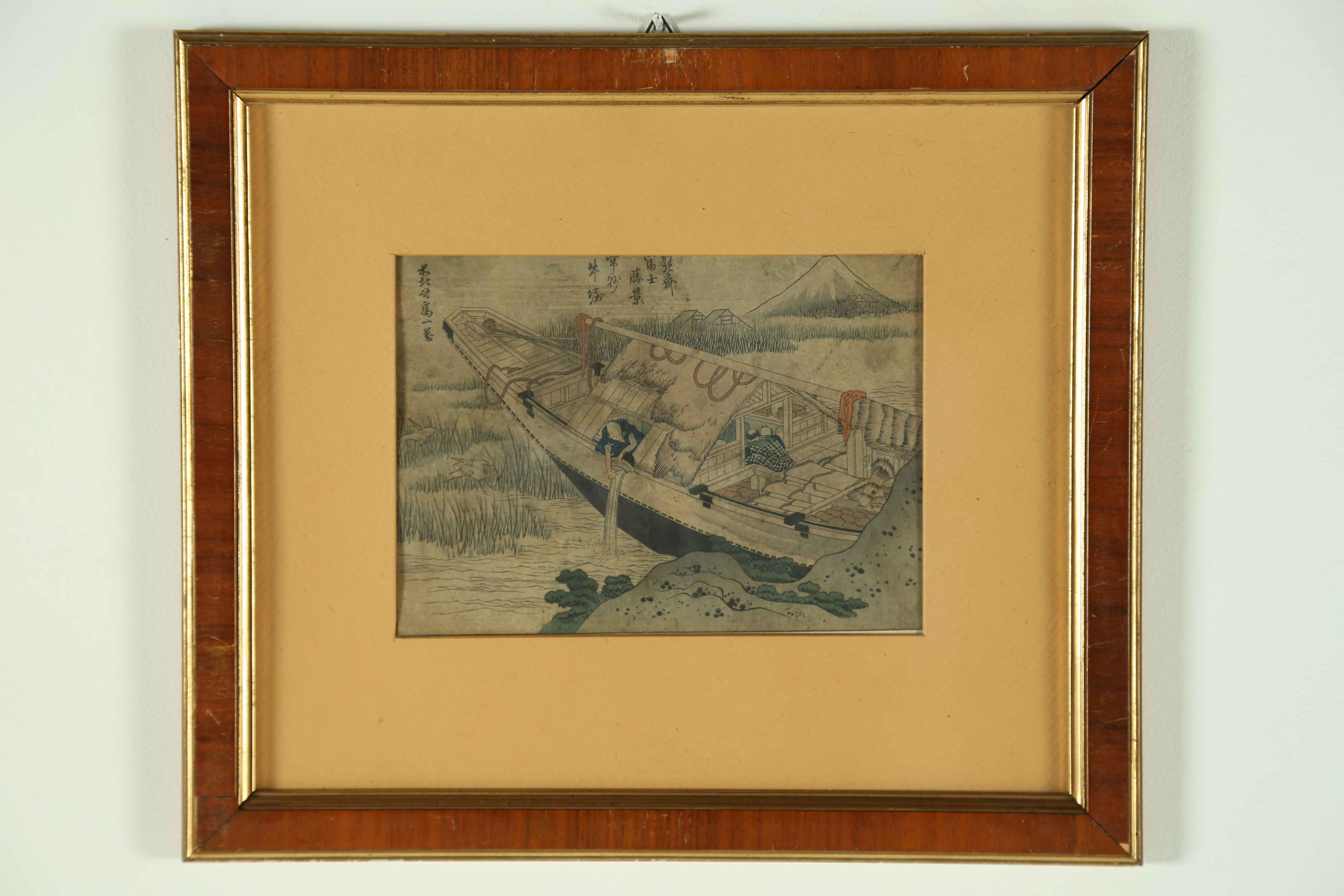 Arte Giapponese Katsushika Hokusai (1760 - 1849) Stampa raffigurante degli uomini in barca Giappone, periodo Edo Xilografia, inchiostro e colori su carta . . Cm 20,00 x 15,00. Katsushika Hokusai fu un grande pittore ed incisore del periodo Edo, divenuto celebre soprattutto per la serie di stampe sulle vedute del Monte Fuji. I suoi lavori furono fonte d'ispirazione per i coevi impressionisti francesi. Cornice presente