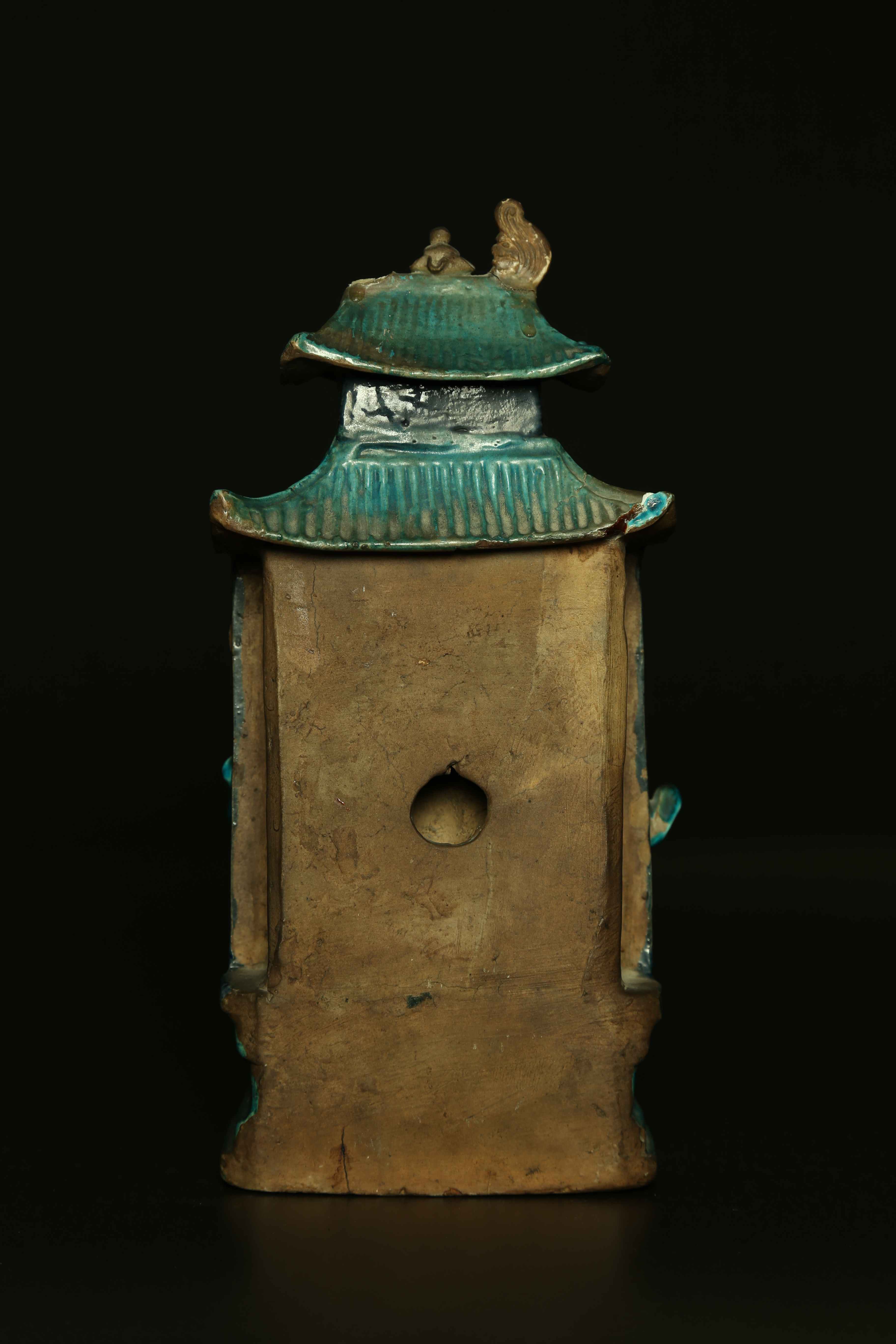 Arte Cinese Modello di pagoda in ceramica turchese con attendenti Cina, dinastia Ming, XVI secolo. . Cm 13,00 x 30,00. Modellino di edificio con eminenza assisa in posizione centrale e due attendenti ai lati. Il retro, alcune parti dell'edificio e dei corpi sono lasciate senza invetriatura.