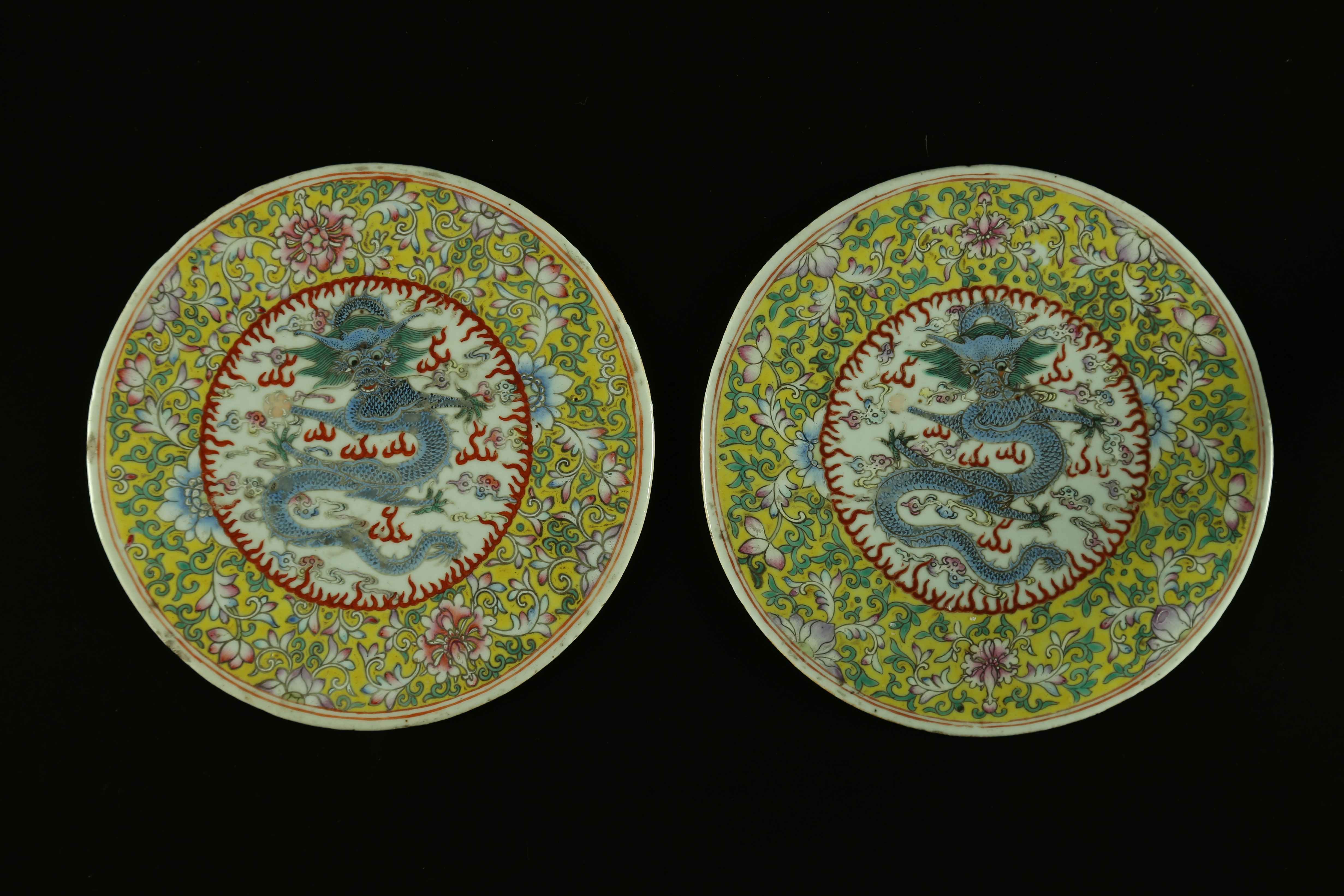Arte Cinese Coppia di tonde placche in porcellana dipinta con dragone centrale e fiori su fondo giallo Cina, dinastia Qing, periodo Guangxu, XIX secolo. . Cm 21,50.