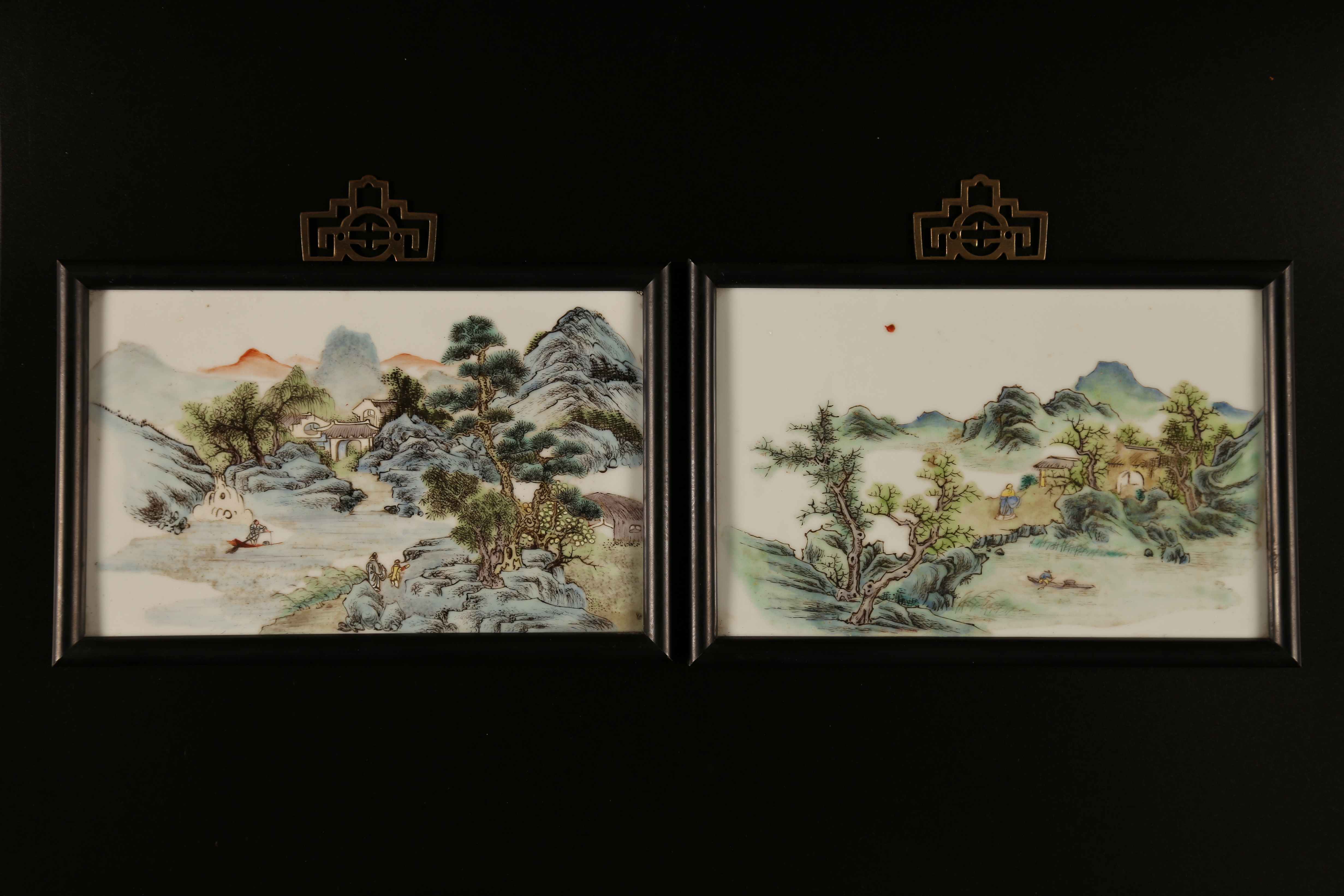 Arte Cinese Coppia di piastrelle in porcellana Cina, periodo Repubblica, inizio XX secolo. . Cm 22,00 x 14,50. Coppia di piastrelle raffiguranti un paesaggio lacustre entro cornice.