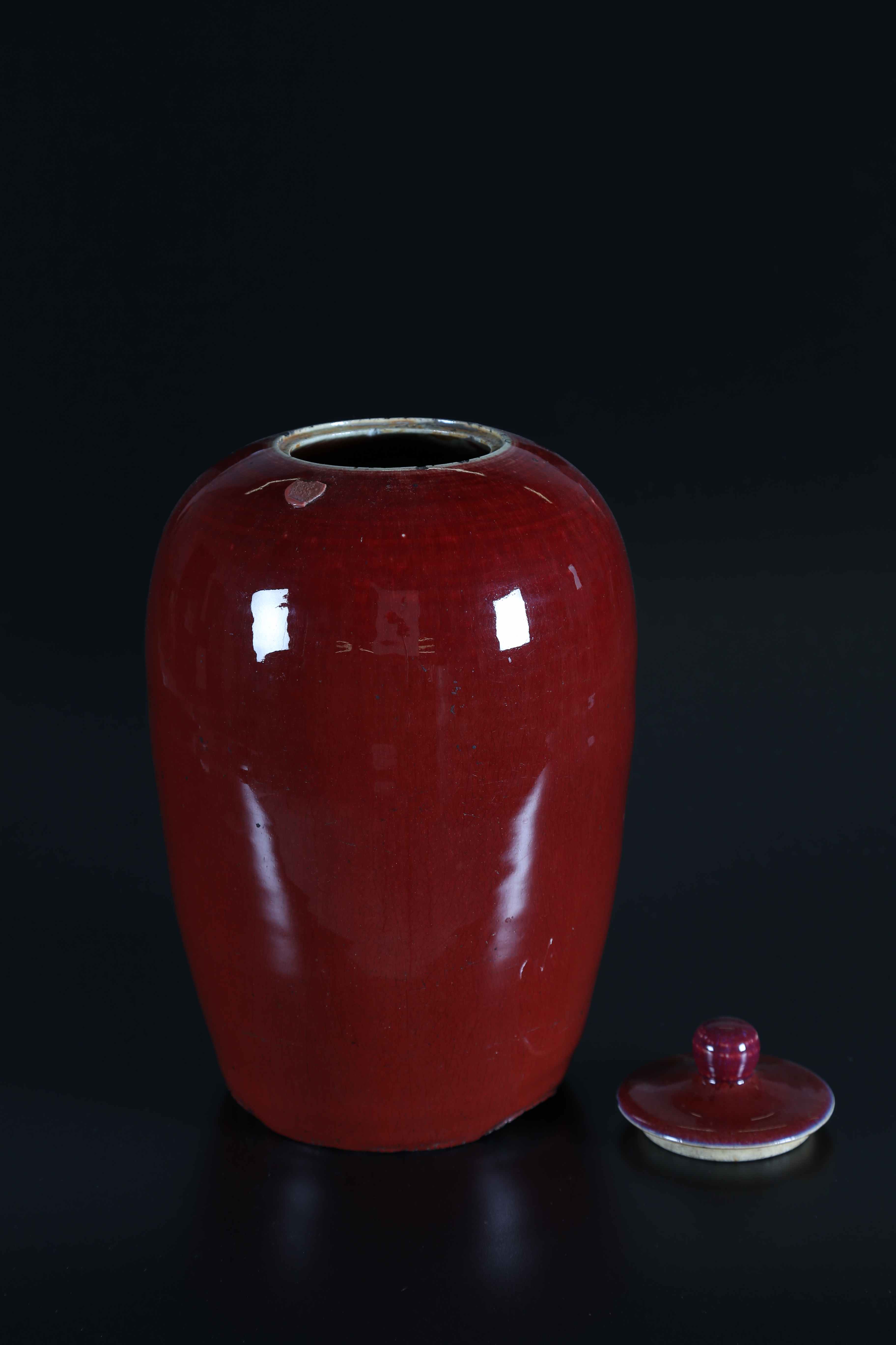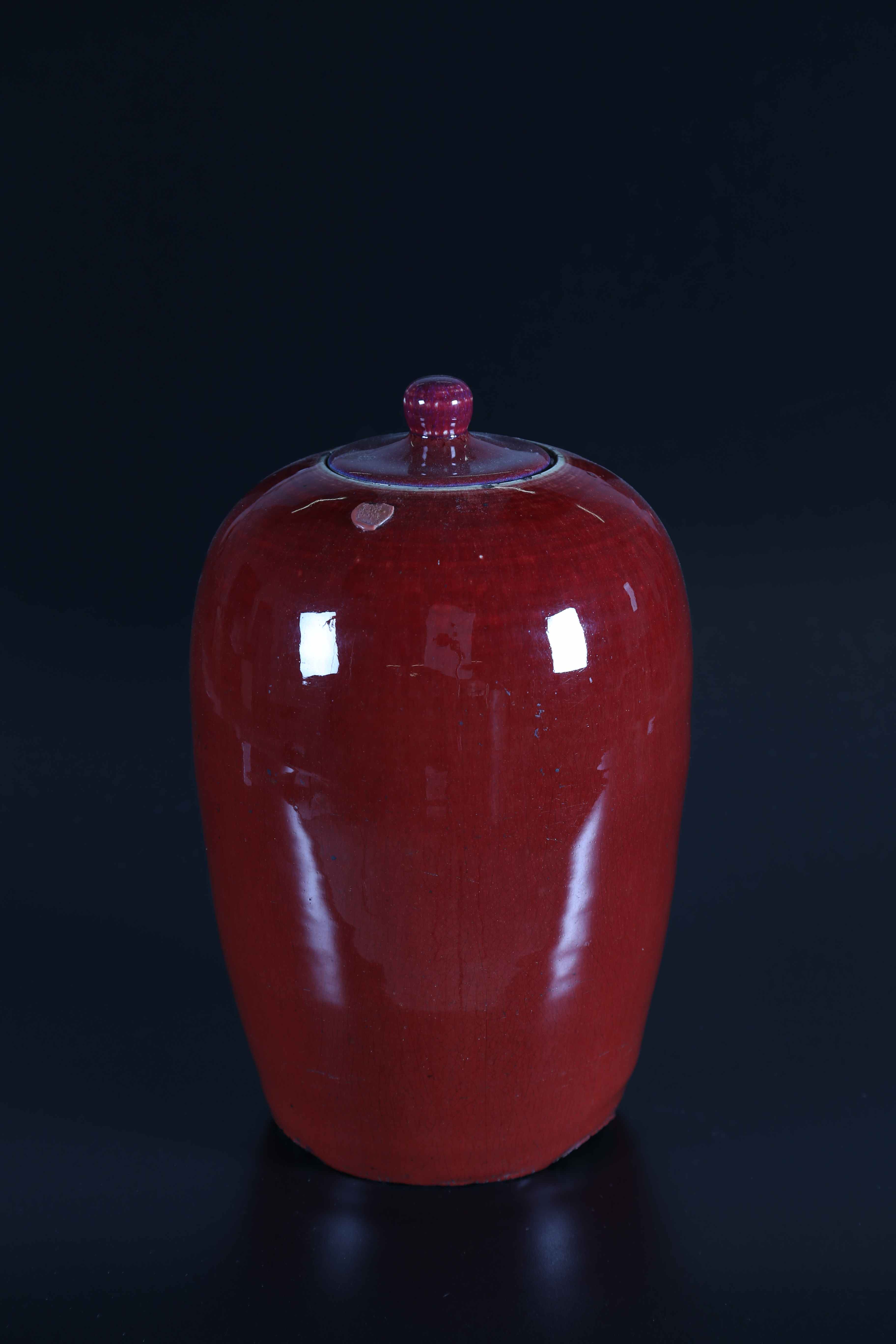 Arte Cinese Meiping sang de beuf Cina, dinastia Qing, XIX secolo. . Cm 31,00. Meiping in porcellana invetriata di rosso corredato di coperchio. Scheggiature sulla base e sul bordo superiore.
