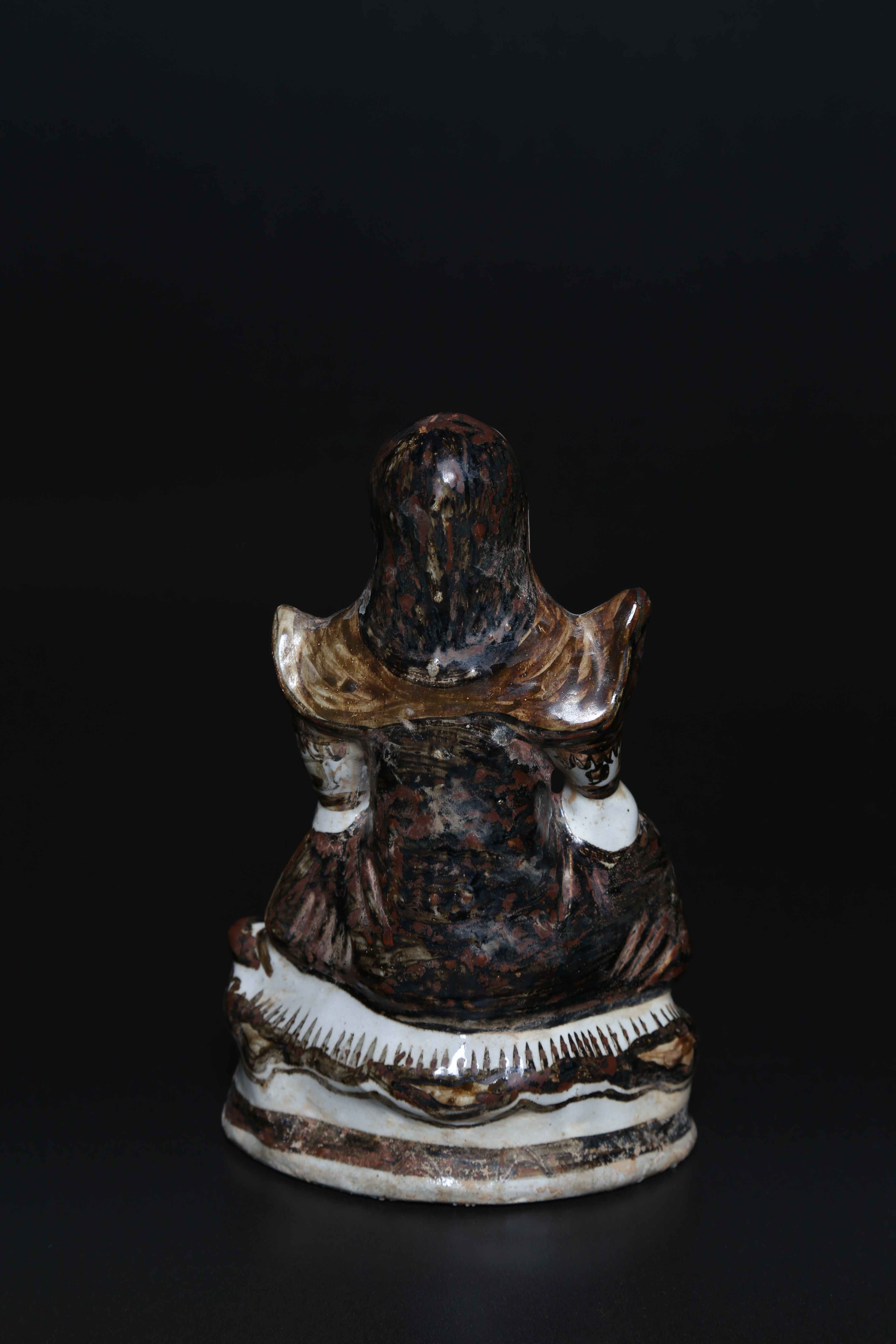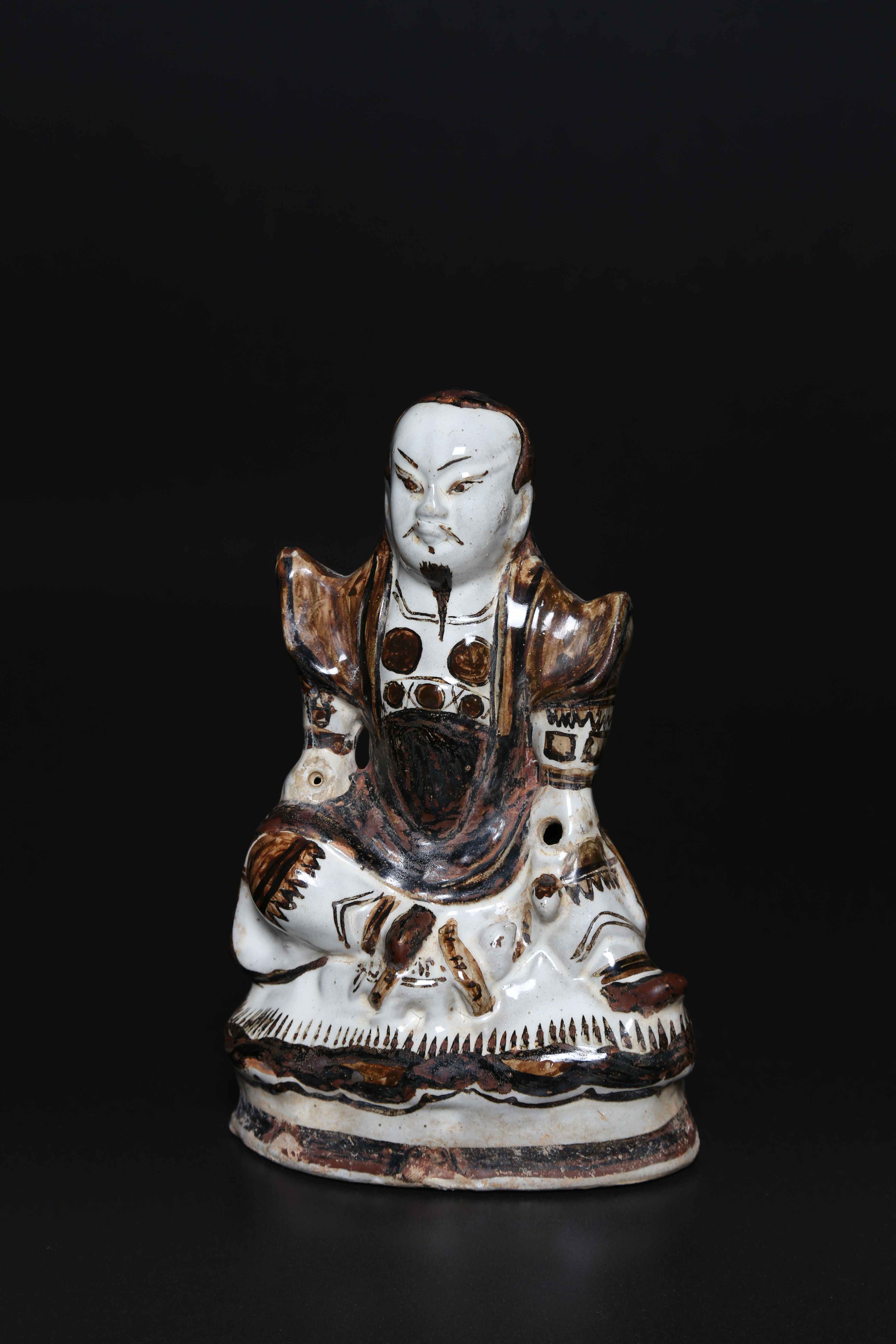 Arte Cinese Statua in porcellana raffigurante Guandì Cina, dinastia Yuan/Ming, XIV - XVI secolo . -. Cm 22,00. Piccola raffigurazione popolare della divinità guerriera in porcellana dipinta nella tipologia Cizhou. I fori passanti per le mani lasciano intendere che in origine portasse qualcosa.