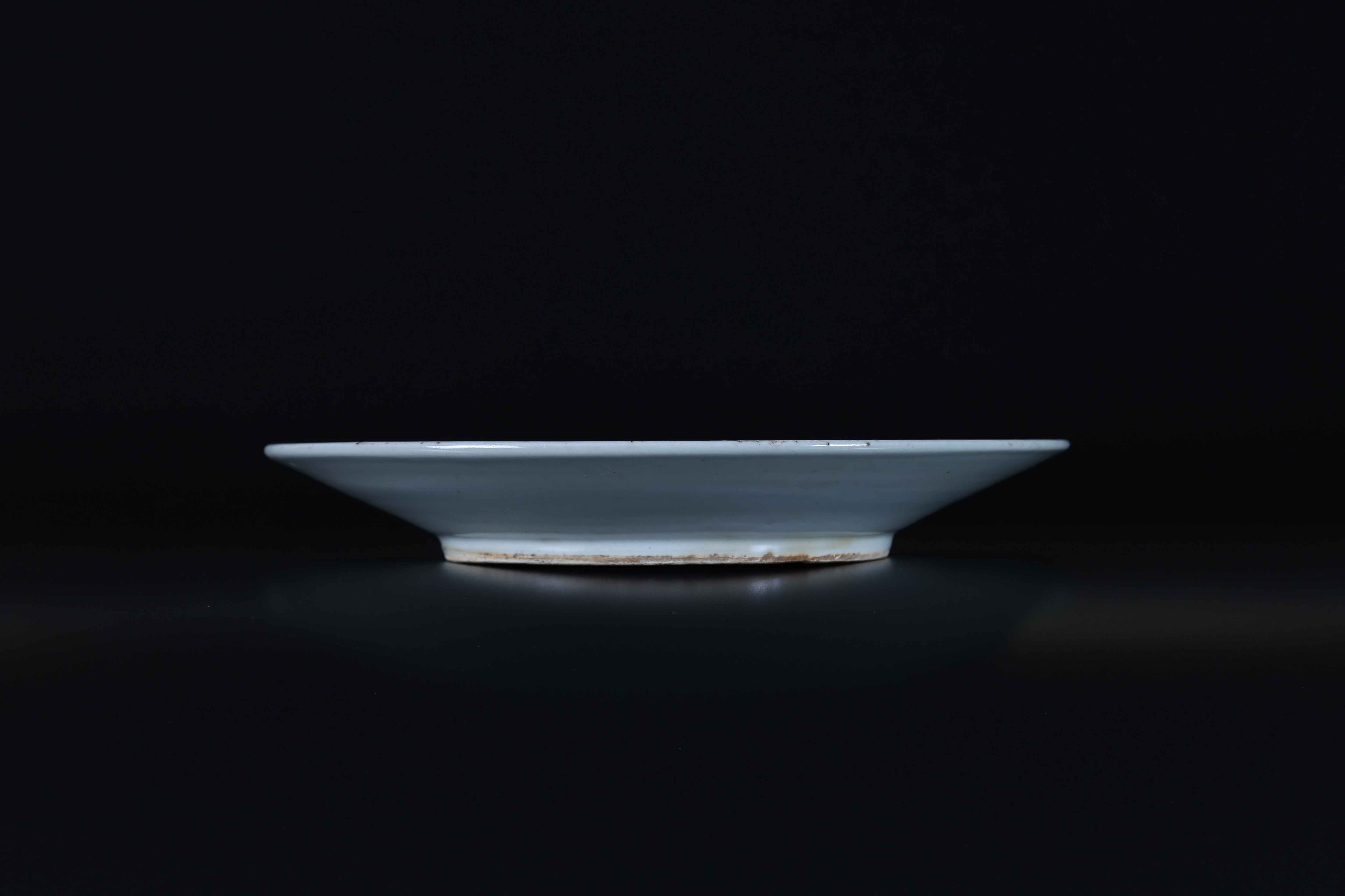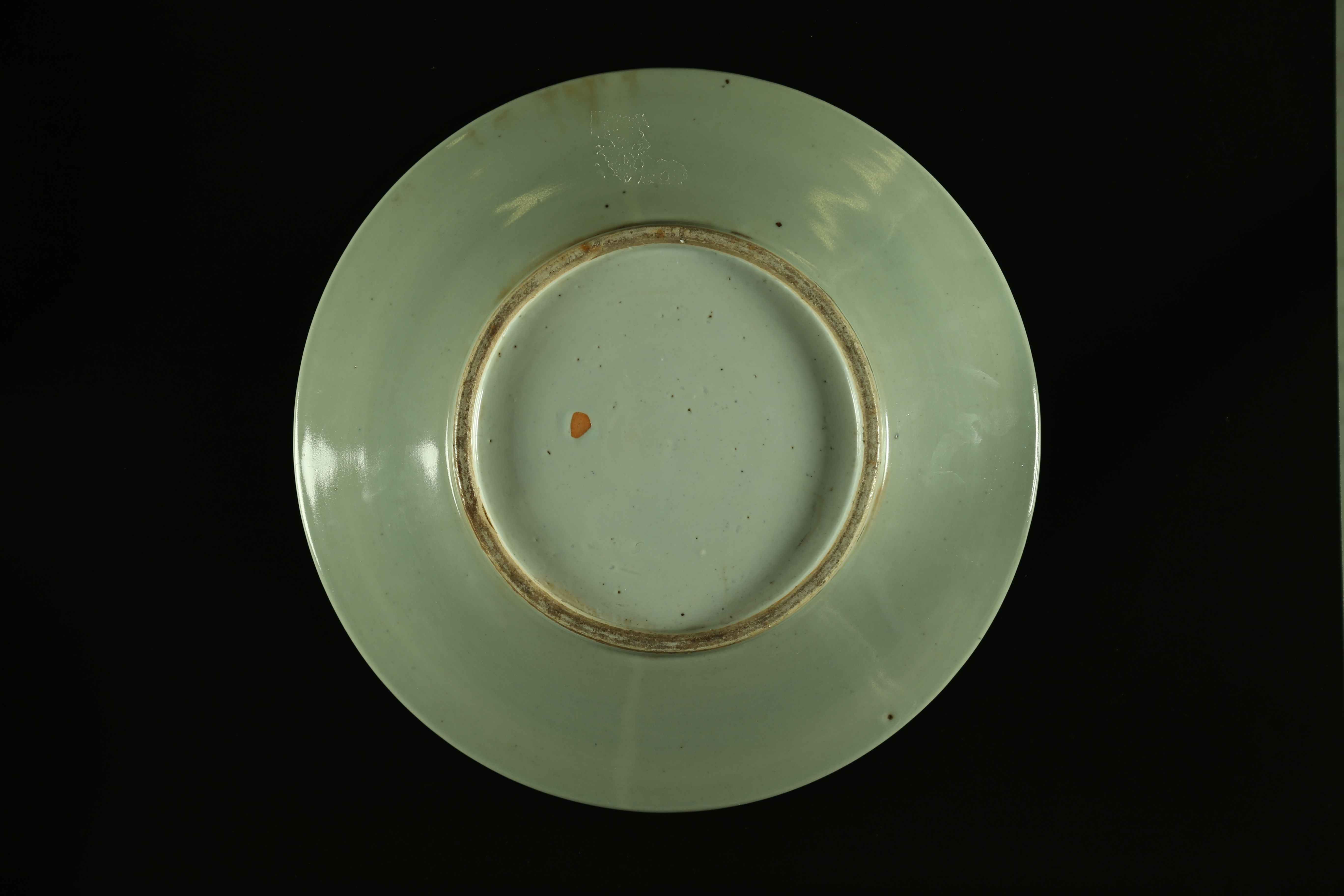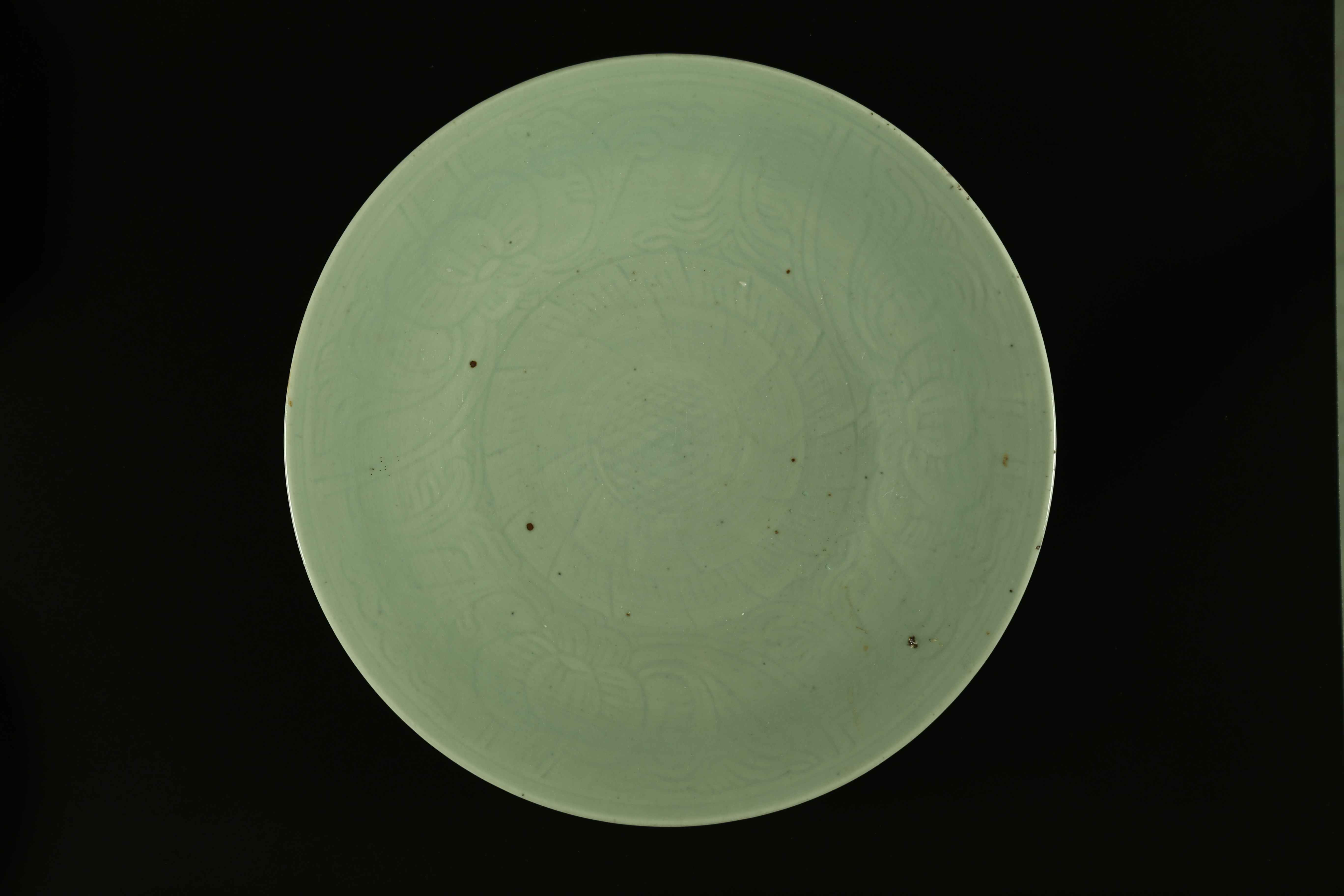 Arte Cinese Piatto in porcellana celadon Cina, XIX secolo. . Cm 34,50. Piatto ad ampia tesa poggiante su disco decorato con motivi floreali e vegetali.