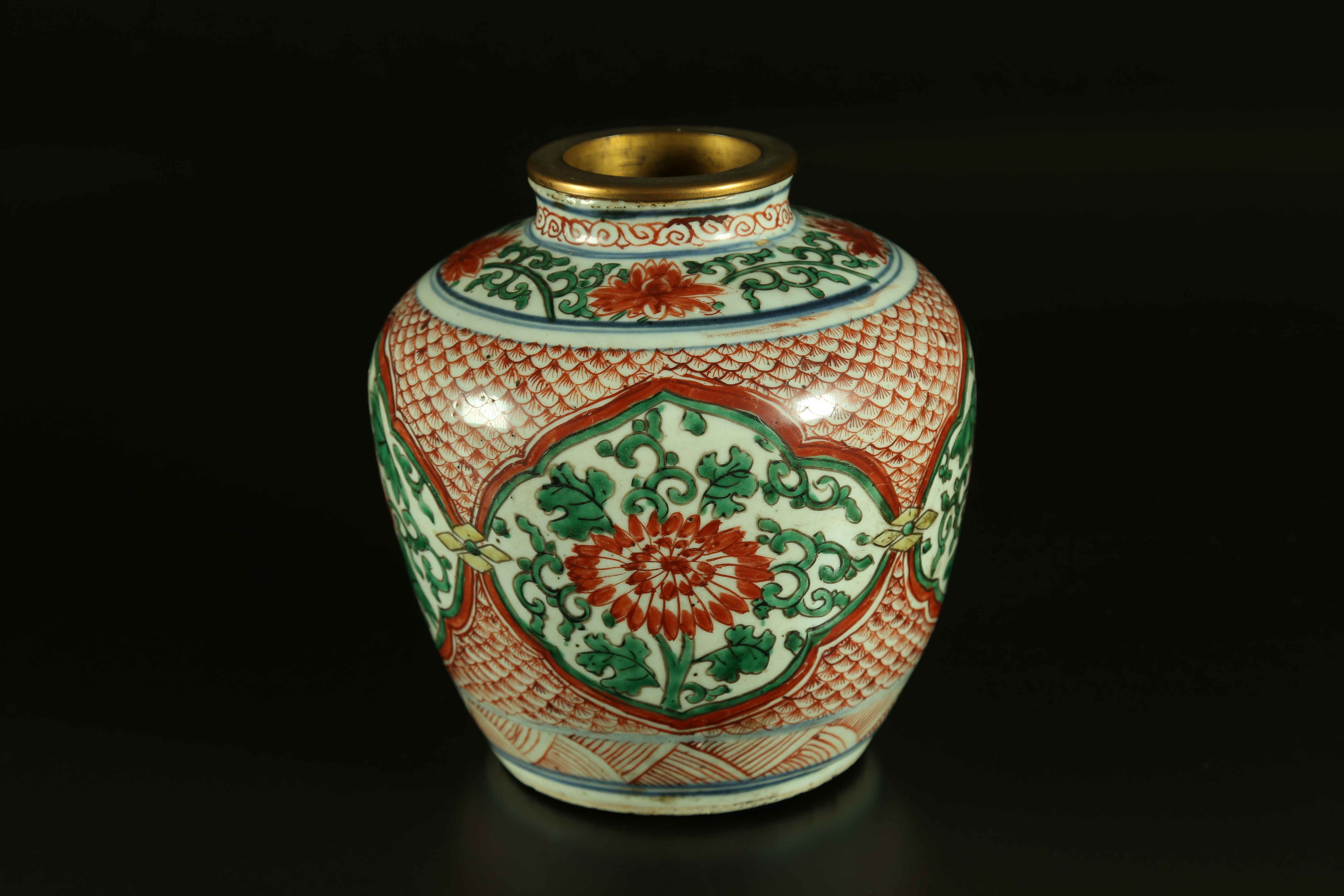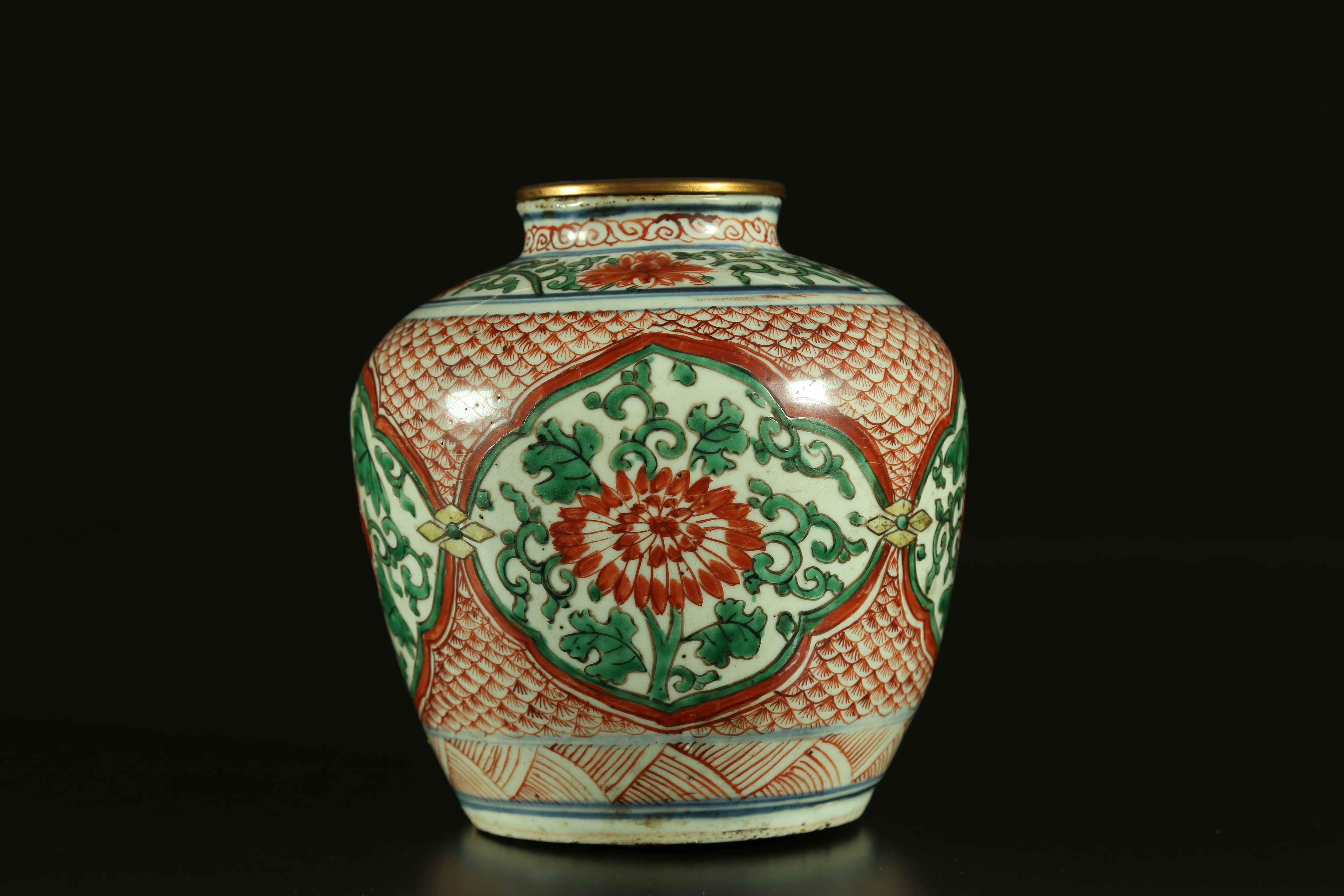 Arte Cinese Vaso wucai in porcellana Cina, dinastia Qing, periodo Shunzhi 1644 - 1661 o posteriore. . Cm 20,00. Vaso dipinto con riserve lobate contenenti fiori rossi tra tralci verdi bordati di nero, su fondo di minute scaglie di pesce.