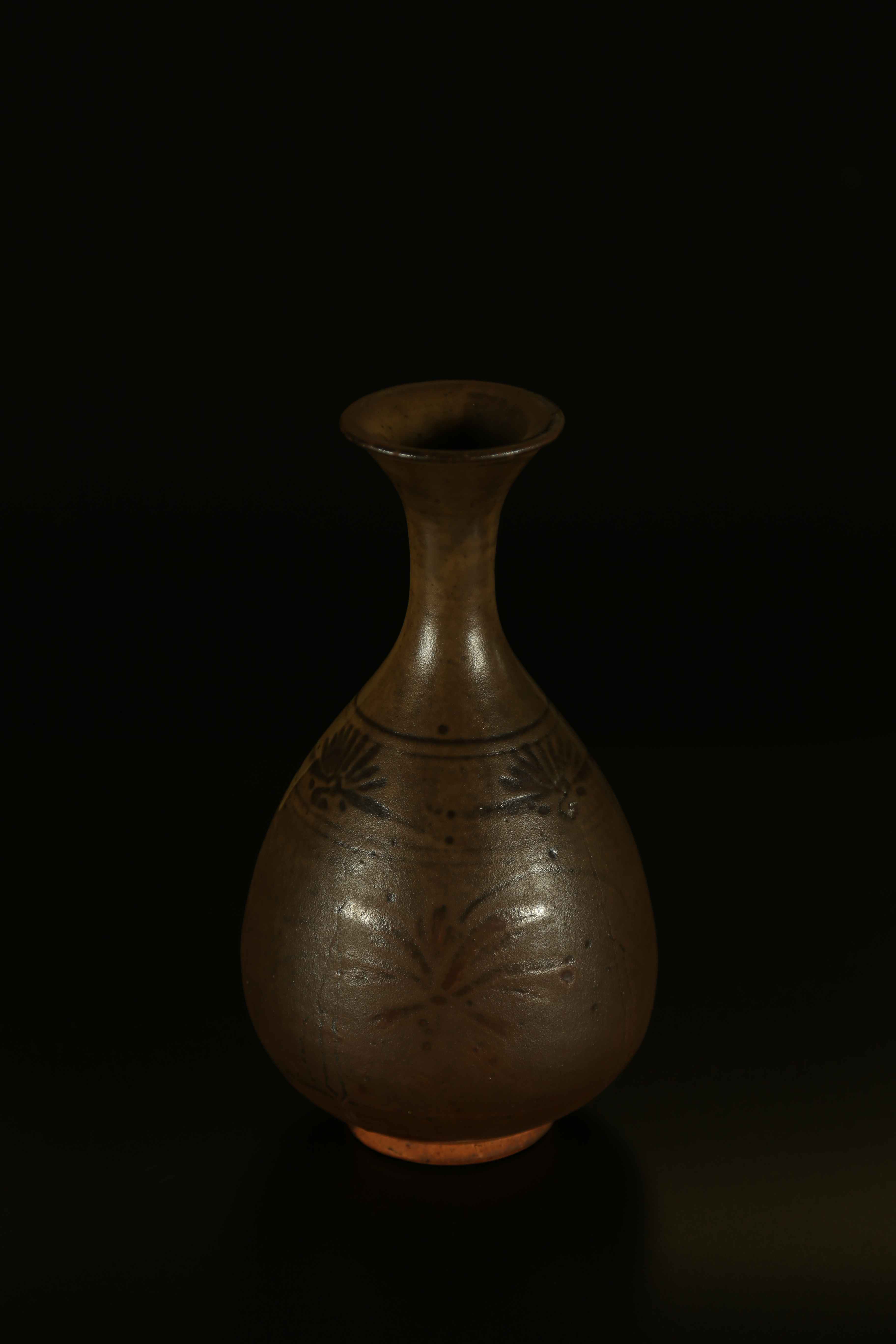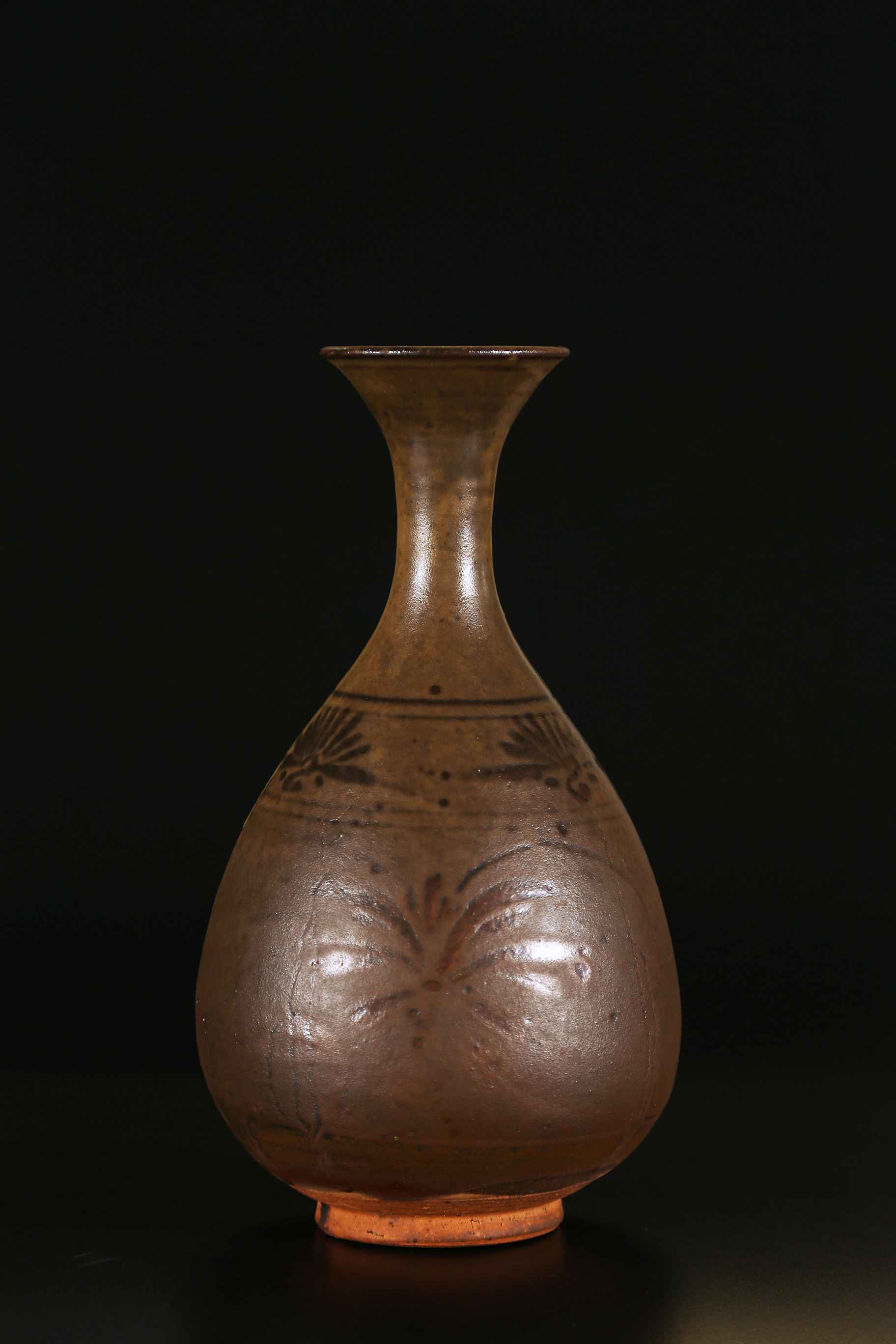 Arte Cinese Vaso Yuan in terracotta Cina, dinastia Yuan, XIII - XIV secolo . -. Cm 7,60 x 27,50. Vaso poggiante su disco, il corpo con ampia pancia, stretto collo e bocca estroflessa. Il vaso è ricoperto di vetrina opaca e decorato con motivi vegetali.