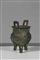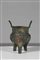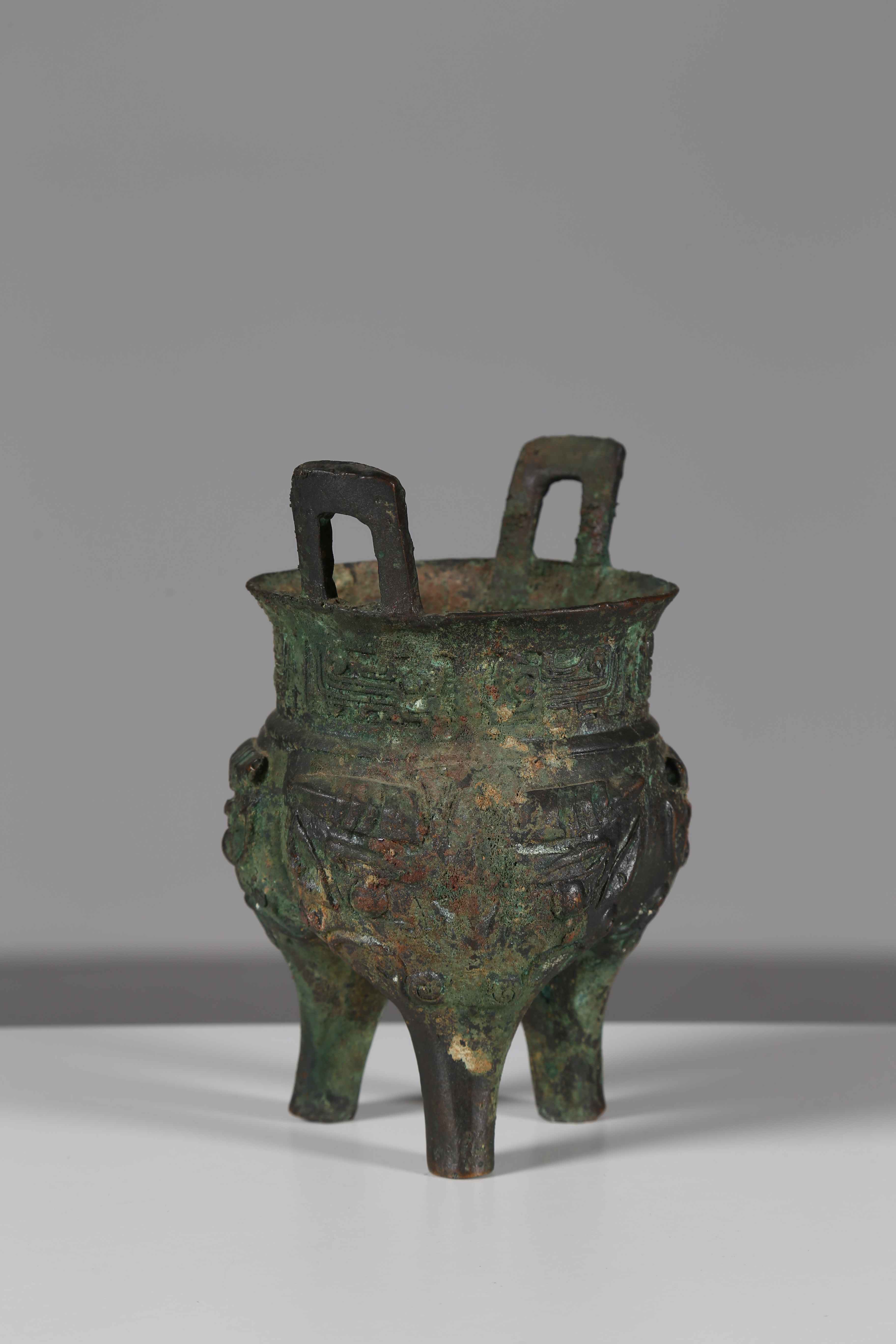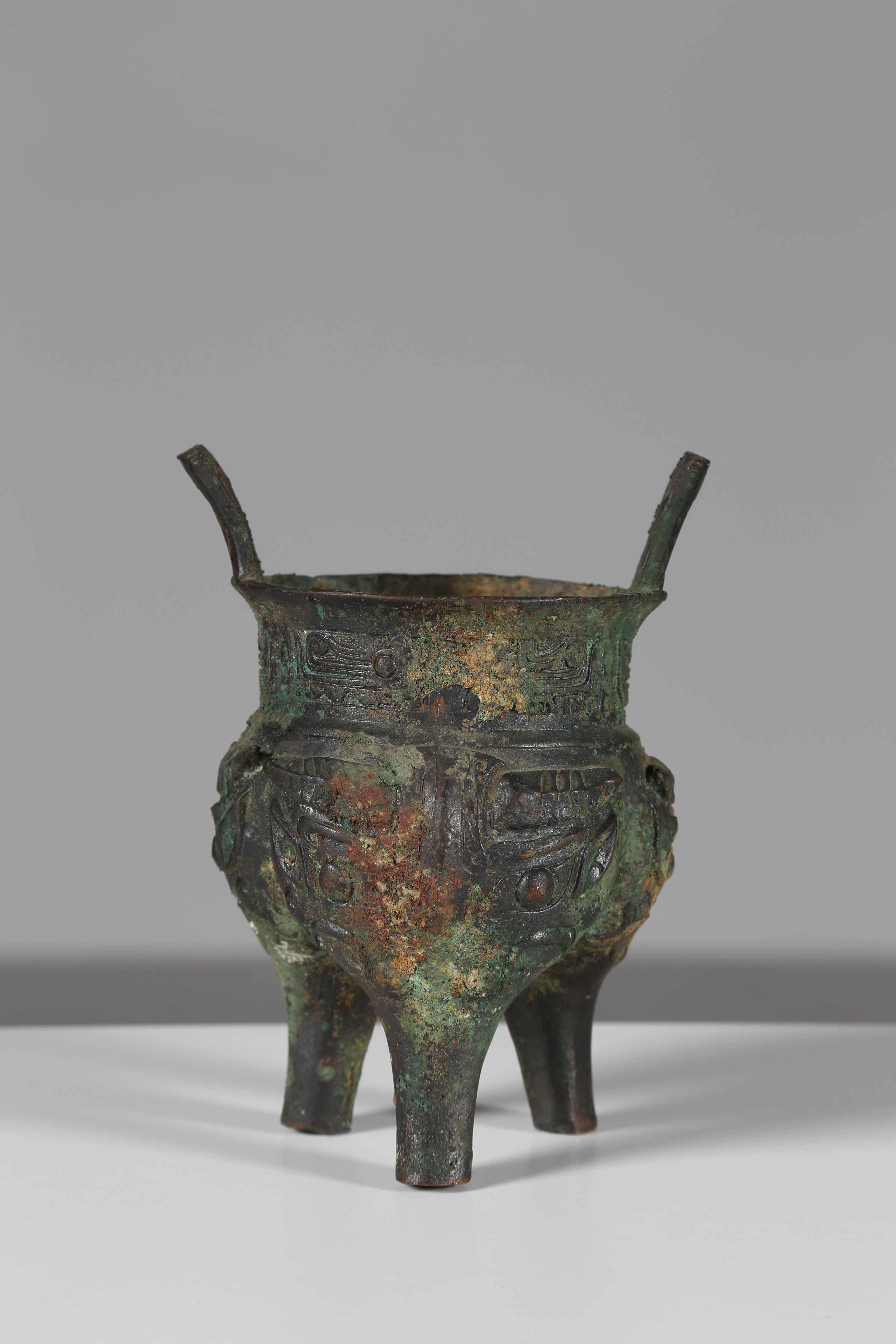 Arte Cinese Tripode in bronzo Liding Cina, periodo Shang, XV - X secolo AC. -. Cm 10,00 x 18,50. Piccolo bronzo rituale per cibo, caratterizzato dalla specifica forma Liding e dalla decorazione stampata raffigurante tre taotie in corrispondenza di ciascuna gamba. L'oggetto termina con due lunghi manici che si innestano sulla bocca.
