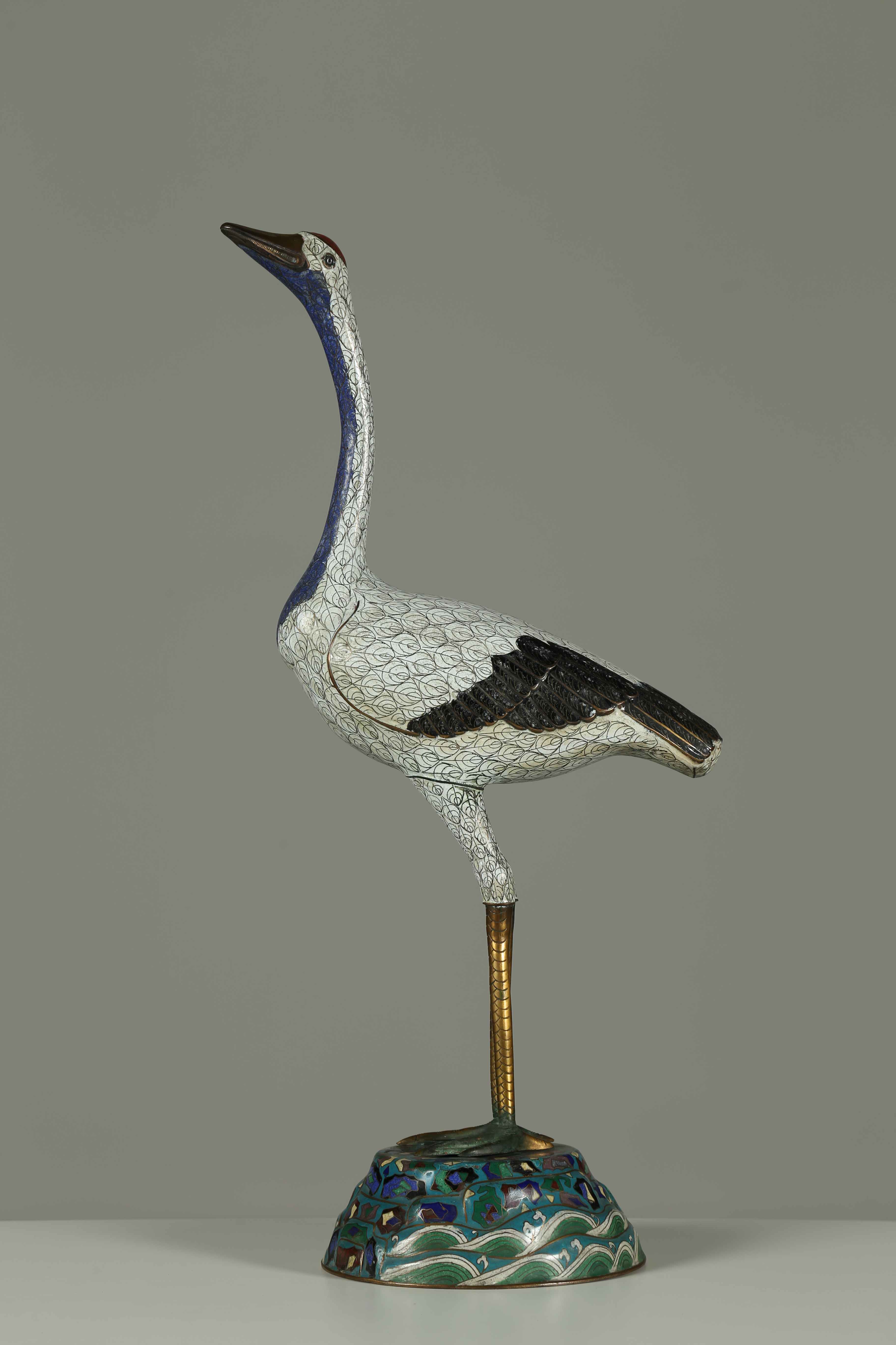 Arte Cinese Cicogna in smalto cloisonné Cina, fine XVIII secolo. -. Cm 34,00 x 71,30. Imponente ed elegante scultura raffigurante una cicogna che posa su base circolare decorata con motivo di rocce ed onde marine. Delicato il piumaggio bicolore. Il becco e le zampe sono a fusione scoperta.