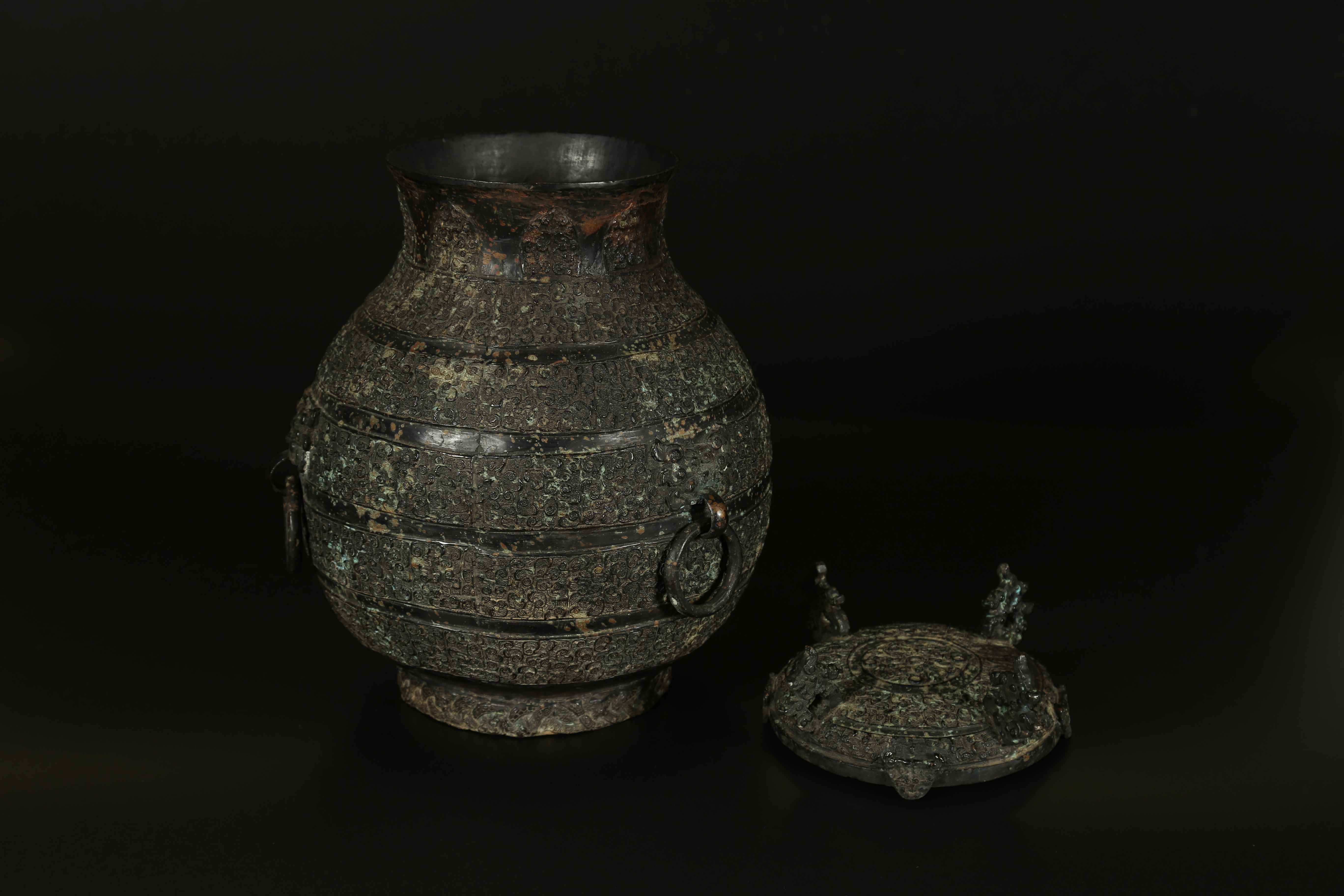 Arte Cinese Imponente vaso in bronzo in stile Stati Combattenti Cina, dinastia Ming, XV secolo. -. . Poggiante su base circolare, il corpo capiente con ampia pancia ed il tappo sul quale si innestano quattro protomi di dragoni. Corpo e tappo sono realizzati con fasce orizzontali contenenti piccoli serpenti, o draghi nuvola, fitti e minuziosamente intrecciati. Tre rilievi arcaici (taotie) reggono degli anelli con funzione di manici.