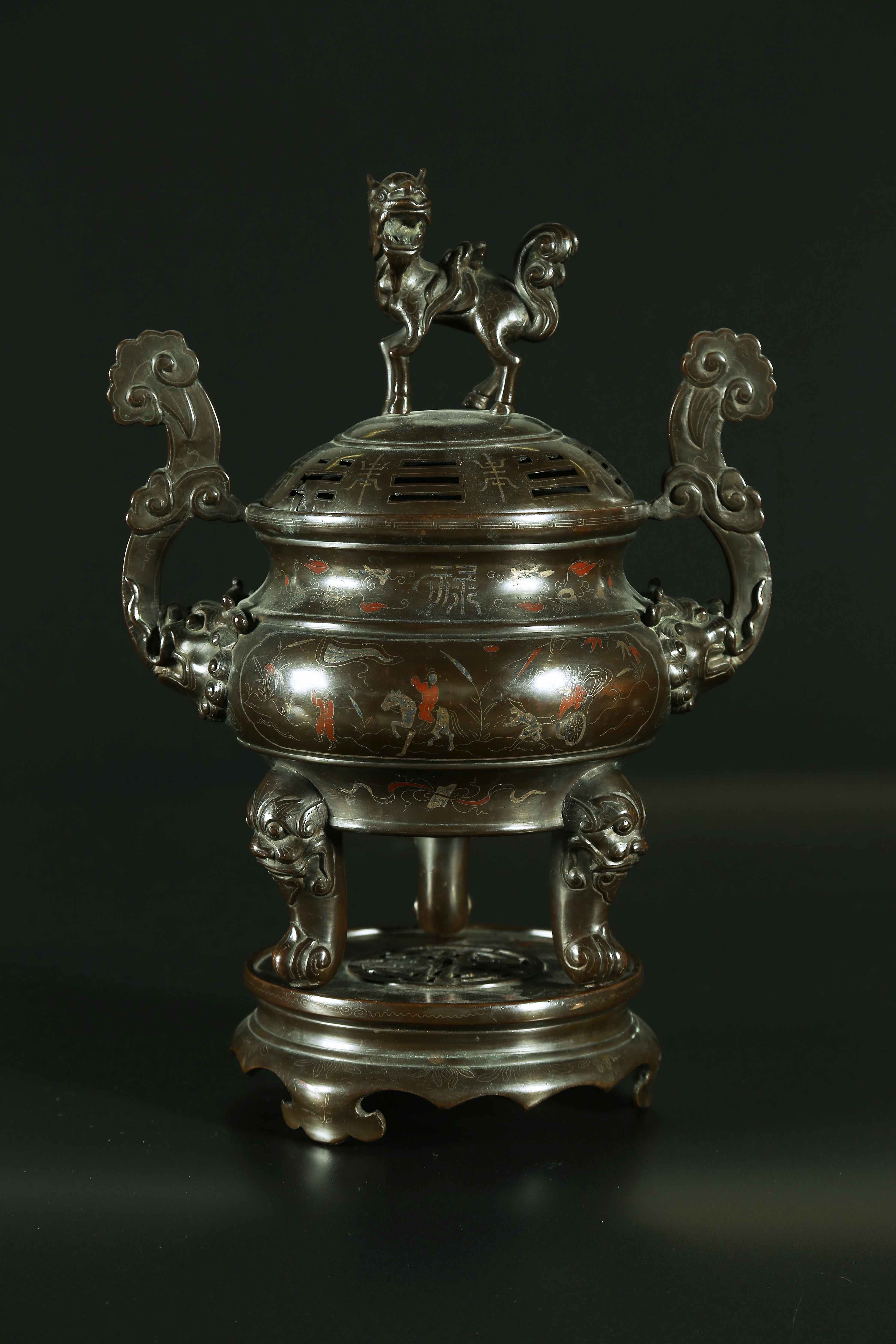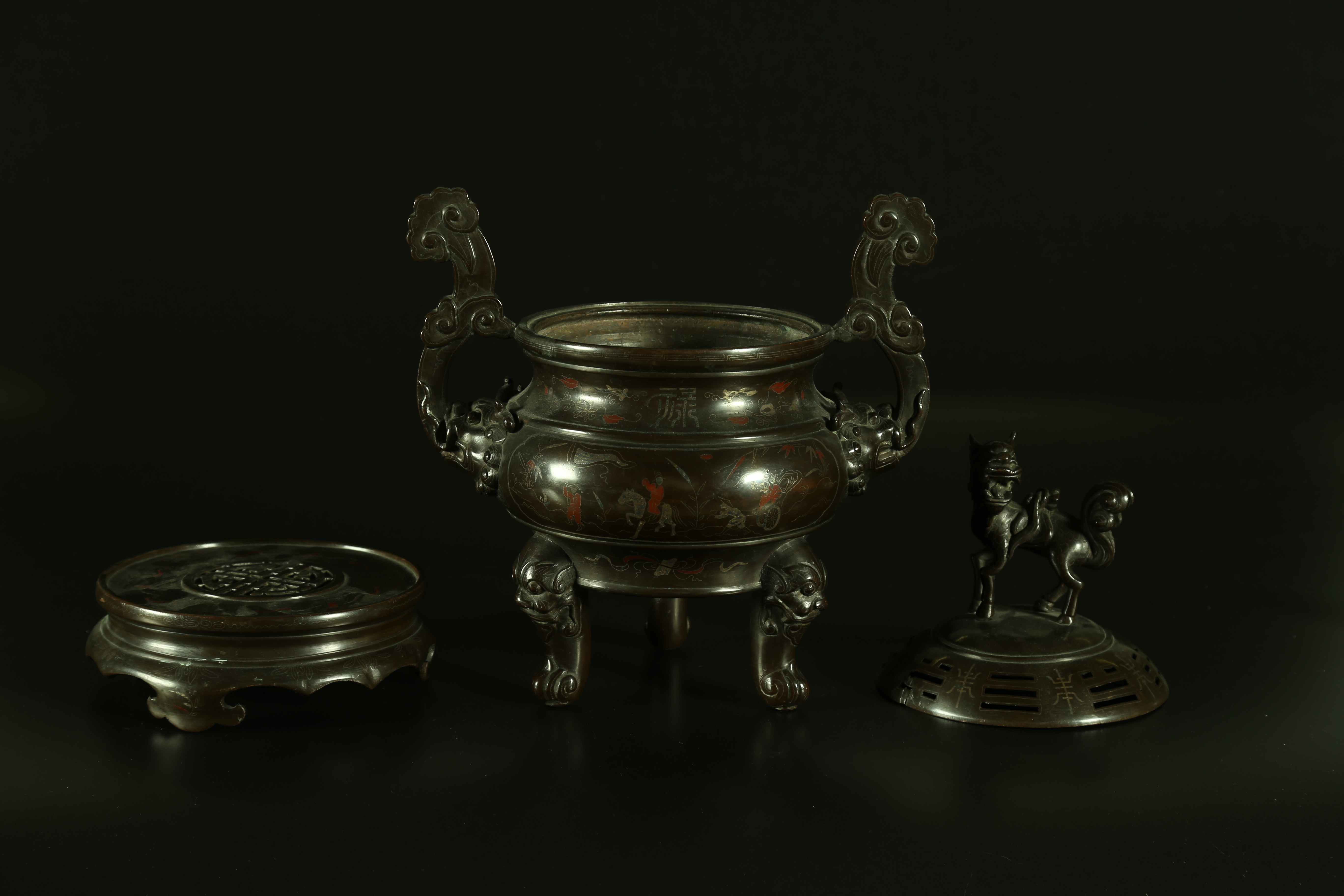 Arte Cinese Incensiere in bronzo con intarsi in argento e rame Cina...