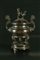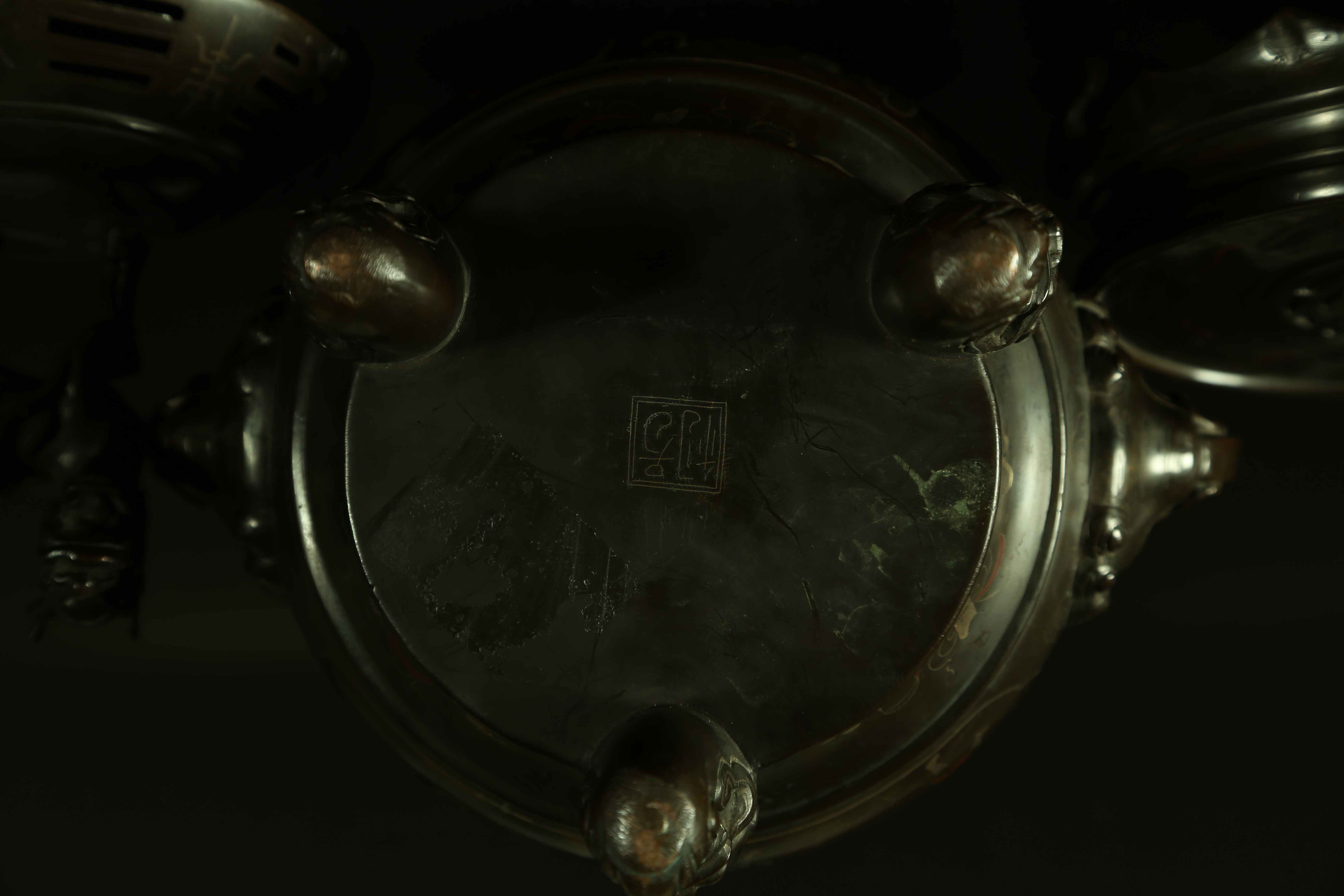 Arte Cinese Incensiere in bronzo con intarsi in argento e rame Cina Meridionale o Vietnam, XIX secolo. -. Cm 29,00 x 41,00. Incensiere tripode con base e coperchio originali. Le gambe mostrano protome zoomorfe ed i manici sono sagomati con draghi e nuvole, mentre gli intarsi sul corpo dell'oggetto sono figurativi entro allungate riserve lobate. Marchio sulla base.