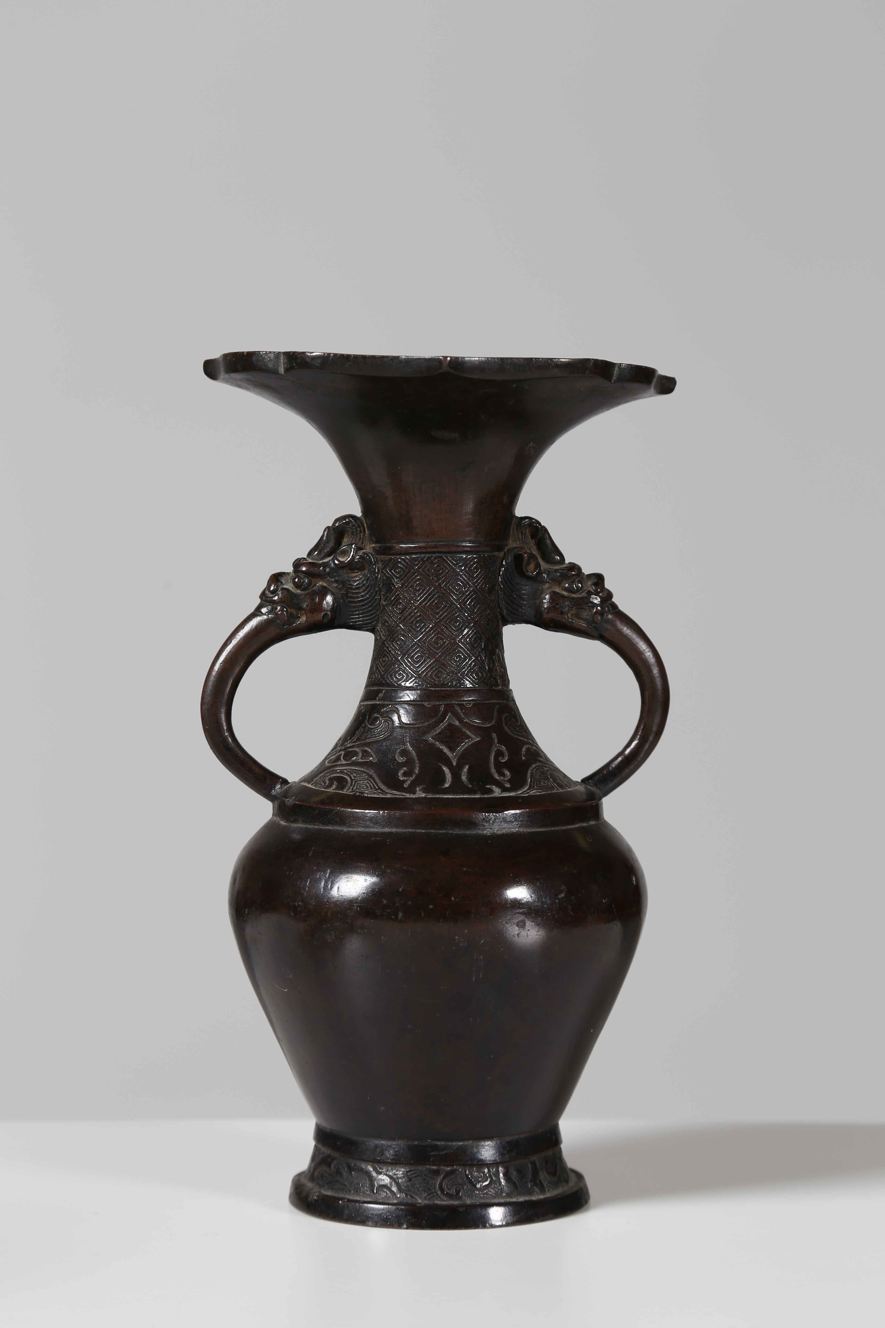 Arte Cinese Vaso in bronzo a patina scura con bocca lobata Cina, dinastia Ming, XVII secolo. . Cm 24,50. Vaso in bronzo poggiante su disco e terminante con bocca svasata e lobata. Sull''attaccatura tra corpo e collo, decorata con motivi arcaici, si innestano due anse che terminano con teste di drago.